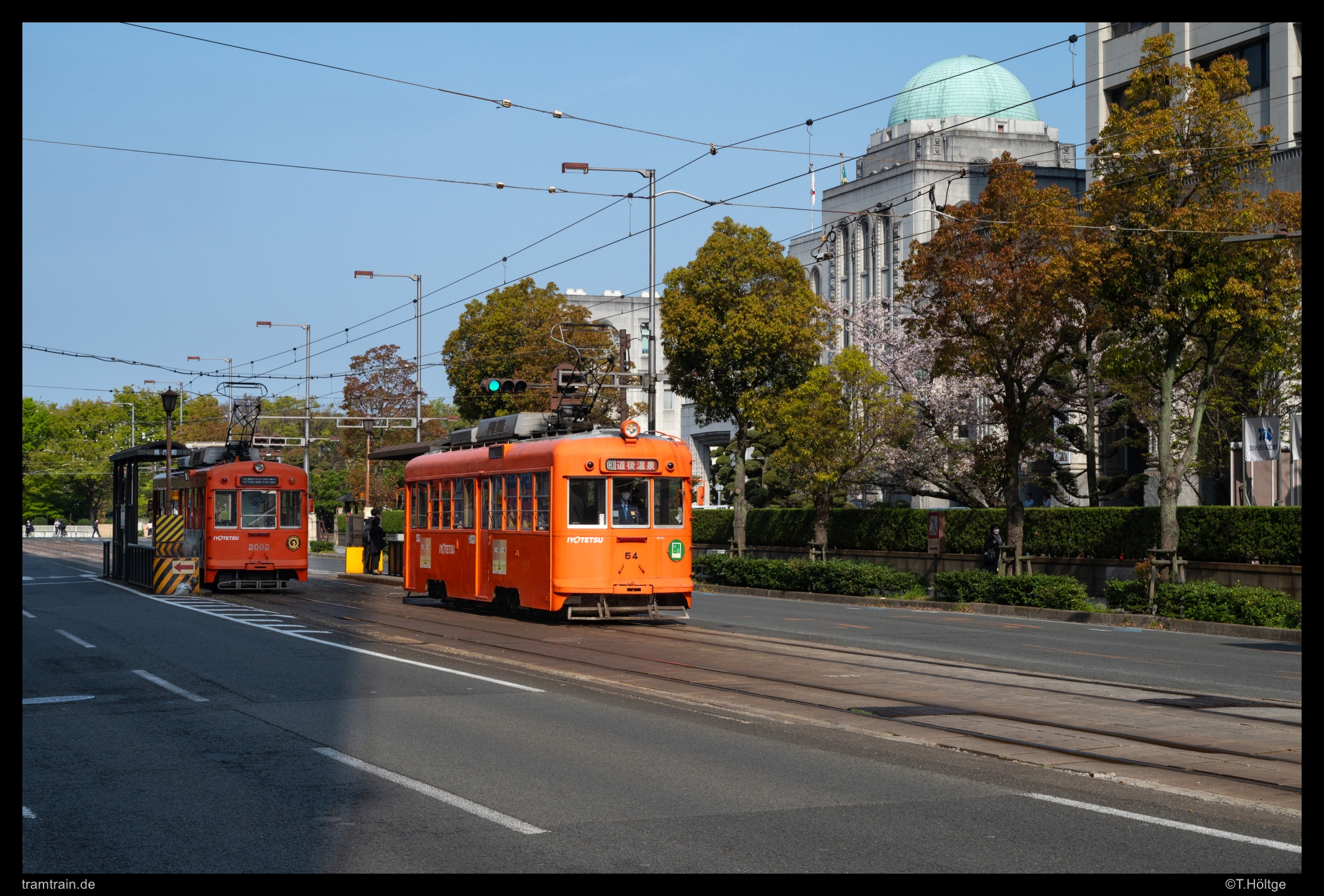Vor der Präfekturverwaltung treffen sich an der Haltestelle Ehime Prefecture Office (20) die Altwagen 54 und 2002 auf den Linien 3 und 1. Mit 2002 dann auch die dritte Altwagenserie von Matsuyama.