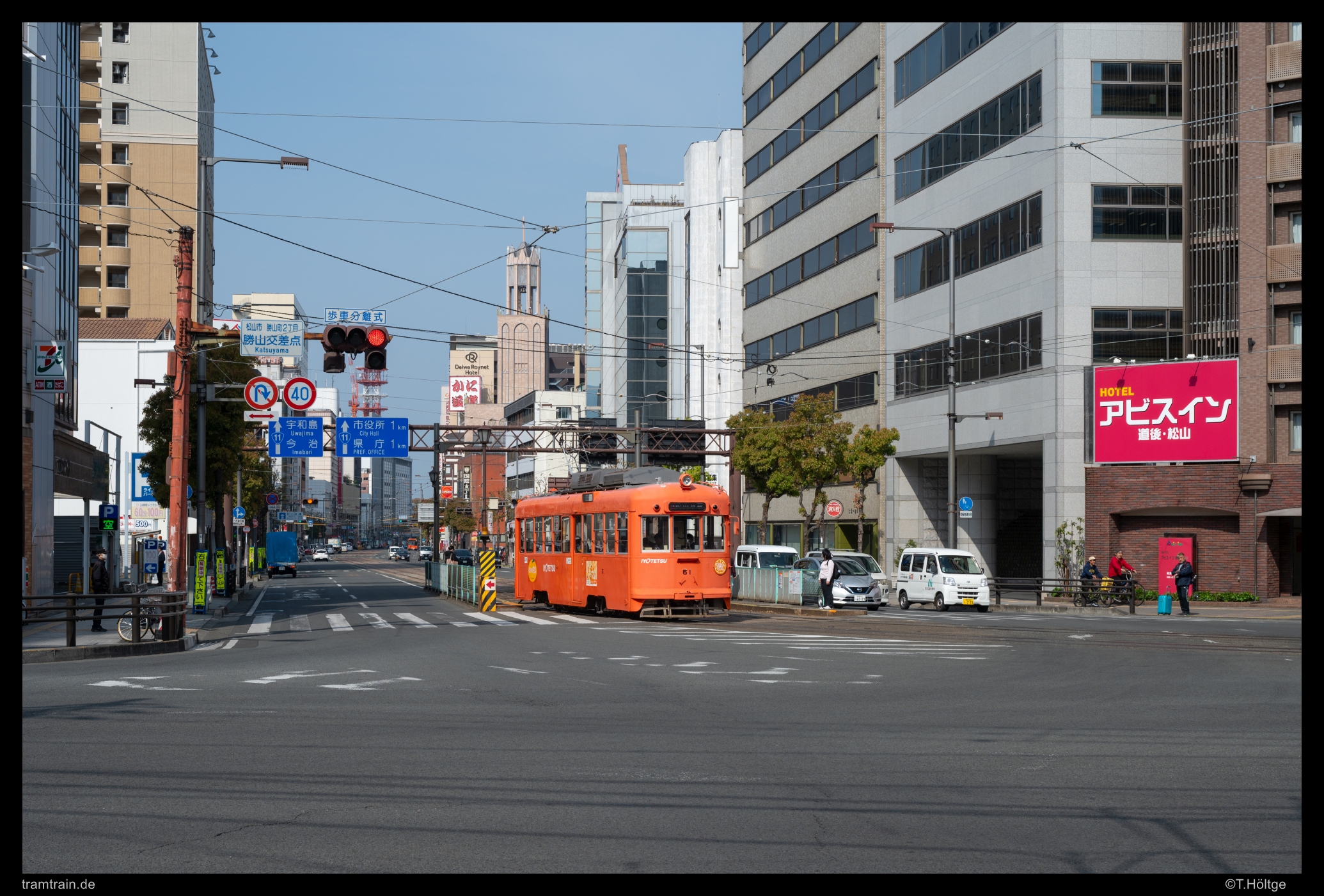 Es hat uns an der Haltestelle Keisatsusho Mae / Police Office (17) wieder an die Straßenbahn gespült, nur eine Haltestelle entfernt vom Abzweig nach Dogo Onsen. Gleich vier MoHa 5000 tummeln sich auf dieser Aufnahme. 5001 als Linie 5, 5007 auf Linie 3 und eine Linie 1 kommen auf uns zu, während eine Linie 2 gerade auf der Loop von uns weg um die Ecke biegt.