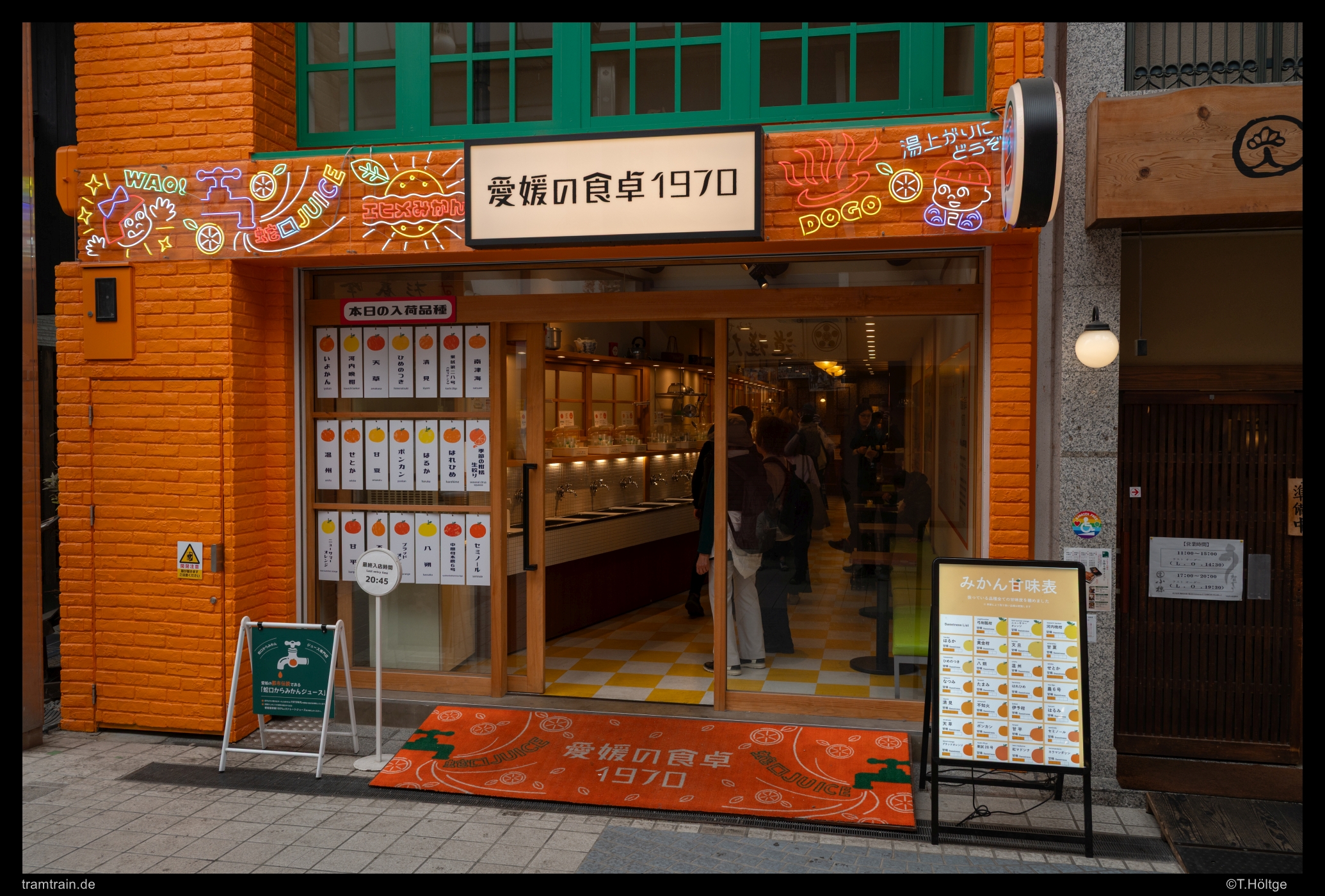 Auf dem Rückweg vom Frühstück gab es in den Shoutengai von Dogo noch eine Reihe Orangenshots aus dem Hahn. Natürlich Touristenkitsch pur, aber die Japaner stehen auf alles was für uns nach Kitsch aussieht und wir gönnten uns den Spaß auch mal.