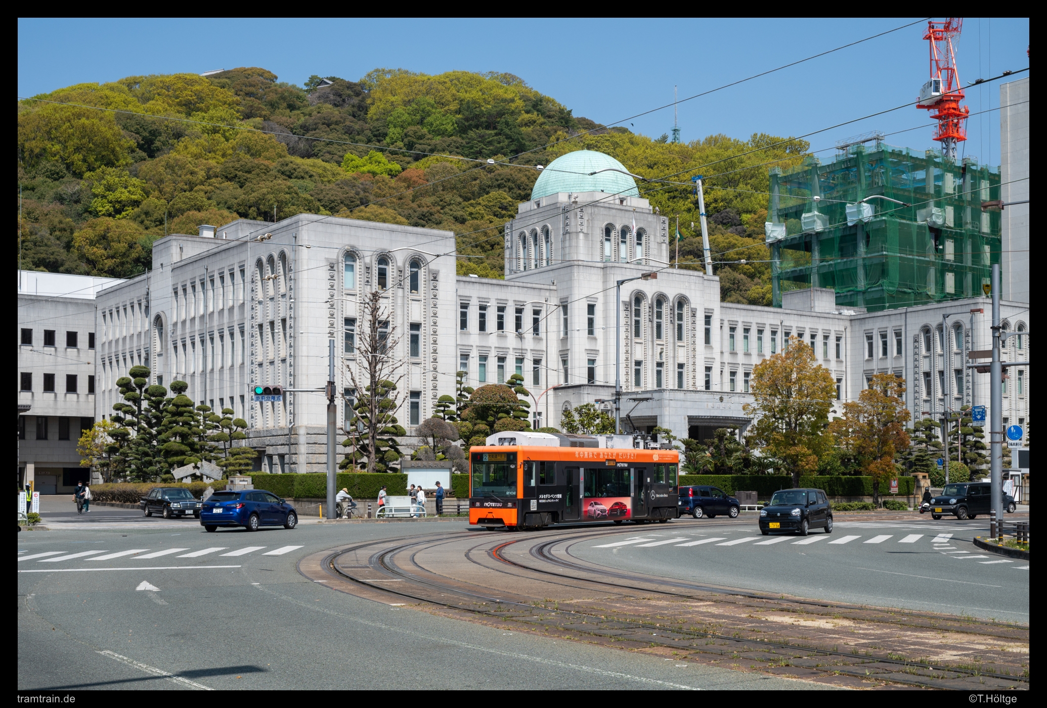 Das Verwaltungsgebäude der Präfektur Ehime vor dem Hügel mit dem Matsuyama Castle war inzwischen perfekt im Licht, sodass hier an der Ecke zwischen den Haltestellen City Hall und Ehime Prefecture Office einige Perspektiven umgesetzt wurden. Mit den vielen Autos durchaus eine Geduldsprobe und ein Fall für Dauerfeuer und hinterher schauen, wo es halbwegs gepasst hat. Wagen 2102 biegt hier vor dem Verwaltungssitz zur danach benannten Haltestelle ab.