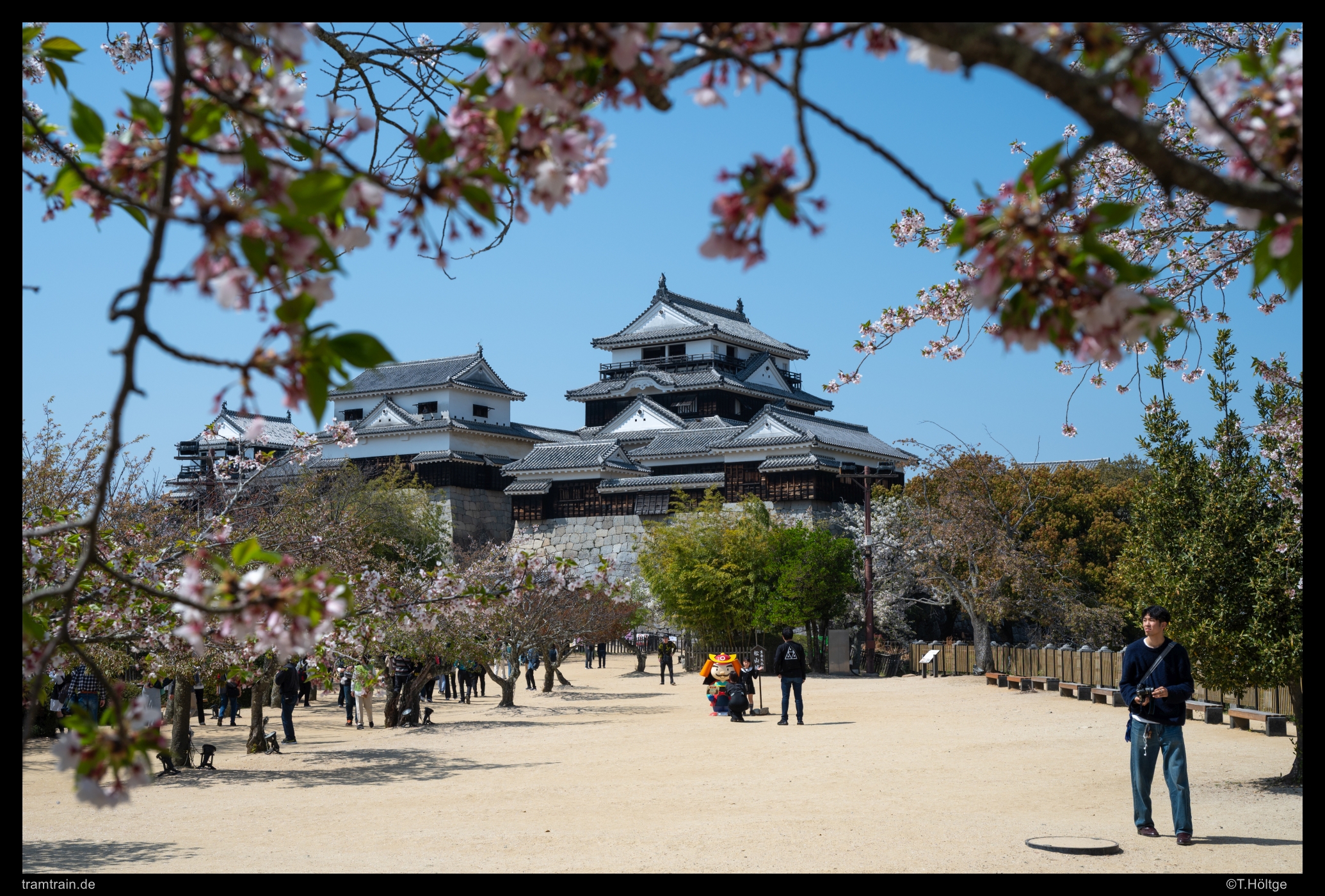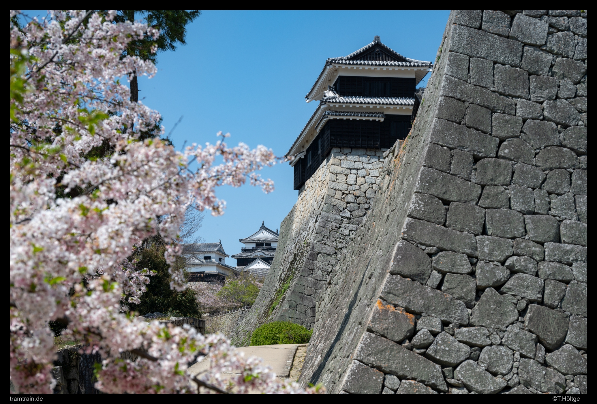 Zeit genug also, noch ein wenig “Kultur” einzubauen, sodass wir beschlossen, das kurze Stück zum Matsuyama Castle hinauf zu laufen. Auf die Seilbahn kann man gut verzichten. Der Hügel sieht gewaltiger aus, als er ist und so waren es kaum 60 Höhenmeter und nur eine knappe Viertelstunde Fußweg durch den angenehm schattigen Wald bis hinauf zur Burg. Und der Besuch sollte sich wirklich lohnen, war die Kirschblüte hier doch gerade so prächtig wie nur möglich und bot zusammen mit den verschiedenen Bauten und Mauern der Burganlage eine tolle Kulisse. Auch der Blick durch die Kirschblüten hinab auf die Häuserwüste von Matsuyama war nicht zu verachten. Es war zwar einiges an Inlandstourismus los, hielt sich aber doch in angenehmen Grenzen, bedenkt man, dass jetzt quasi Hochsaison ist. Europäische oder Nordamerikanische Gesichter sah man nur sehr vereinzelt.