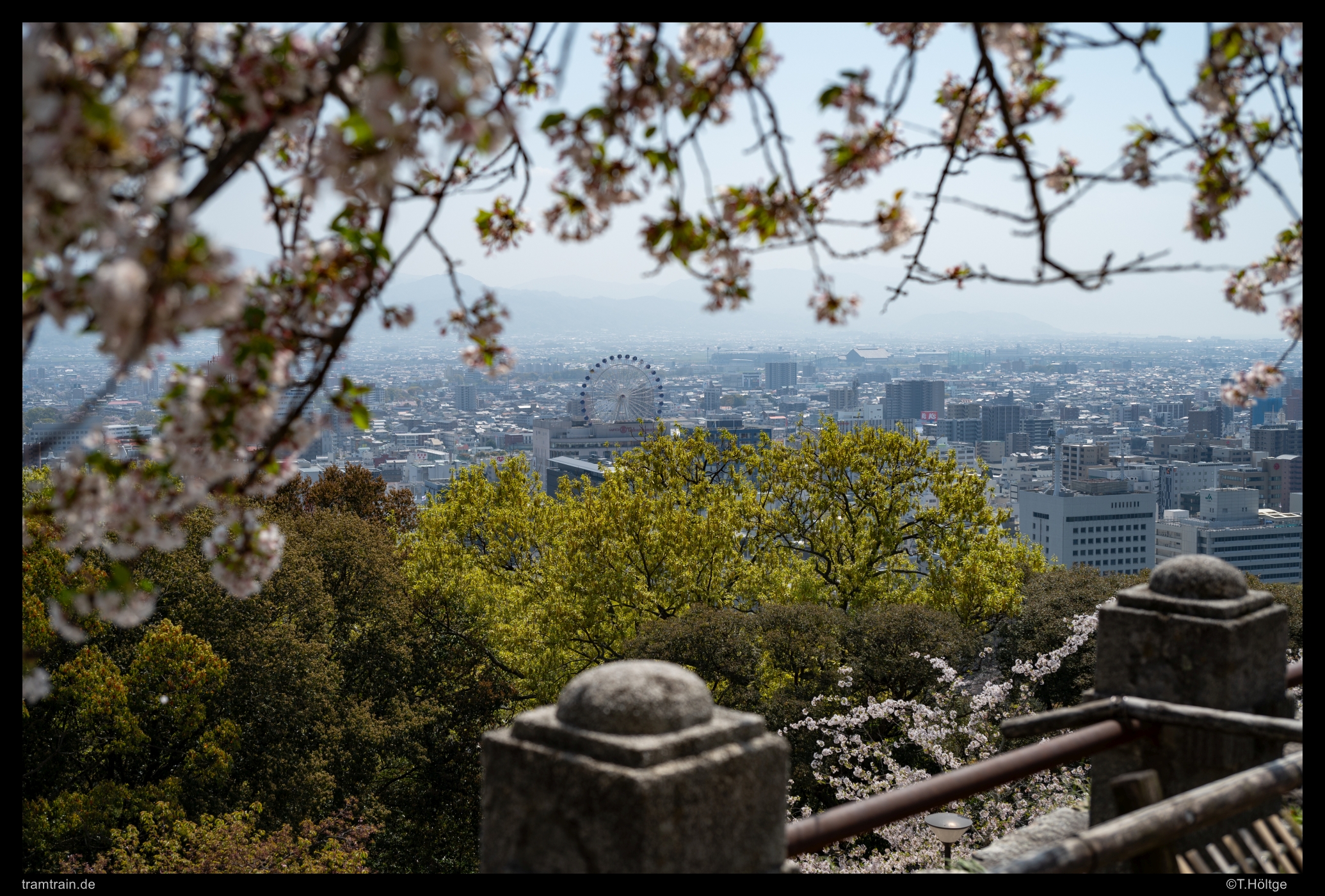 Blick hinab auf das Häusermeer von Matsuyama. Es wäre keine japanische Großstadt, wenn nicht irgendwo ein Riesenrad stünde.
