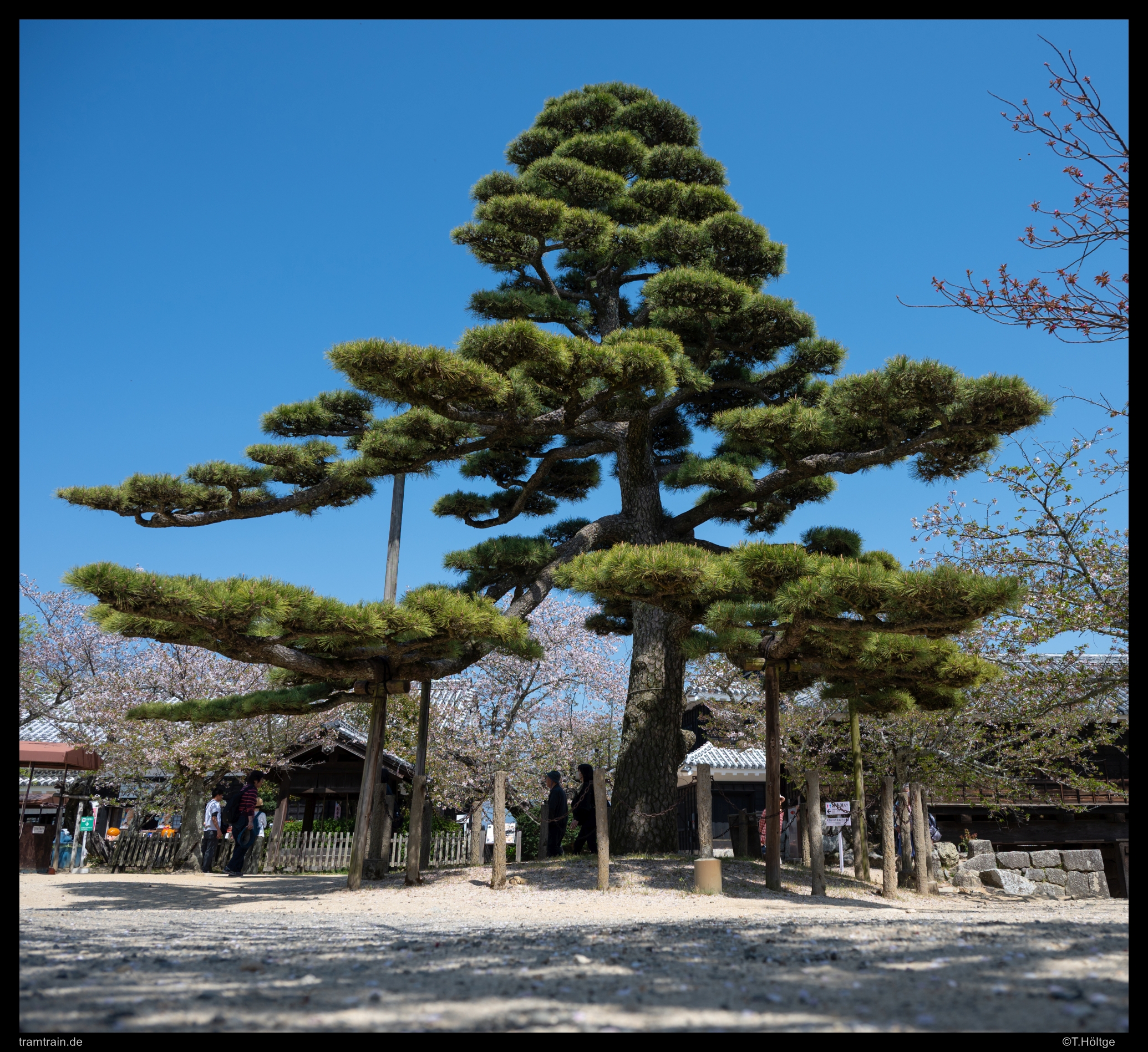 Ein Baum wie ein Kunstwerk im Shiroyama Park vor dem eigentlichen Haupteingang des Castles.