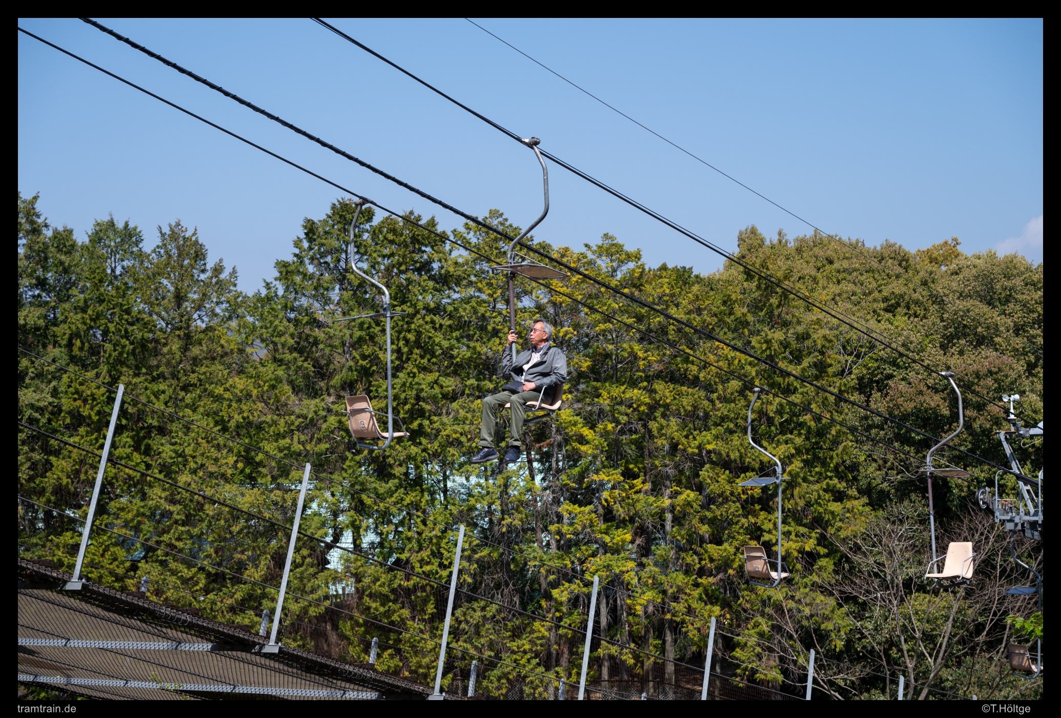 Wir wählten nun einen östlichen Abgang von dem Berg des Castles, der uns an der Haltestelle Keisatsusho-Mae rausbringen sollte und damit direkt am Weg zum Dogo Onsen. Dabei kreuzten wir auch die Seilbahn, die aktuell aber außer Betrieb schien. Daneben war allerdings ein Sessellift, der wie so manche Relikte bei den Straßenbahnen vollkommen aus der Zeit gefallen wirkte. Das waren einfach völlig ungesicherte, vergilbte offene Einzelsitze an einer Stange, die gleichzeitig dem Festhalten diente. Das Ganze auch unglaublich langsam, sodass man mindestens bergab das Tempo locker hätte halten können. Mit in der Luft baumelnden Füßen, eine Hand neben sich an der Haltestange, ließ sich ein älterer Herr so seelenruhig zum Castle hinaufbefördern. War der echt, oder eine Wachsfigur. Einfach eine geniale Szenerie 😀