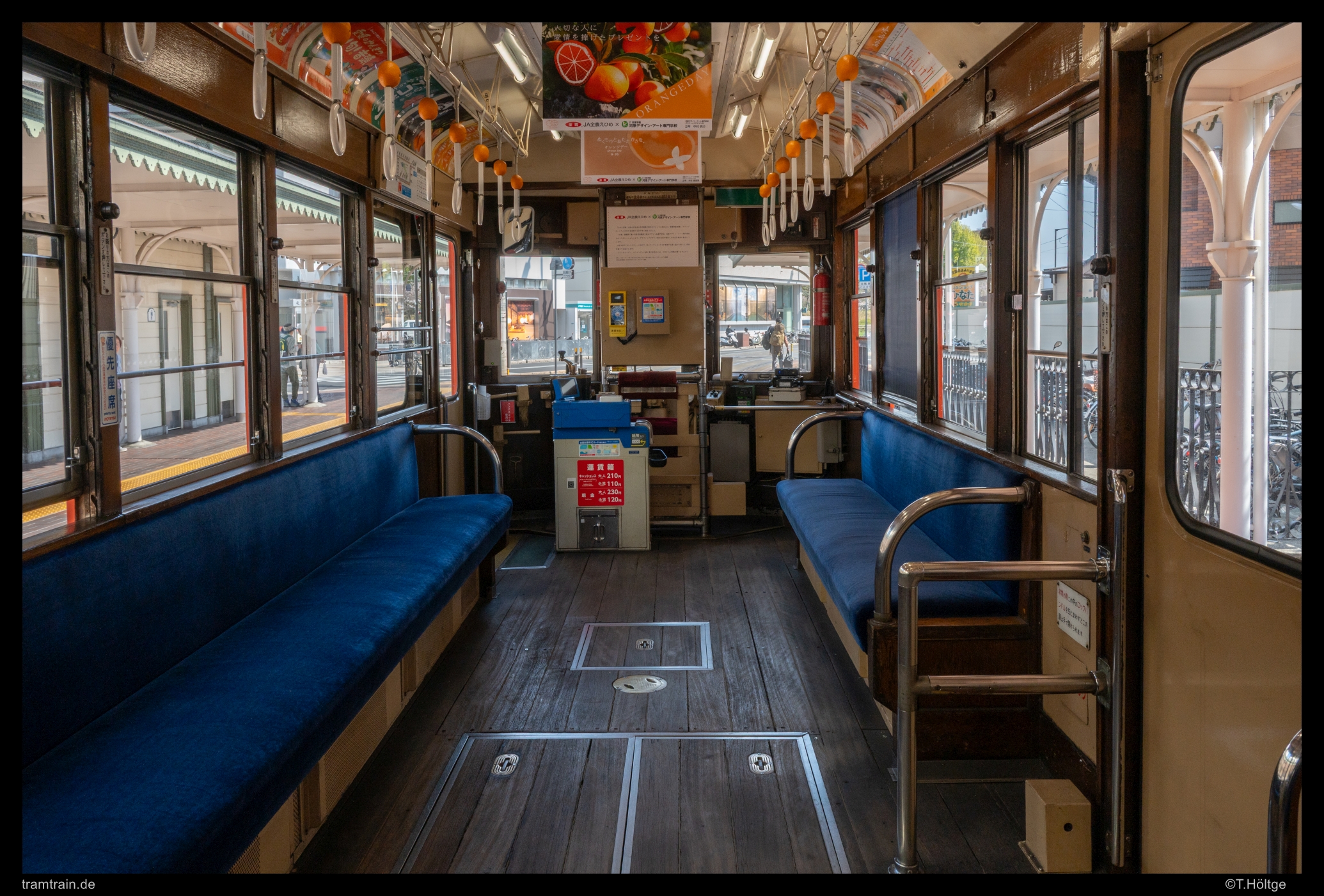 Die vielen Besucher nach Dogo Onsen haben den Wagen an der Endstation fast verlassen. Bei der bekannt langsamen Prozedur bleibt aber genug Zeit, sich ganz ans Ende der Austeigerschlange zu stellen und einen Blick zurück in den Wagen zu werfen. Mit noch holzbeplanktem Fußboden und abgesehen vom Fahrkartenautomat hinter dem Fahrerstand kaum Anzeichen der Moderne, war dies einer der ursprünglichsten Wagen, mit denen wir in Japan gefahren sind. Der Erhaltungszustand war dabei durchaus bemerkenswert, da gab es bei den Fahrzeugen aus den 50ern bei anderen Betrieben auch durchaus mal recht heruntergerockte Exemplare – ohne (Negativ)beispiele nennen zu wollen… *hust* Toyama, Takaoka *hust*