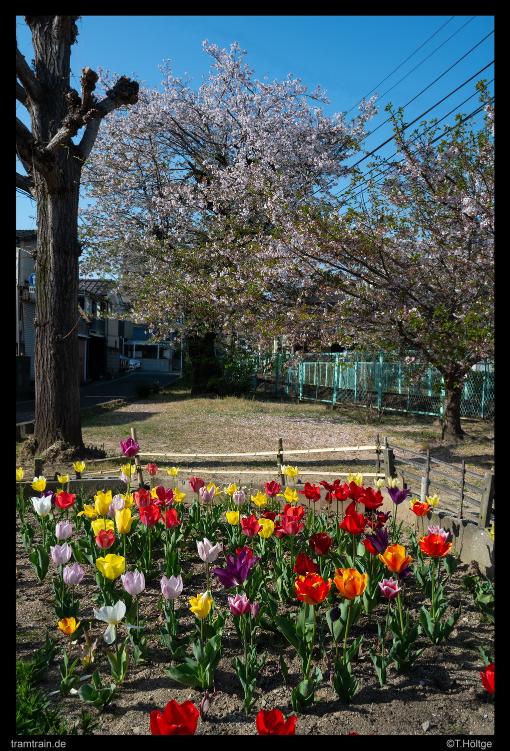 Wir genehmigten uns im Anschluss an das Nachmittagsessen und einen kurzen Getränkestopp in der Lawson Station eine Einzelfahrt bis zurück zum Abzweig von der Loop-Line. Zwar nicht wirklich weit und mit der Bahn mitten auf der Straße wiedermal kaum schneller, aber das Stück war doch recht zäh zu laufen gewesen am Morgen. Anschließend liefen wir fast die Hälfte des eingleisigen Nordostbogens der Loop zu Fuß ab, bis zur Haltestelle Hommachi 6 (29), an der die Linie 6 ohne Gleisverbindung orthogonal zur Loop-Line endet. Die Loop selbst ist in diesem Abschnitt auf eigenem Bahnkörper mit Schrankenanlagen trassiert und kommt dadurch ungewohnt schnell voran, muss durch den dichten Takt der gegenläufigen Ringlinien an den Kreuzungen aber oft auf die Gegenbahn warten, da ein sauberer Takt durch die Straßenabschnitte auf der anderen Hälfte der Loop nur selten zustande kommt. Insgesamt bot die Strecke mit der eigenen Trasse neben kleinen Sträßchen und durchmischter Bebauung aber eine willkommene Abwechslung zum sonstigen Verlauf auf den breiten Straßen und Bulevards. Hier durch die beschaulichen Nebenstraßen durch das Alltagsleben der gemütlichen Wohnviertel zu streifen, war wirklich super.