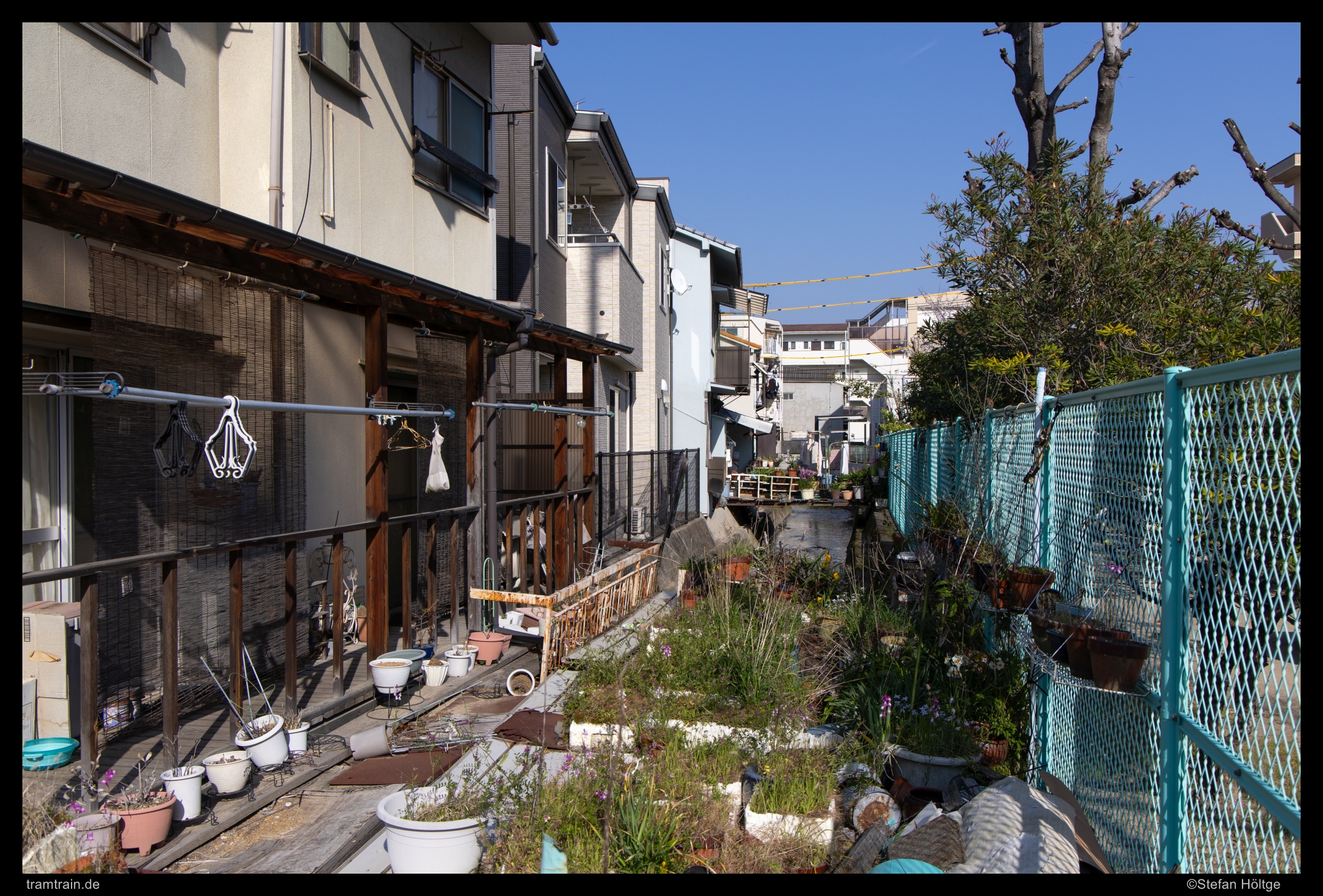 Wir laufen gegen den Uhrzeigersinn entlang der Nordseite der Loop-Line und befinden uns kurz hinter der ersten Haltestelle nach dem Abzweig Heiwadori 1 (15). Hier geht es wiedermal eng zu und die Linie sucht sich ihren Weg durch die etwas wilde Bebauung.
