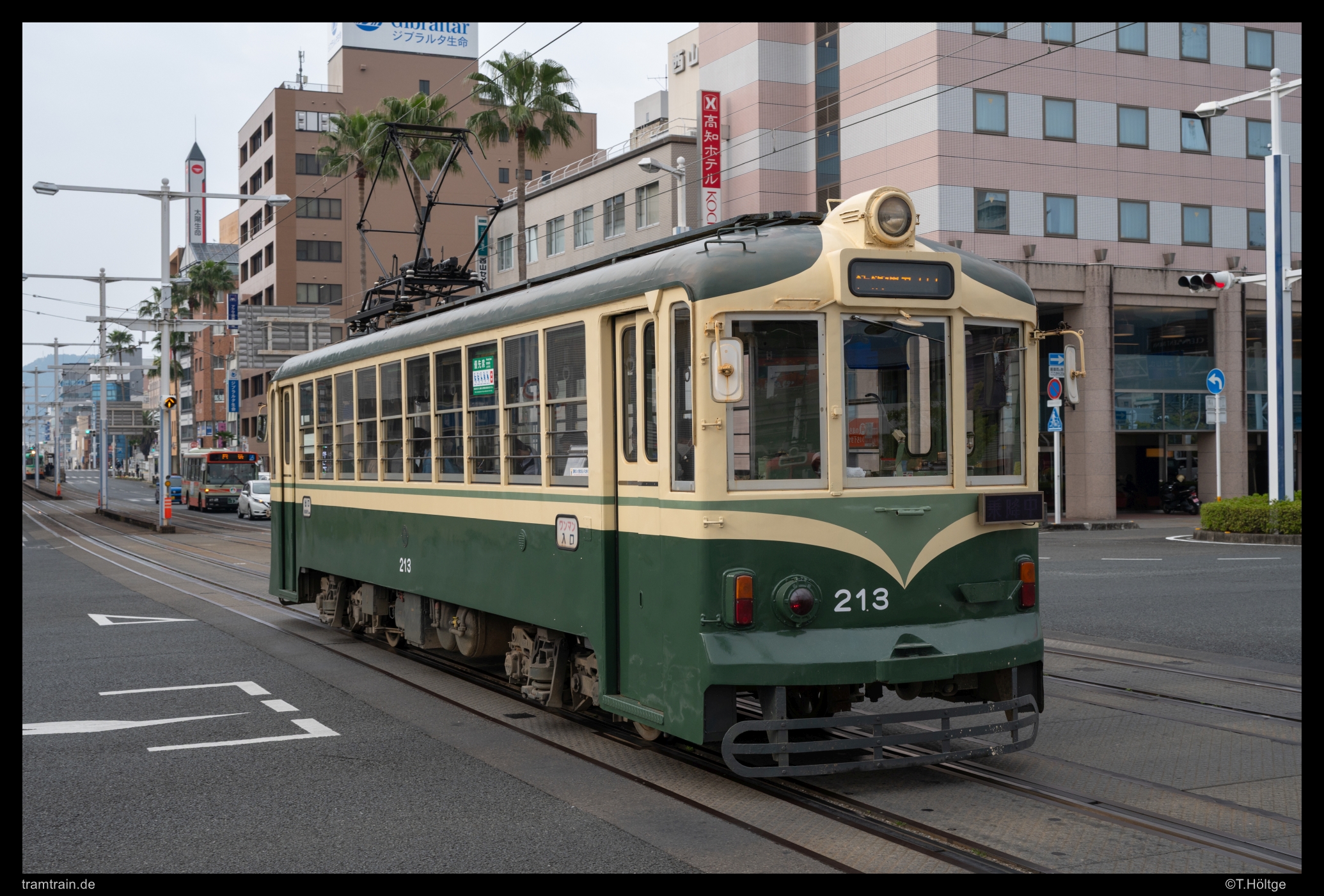 Wagen 213 wurde 1954 ebenfalls wieder bei Hitachi gebaut, weißt allerdings am Wagenkasten einige Unterschiede zum 201 auf: Zum einen wurde der Wagen nicht auf das größere mittlere Stirnfenster umgebaut, und auch die Seitenfenster scheinen noch in einem originaleren Zustand zu befinden. Auffällig auch das bei diesem Wagen integrierte Frontlicht. Zur Lackierung von 213 findet sich in der japanischen Wikipedia der Hinweis “One-man painting”, was zur Einführung des schaffnerlosen Betriebes die bereits umgestellten Fahrzeuge auswies.