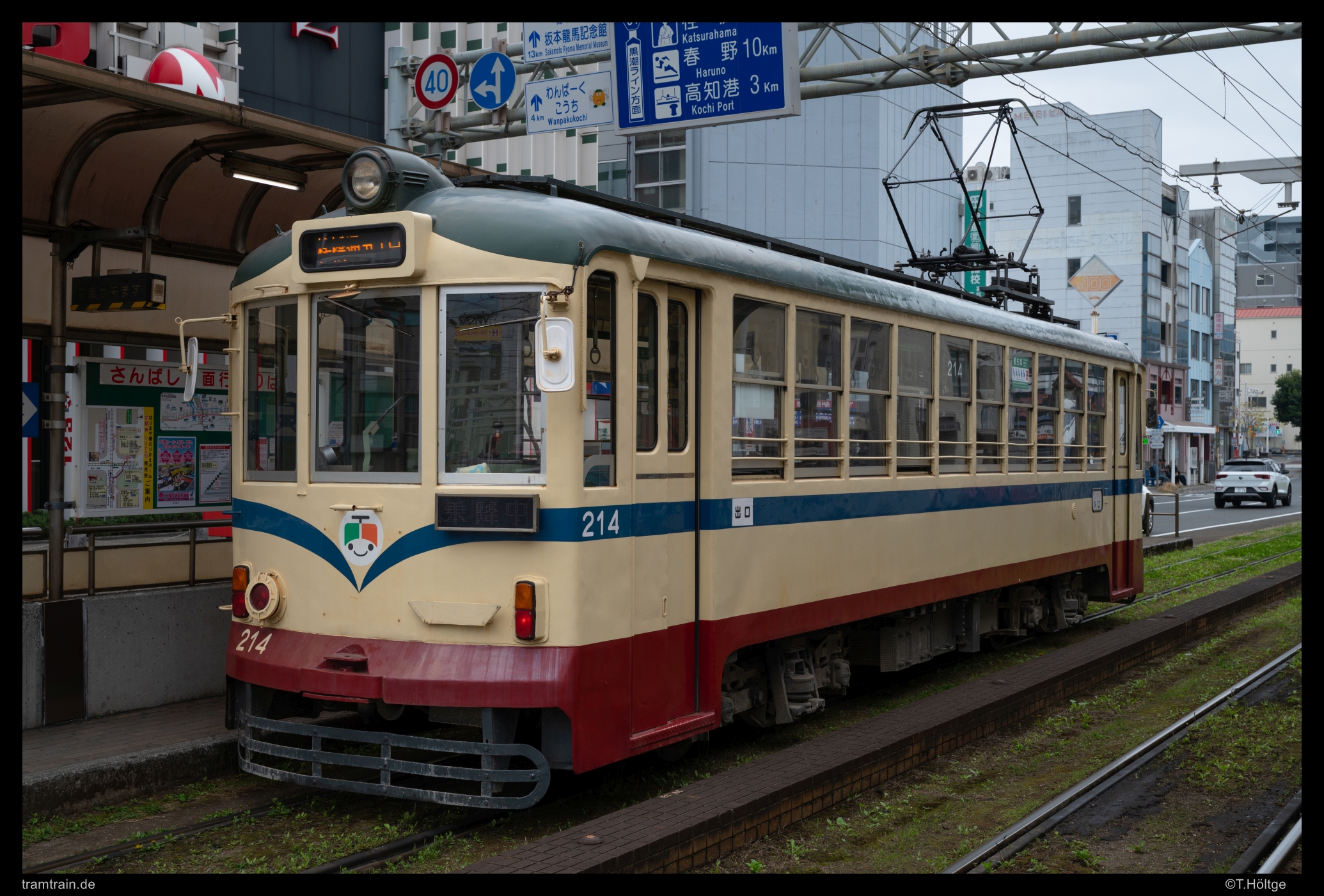 Wagen 214 stammt aus derselben 1954er-Charge wie 213 und weißt auch heute keine offensichtlichen Unterschiede auf. Auffällig bei beiden Wagen das Fehlen einer Klimaanlage. 214 trägt noch die alte Lackierung der Tosa Denki Tetsudo, die durch die Übernahme der Straßenbahn durch die öffentliche Hand im Jahr 2014 in der heutigen Tosaden Kotsu aufging.