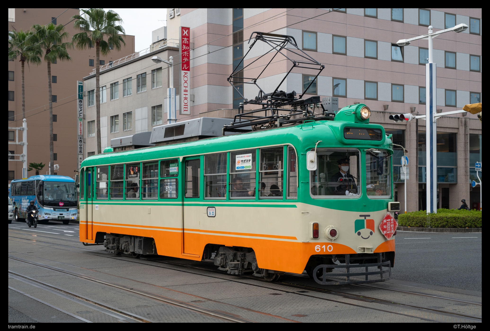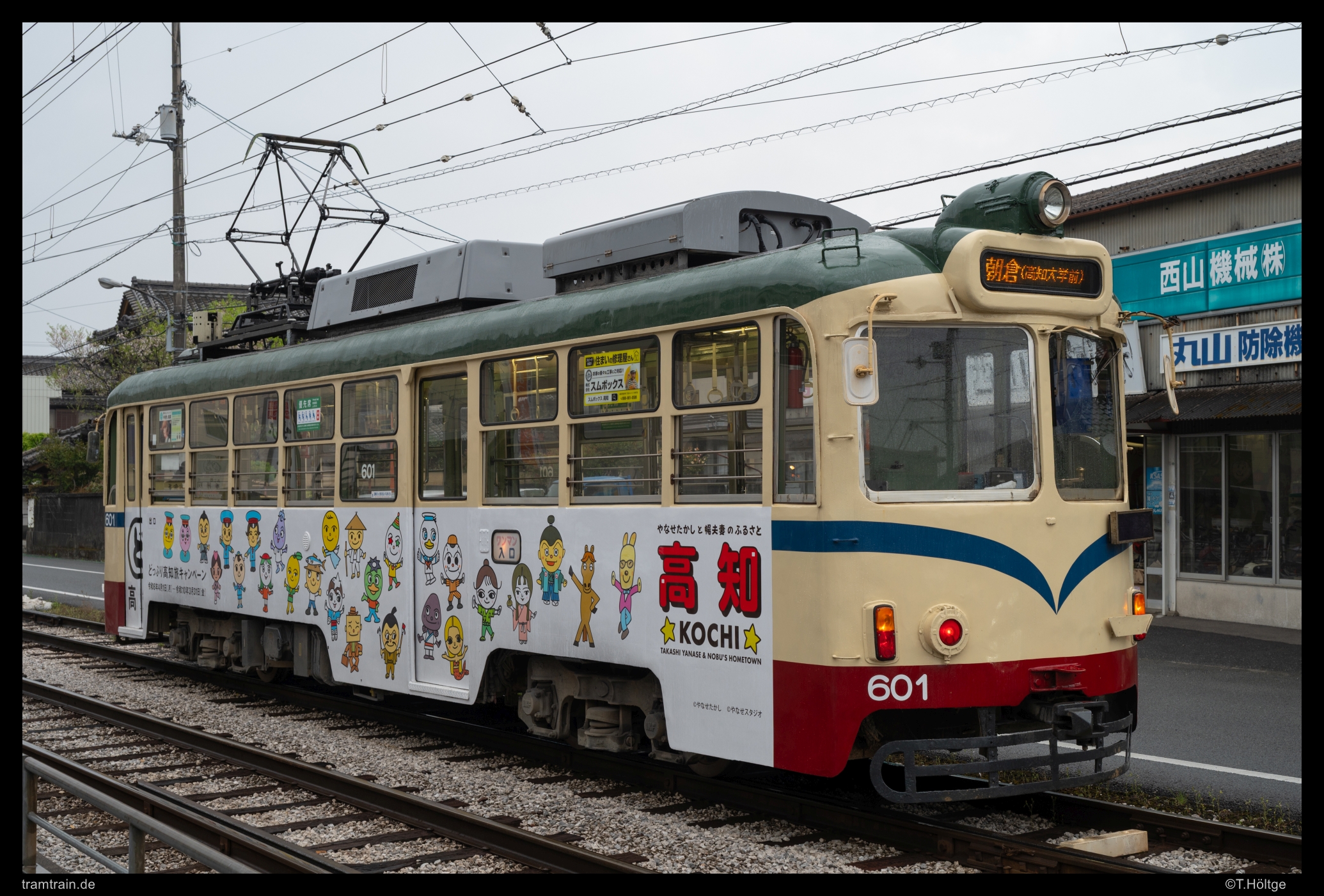 Die Fahrzeuge der 600er-Serie stammen aus den Jahren 1957 bis 1964. Insgesamt entstanden 31 Fahrzeuge bei Naniwa und teilweise in eigener Werkstatt bei der Tosa Denki Tetsudo. Charakteristisch ist die zweigeteilte Frontscheibe, die die leicht spitz zulaufende Front unterstreicht. Die Fahrzeuge sind äußerlich weitgehend identisch und stechen heute durch ihre vielen bunten Gestaltungen hervor. Die Serie scheint sich noch weitgehend vollständig im Einsatzbestand zu befinden und stellt damit einen beträchtlichen Teil des Fahrzeugauslaufs. Wir trafen nicht weniger als 24 Fahrzeuge der Serie in den zwei Tagen unseres Besuches an.