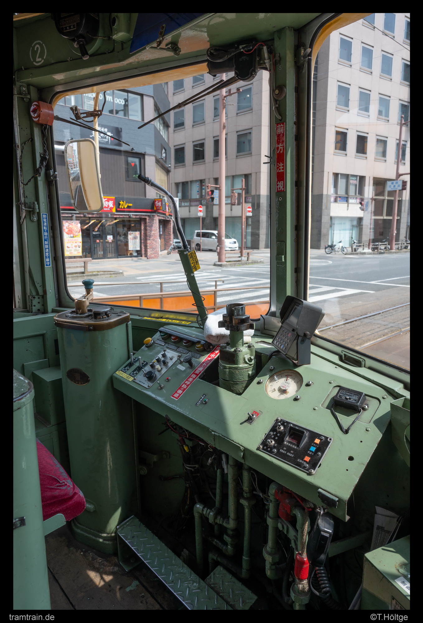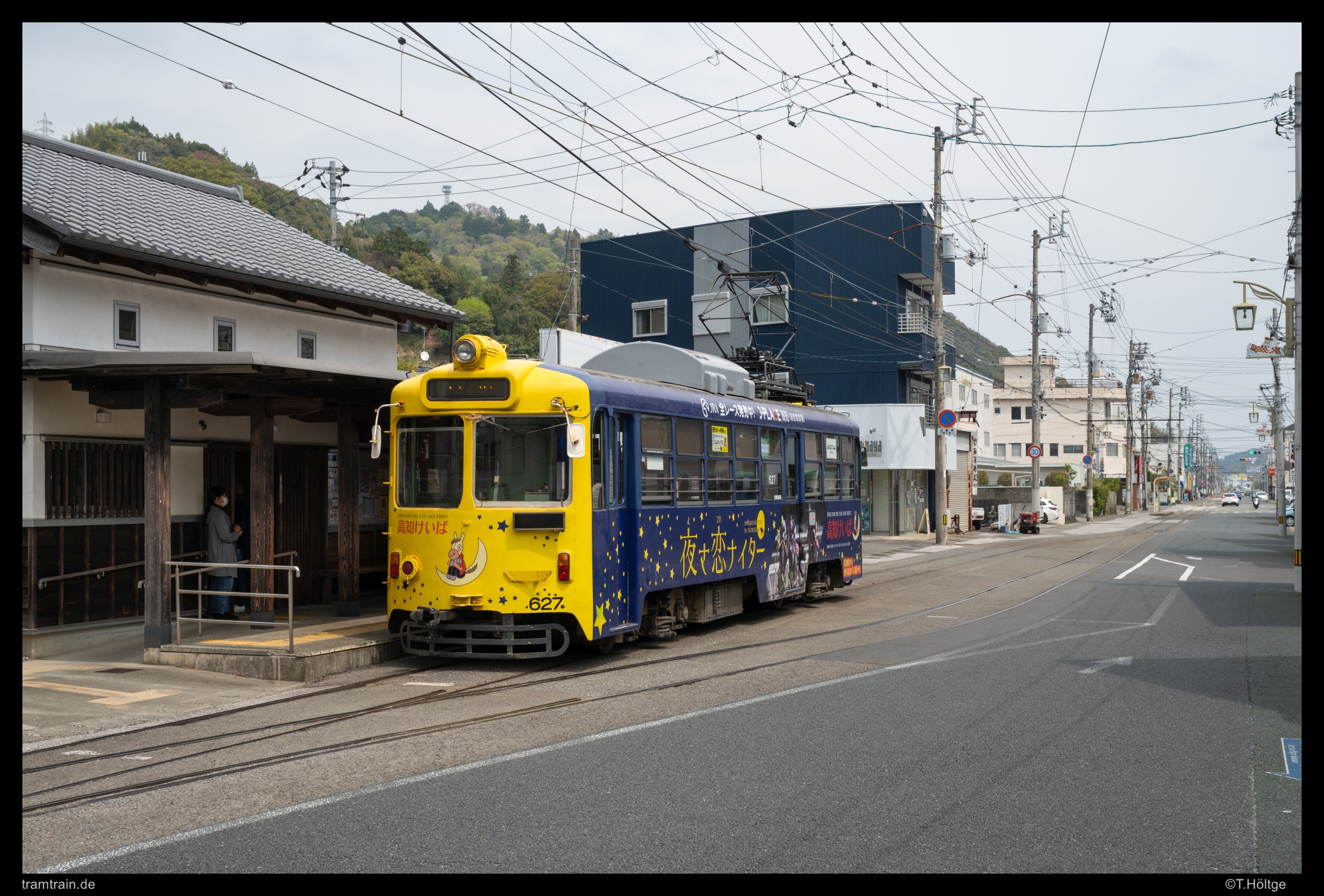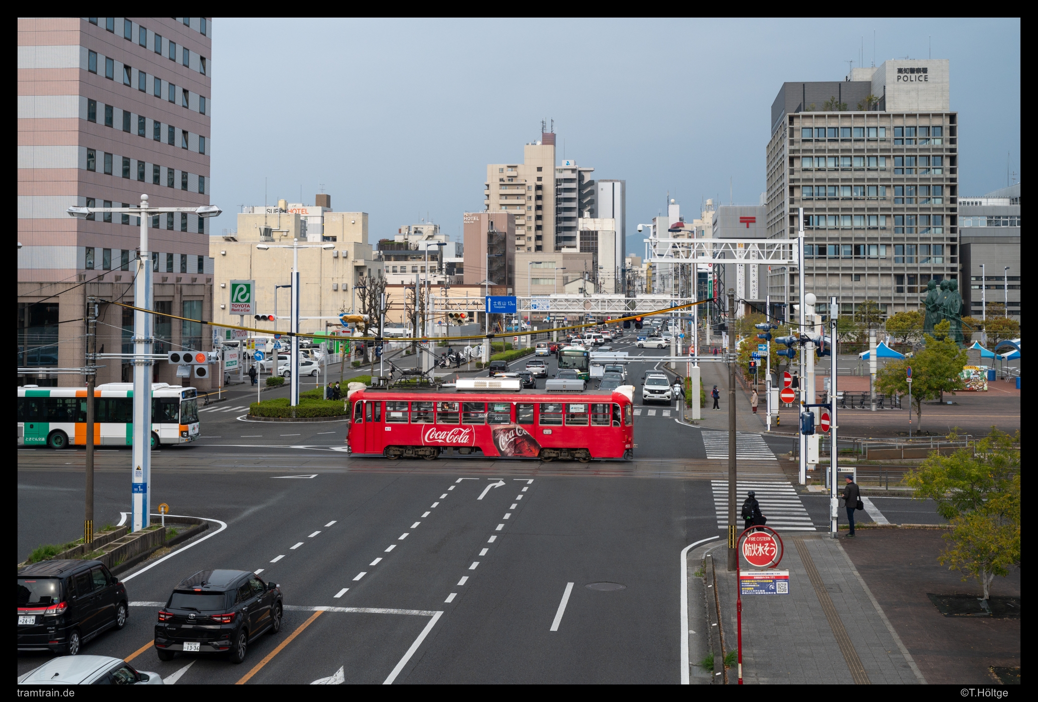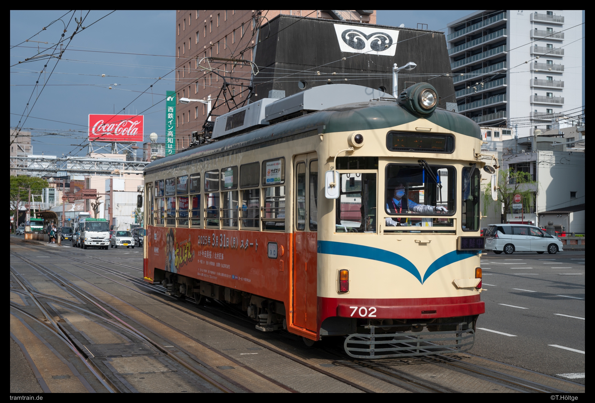Wagen 702 (ex Shimonoseki) am 11. April 2025 auf der zentralen Kreuzung Harimayabashi.