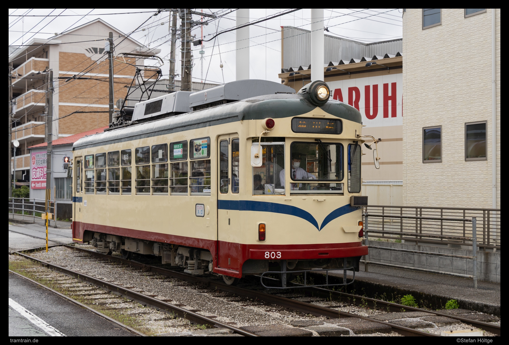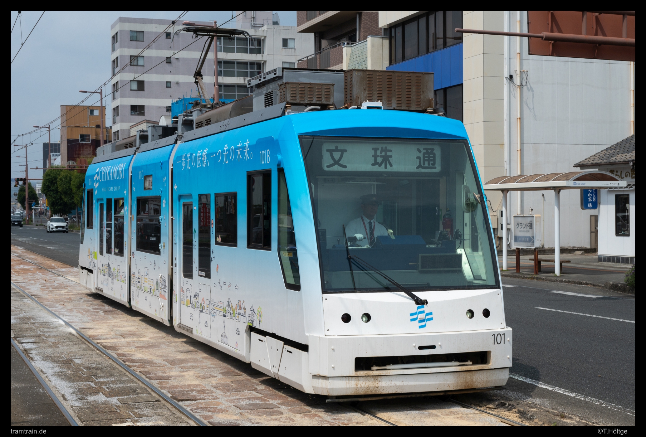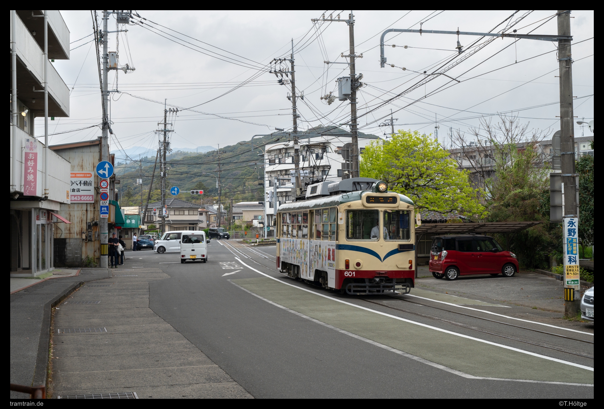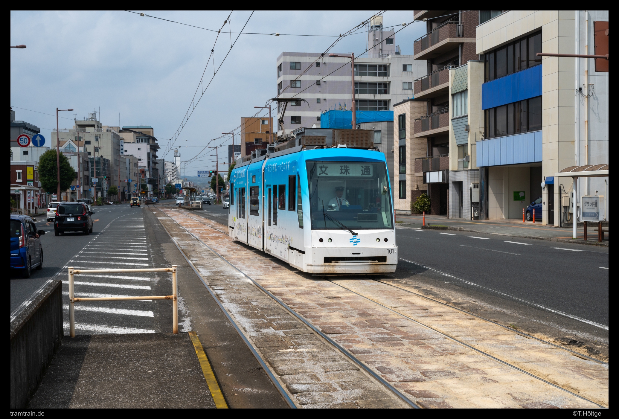 Im Kernbereich ist die Straßenbahn seit dem Wiederaufbau nach dem 2. Weltkrieg trassiert, wie man es aus den meisten japanischen Städten kennt: Zweigleisig auf eigener Trasse inmitten von vier bis sechs Autospuren. Eine unabhängige Signalisierung besteht auch hier nicht, sodass die Reisegeschwindigkeit sehr zu wünschen übrig lässt – vom östlichen zum westlichen Streckenende ist man weit über eine Stunde unterwegs. Außerhalb der wiederaufgebauten Kernstadt wandelt sich die Strecke hin zur teils klassischen Überlandstraßenbahn in eingleisiger Seitenlage mit engen Ortsdurchfahrten teils auf der Straße.