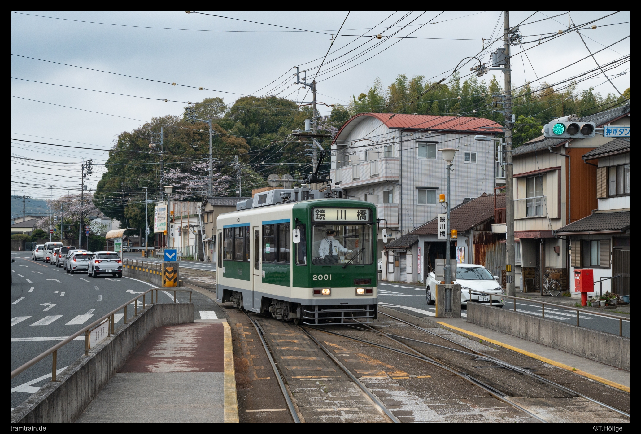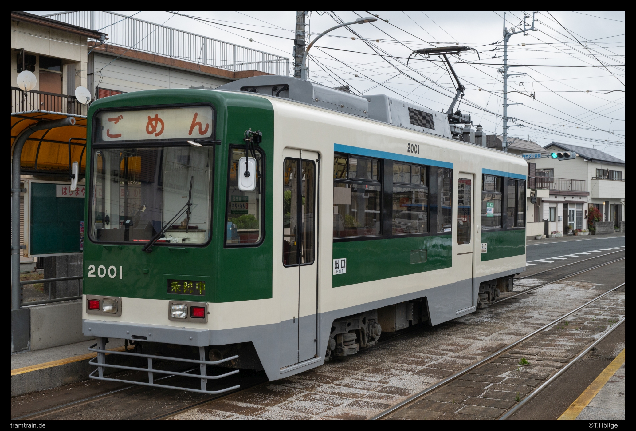 Drei Fahrzeuge der Type 2000 stehen in Kōchi im Einsatz. Mit Baujahren 2000 und 2004 waren die Fahrzeuge von Anfang an ihrer Zeit weit hinterher, die elektrische Ausrüstung wurde gar von Fahrzeugen aus den 50er-Jahren übernommen. Wagen 2001 wendet hier am 10. April 2025 an der Zwischenstation Kagamigawababashi.