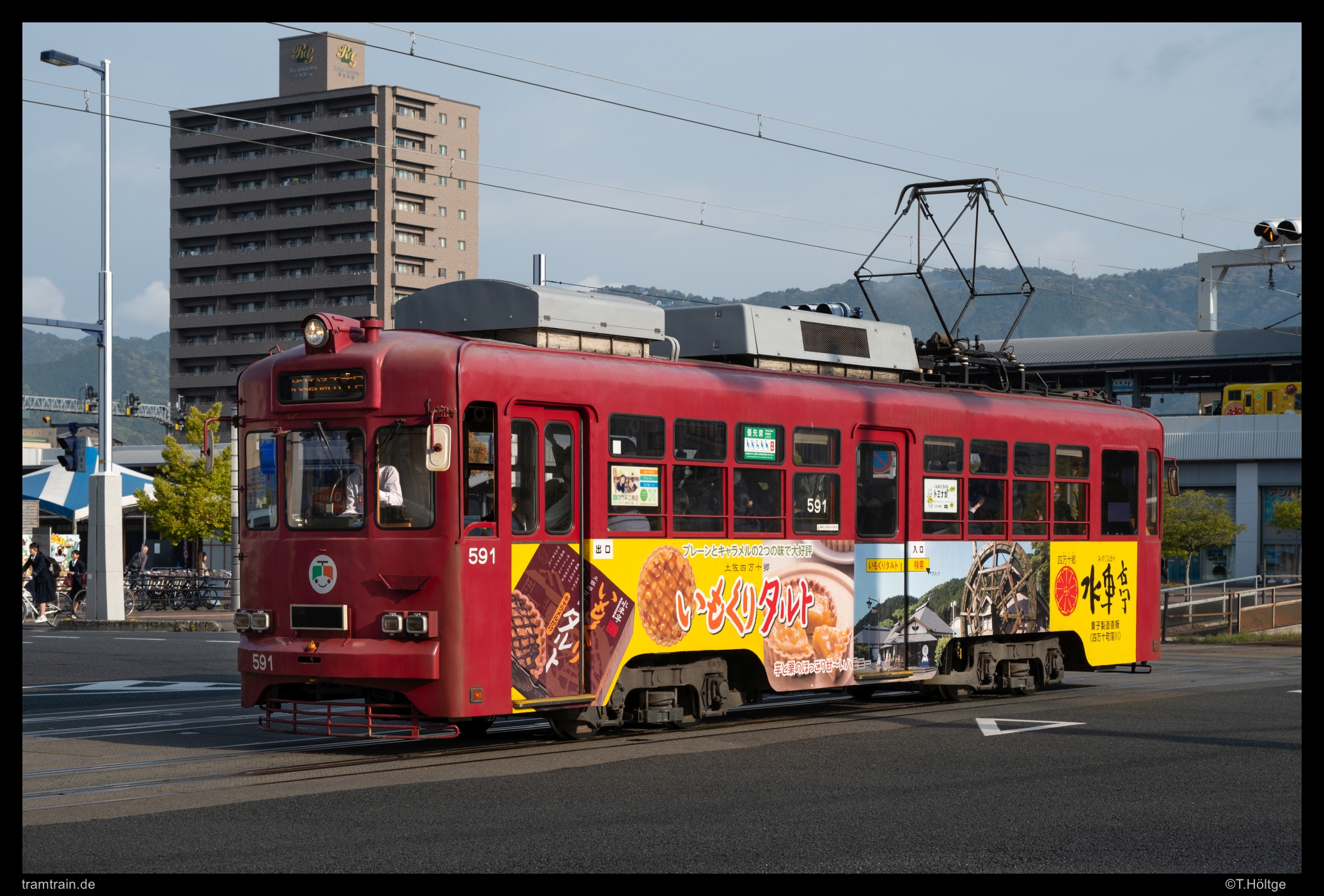 Die zwei Fahrzeuge 591 und 592 wurden im Jahr 2005 von der eingestellten Straßenbahn Gifu übernommen. Dort wurden sie im Jahr 1957 als Teil der fünf Fahrzeuge umfassenden Serie Mo590 für den Betreiber Meitetsu der Nagoya Railway von Nippon Sharyo gebaut. Beide Fahrzeuge wurden 1983 auf Einmannbetrieb umgebaut und erhielten später eine Klimaanlage. Während unseres Besuches konnten wir beide Fahrzeuge auf der Nord-/Süd-Relation antreffen.
