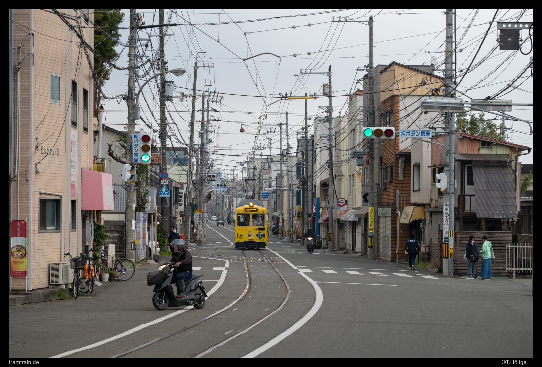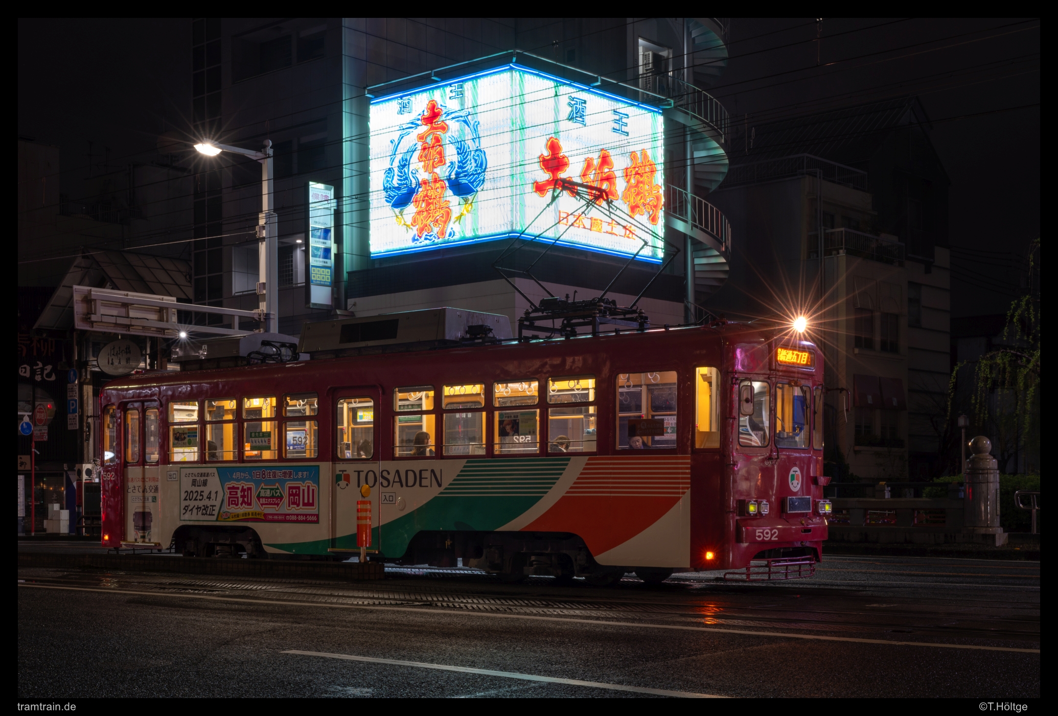 Am 10. April 2025 befand sich auch der Wagen 592 im Einsatz auf der Nord-/Süd-Relation, hier kurz vor Betriebsschluss an der zentralen Kreuzung Harimayabashi.