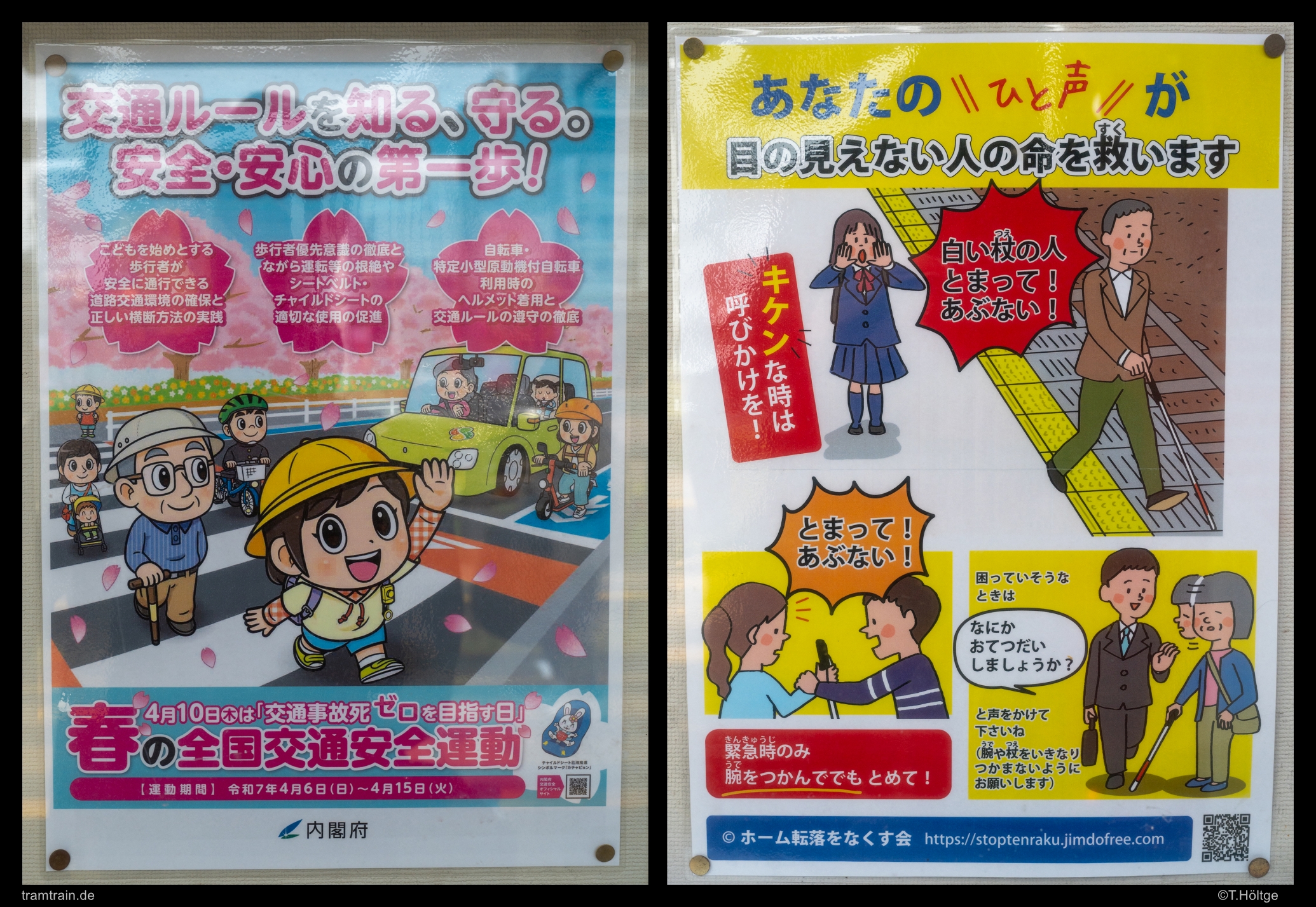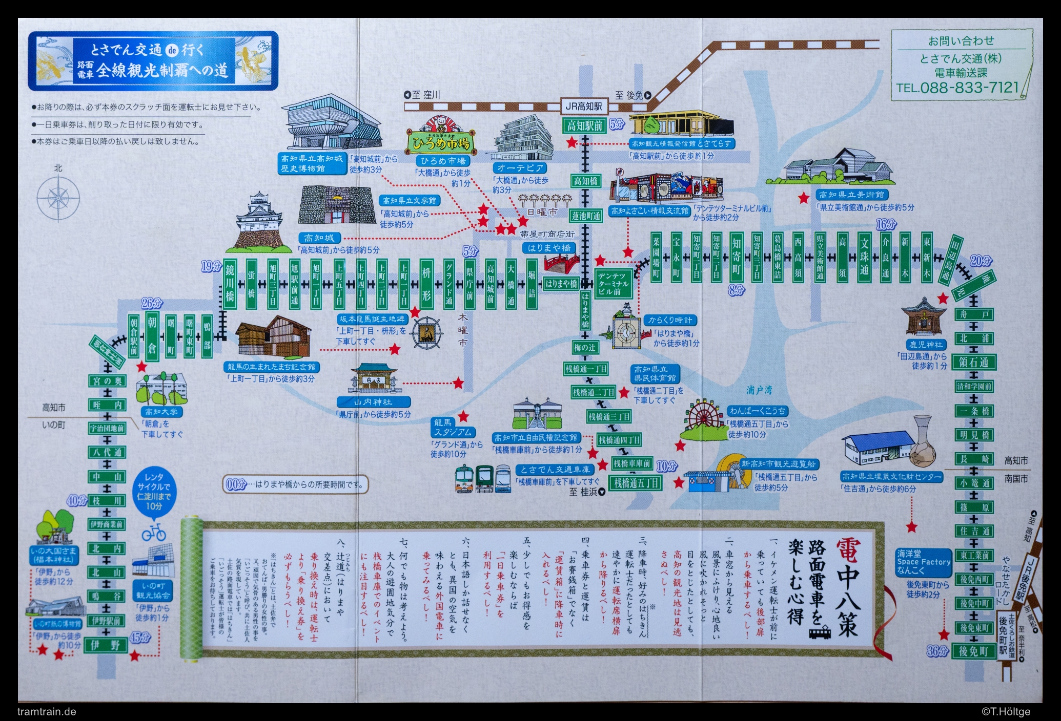 Wer des Japanischen mächtig ist, dem mag die Streckenkarte auf der Rückseite der als kleiner Flyer ausgeführten Tageskarte etwas nützen. Sonst ist das Ganze doch recht nutzlos, da die Haltestellen auf diesem Plan nicht durchnummeriert sind. Die blauen Zahlen über einigen Haltestellen geben zumindest Aufschluss über die außerhalb der HVZ gefahrene Taktung bis zur jeweiligen Haltestelle.