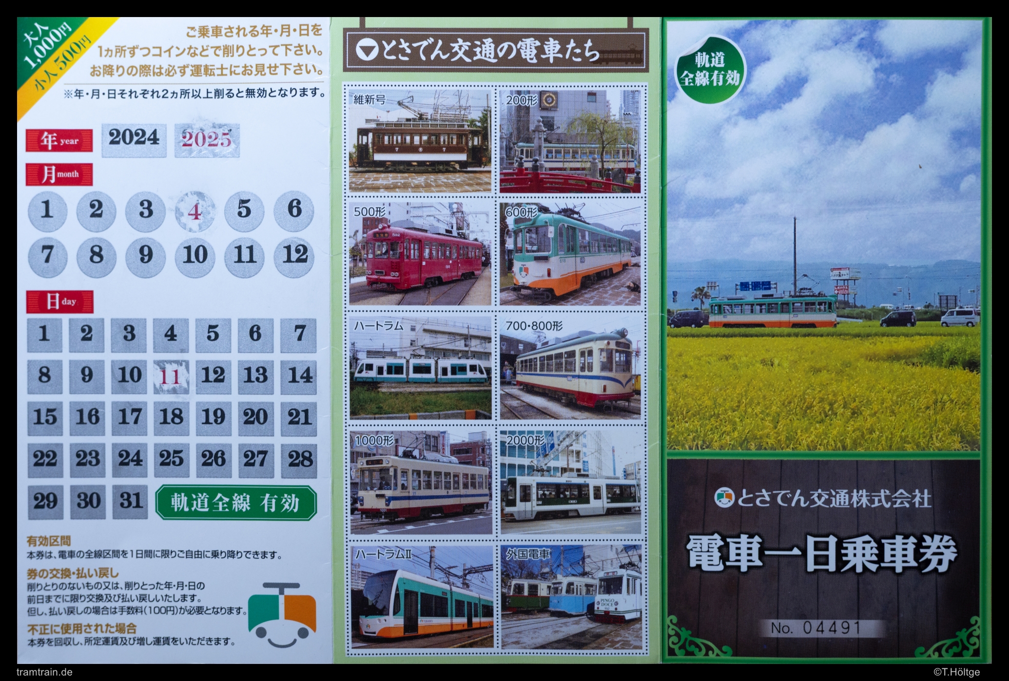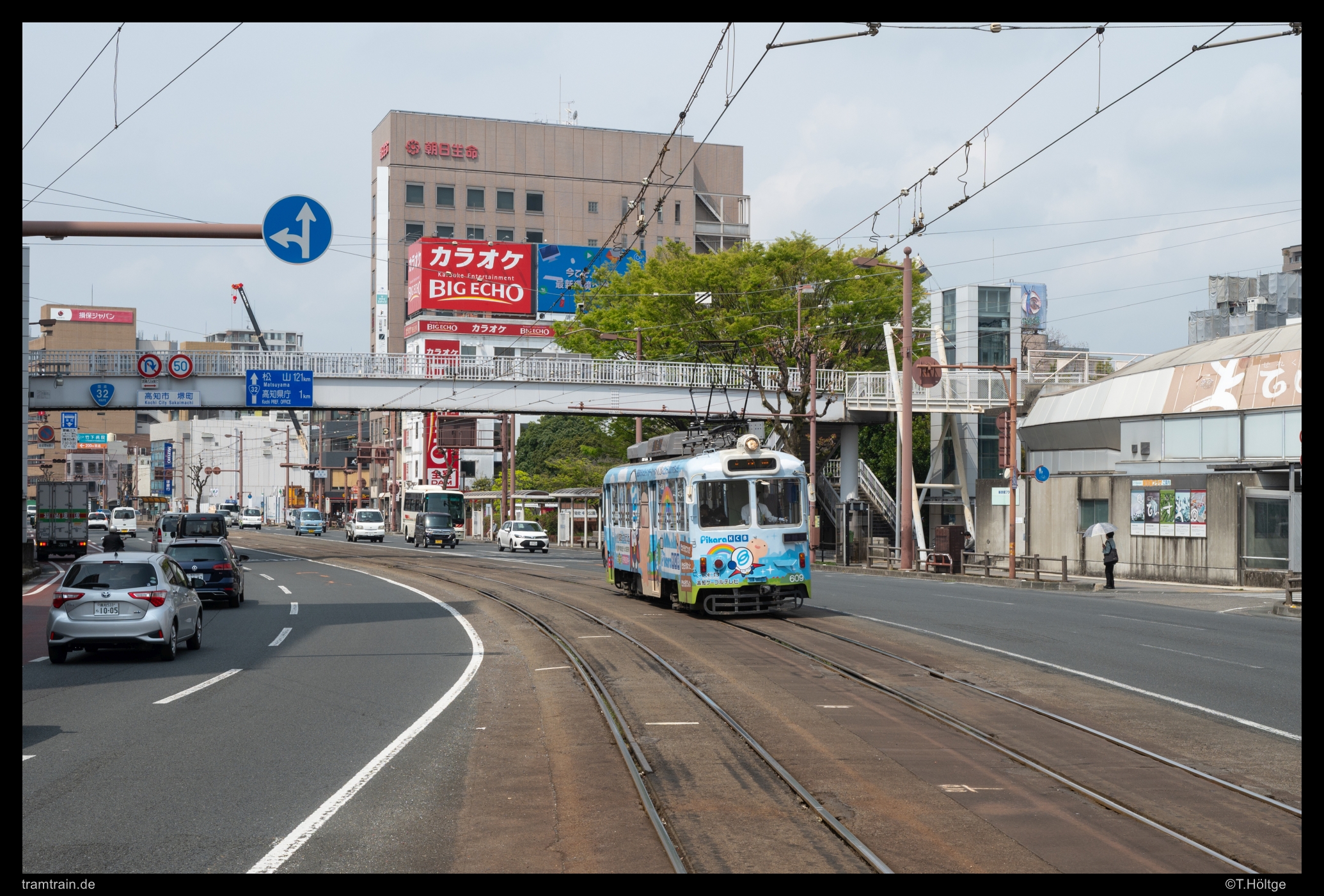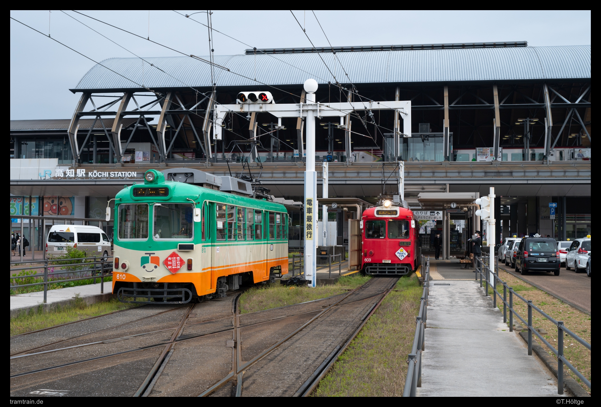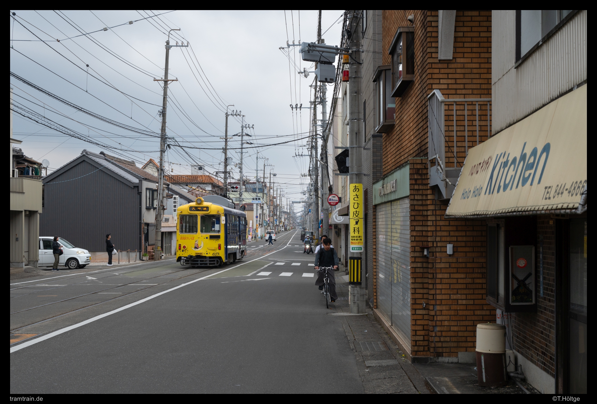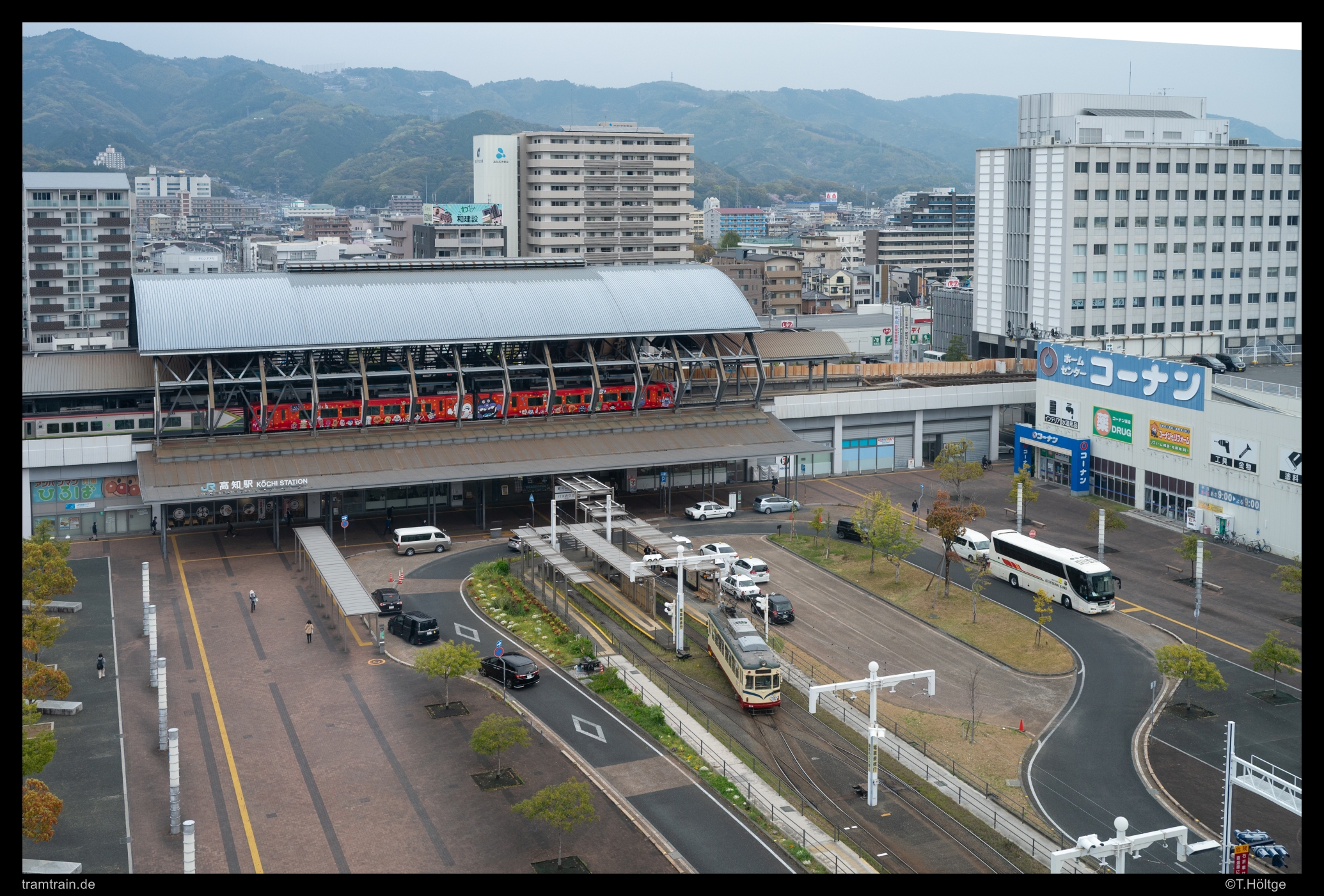 Der erste Abschnitt der Straßenbahn Kōchi wurde im Jahr 1904 eröffnet. Heute besteht das Straßenbahnnetz aus einer nur gut 3 km langen Nord-/Südstrecke, die von der Kōchi Station im Norden zum Depot am Hafen im Süden führt. Schon zwei Haltestellen von der Station entfernt, kreuzt im rechten Winkel die West-/Oststrecke, dank derer das Netz mit rund 25 km Streckenlänge heute das längste reine Straßenbahnnetz Japans ist. Die Strecke führt im Westen teils eingleisig bis in die rund 11 Kilometer vom Zentrum entfernte Nachbargemeinde Ino, im Osten bis in das etwa ebenso weit entfernte Gomen. Während in der Innenstadt in hoher Taktung gefahren wird – zur HVZ teils alle 2 1/2 min – enden auf der langen Linie zahlreiche Kurse an mehreren Zwischenstationen. Ino wird so nur alle 46 min erreicht, bis Gomen wird außerhalb der HVZ alle 36 min gefahren. Während der HVZ konnten wir dort jedoch etwa eine Verdoppelung feststellen. Auf dem langen eingleisigen Abschnitt bis Ino wurde früher mit Token gefahren, durch den auf 46min gestreckten Takt war das bei unserem Besuch nicht mehr nötig, da sich jeweils nur eine Bahn im eingleisigen, mit Kreuzungsstellen versehenen, aber nicht signalisierten Abschnitt befand. Eine Verdichtung zur HVZ scheint dadurch aktuell aber nicht möglich.