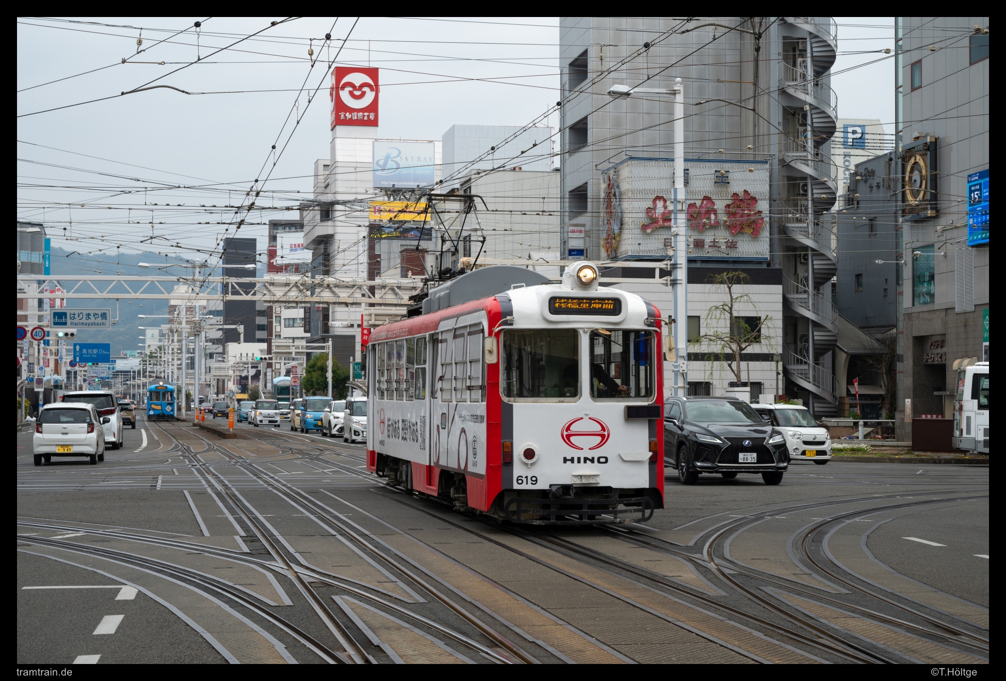 An der großen Kreuzung Harimayabashi folgen die Fahrzeuge im Sichtabstand. Zur Rush Hour wird ungefähr ein 2 1/2-Minuten-Takt gefahren. Mehr lassen die Wartezeiten an Haltestellen und Ampeln aber auch gar nicht zu. Hier überquert 619 die Kreuzung Richtung Süden. 631 im Hintergrund wechselt im Gegengleis am Gleiswechsel gerade die Fahrtrichtung, wohl um von der Ost-/Westachse kommend, ins Depot Richtung Süden einzurücken.