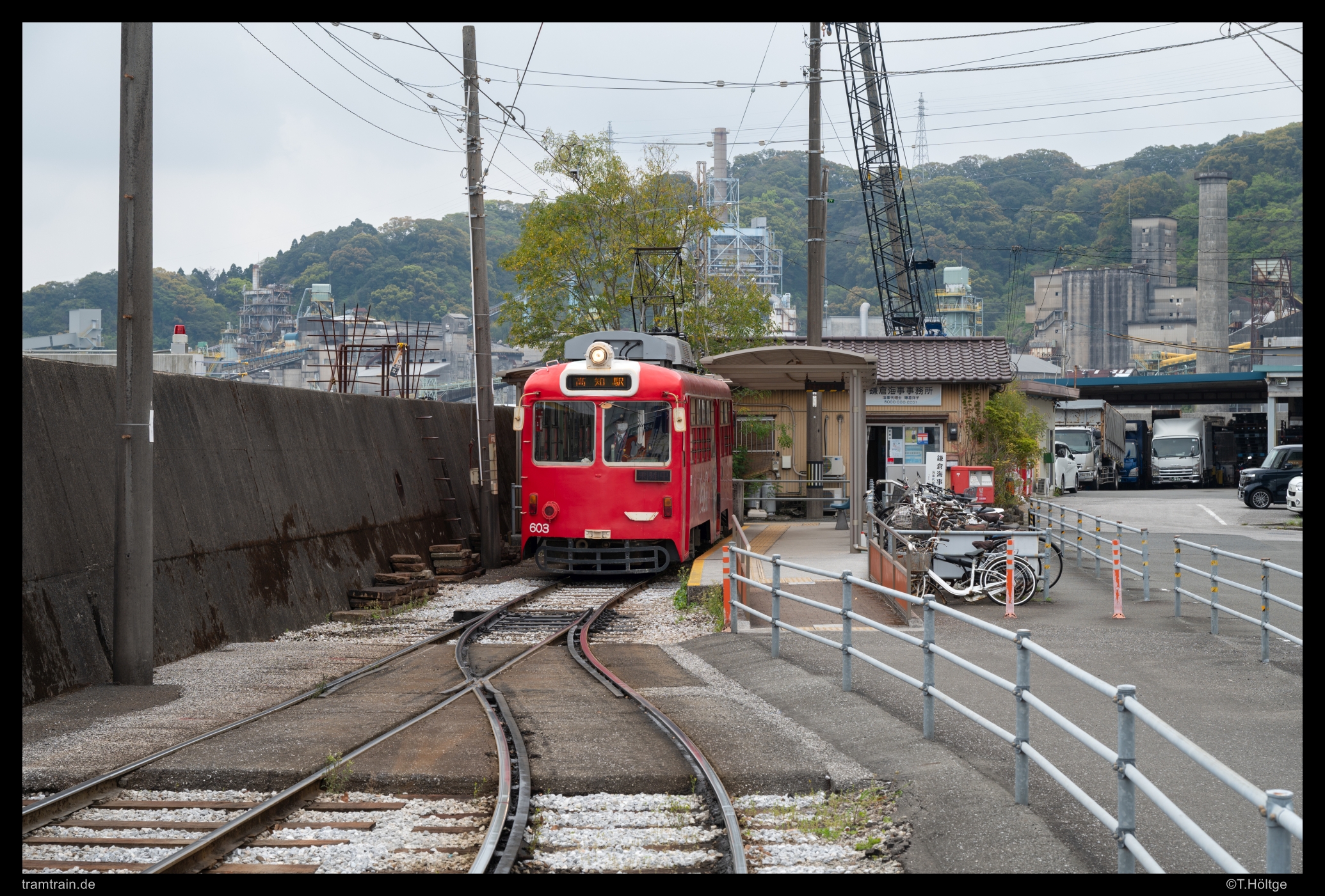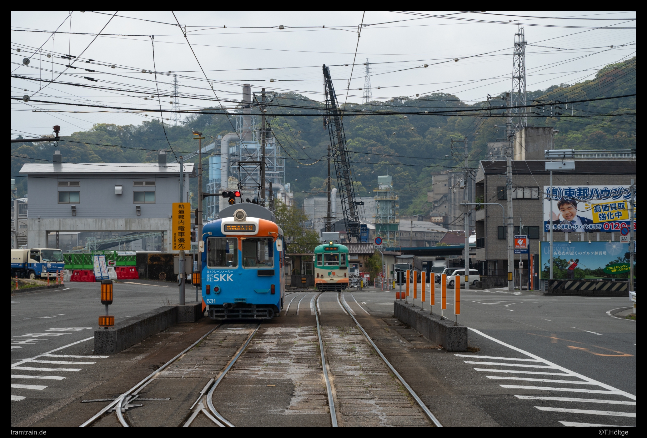 Das Tosen auf der großen Kreuzung war schon übel und die Flut an Autos ließ aktuell im Grunde nur Aufnahmen von den schmalen Haltestelleninseln zu, wo man aber ein- und aussteigenden Fahrgästen auch immer mehr oder weniger im Weg herumsteht. Nicht wirklich entspanntes Fotografieren. Wir verschoben uns nach diesem ersten Eindruck vom Fahrzeugauslauf also erstmal Richtung Süden zum Depot. Alles, was nicht eh den Tag über auf Linie bleibt, würde uns dort auch beim Einrücken begegnen. Die Strecke endet direkt an den Industrieanlagen des Hafens an der Kagami-Mündung. Nicht wirklich schön im eigentlichen Sinne, aber daran gewöhnt man sich in Japans Städten mit jedem Tag mehr. Außer das der 1001 noch einmal auf Einrückfahrt durchkam, passierte aber auch nichts Spannendes mehr. 101 und die 2000er blieben weiterhin auf der Fahndungsliste. Ein tiefer Blick ins Depot hinein verriet, dass sich der Replica-Museumswagen 7 und die drei Exoten – Graz 320, Lissabon 910 und Oslo 198 – eng beieinander unter einem Tramport versteckten. Auch der Stuttgarter GT4 735 ging aus Deutschland ursprünglich hierher, wurde inzwischen aber nach Fukui weitergereicht. Zeitweise kamen die Einzelgänger wohl sogar im Planbetrieb gelegentlich zum Einsatz, wie wir es auch in Hiroshima erlebt hatten. Während unseres Besuches blieben die Fahrzeuge aber auf dem Betriebshof.