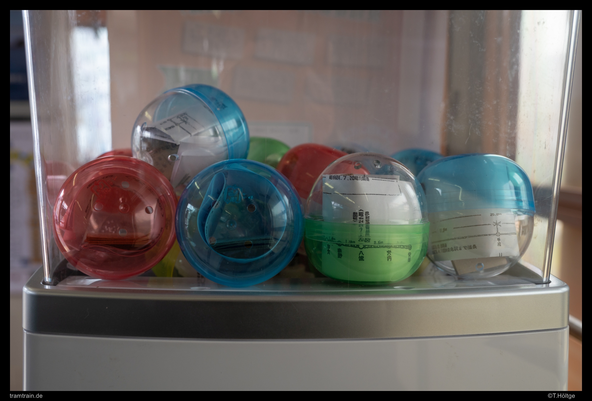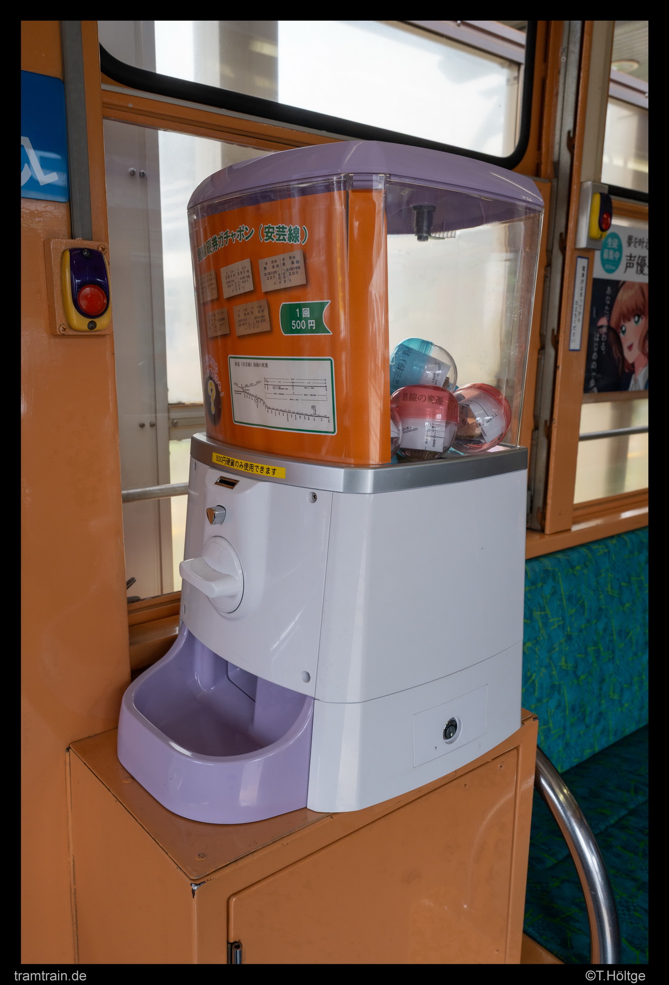 Es stand der aus Gifu stammende Wagen 592 vor dem Bahnhof bereit. Dort gab es wieder ein schönes Detail zu entdecken: Aus einem Kaugummiautomaten zwischen Längsbank und Tür konnte man alte Fahrkarten (oder Linienpläne?) der Straßenbahn Gifu kaufen.