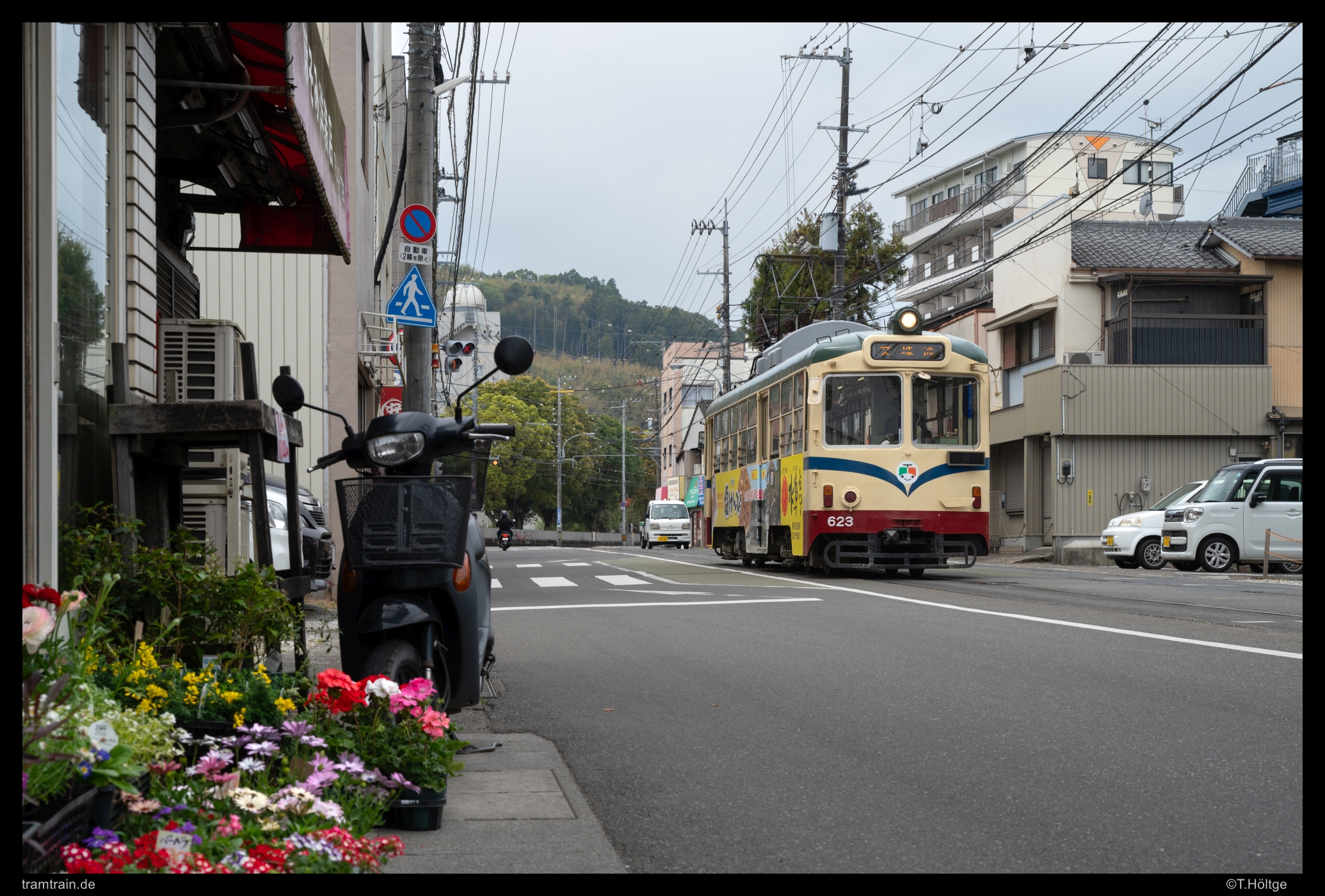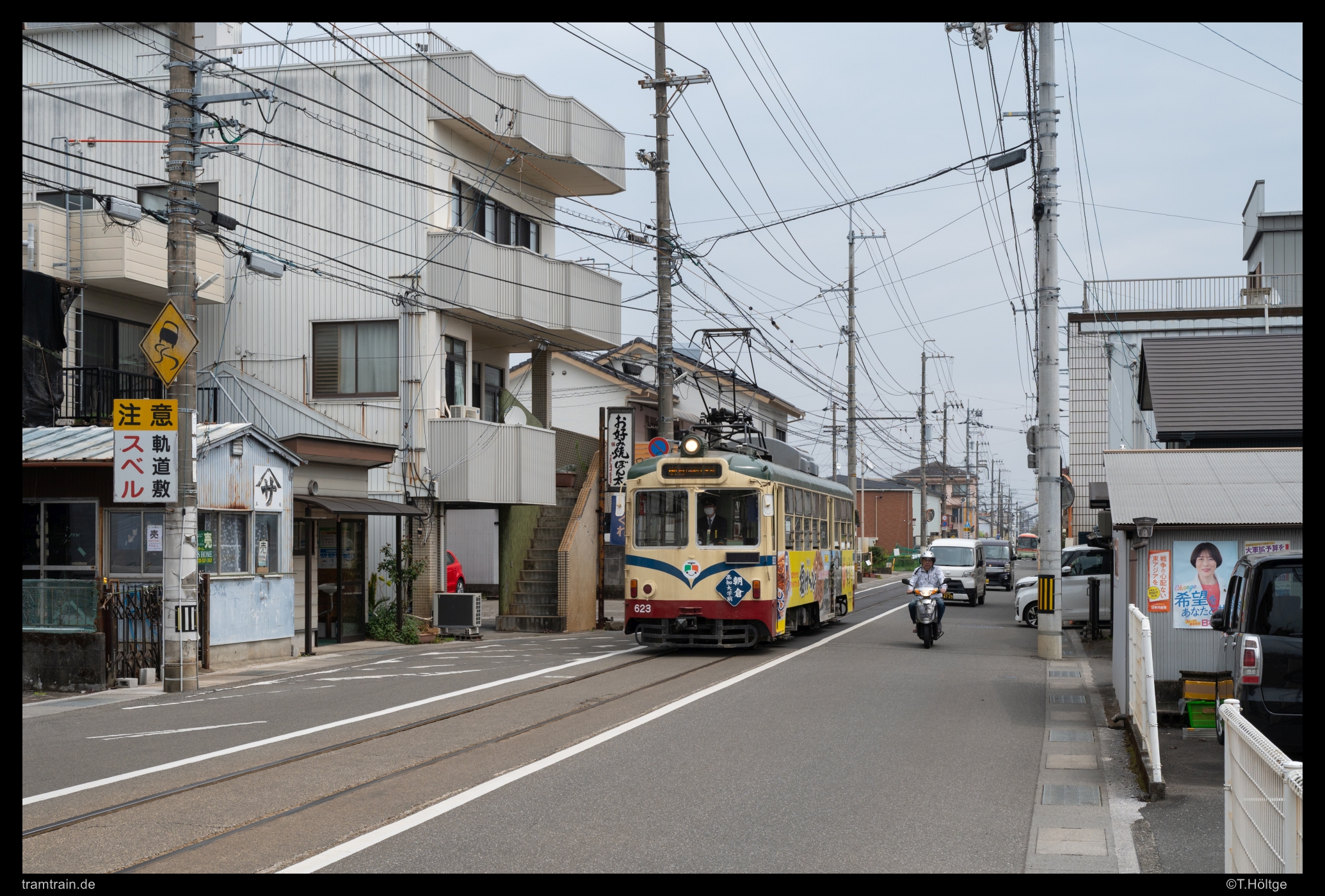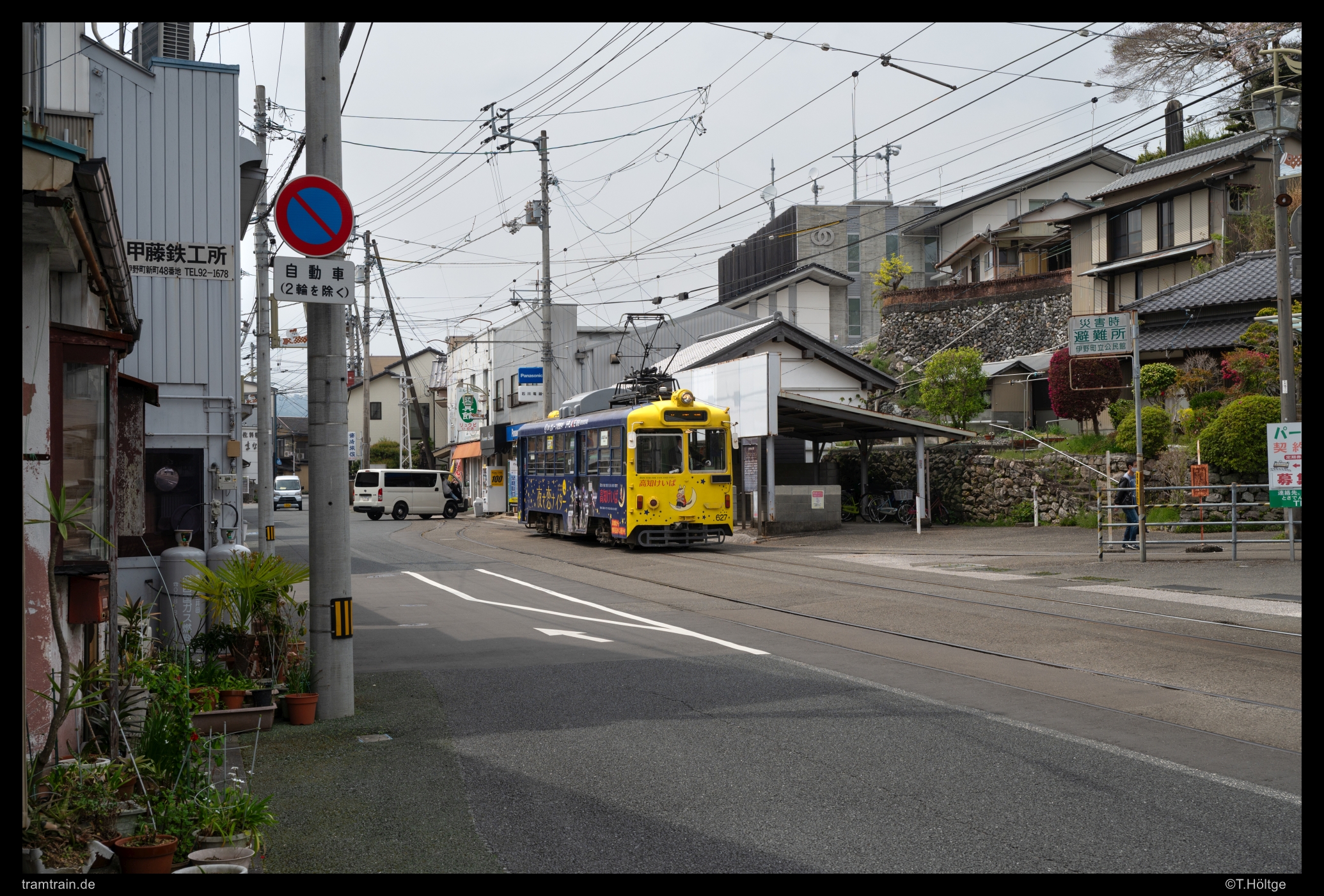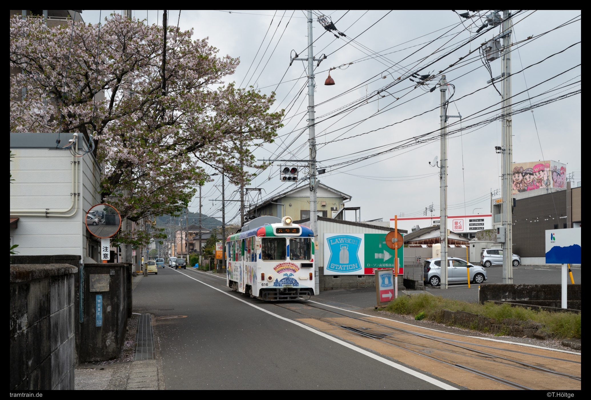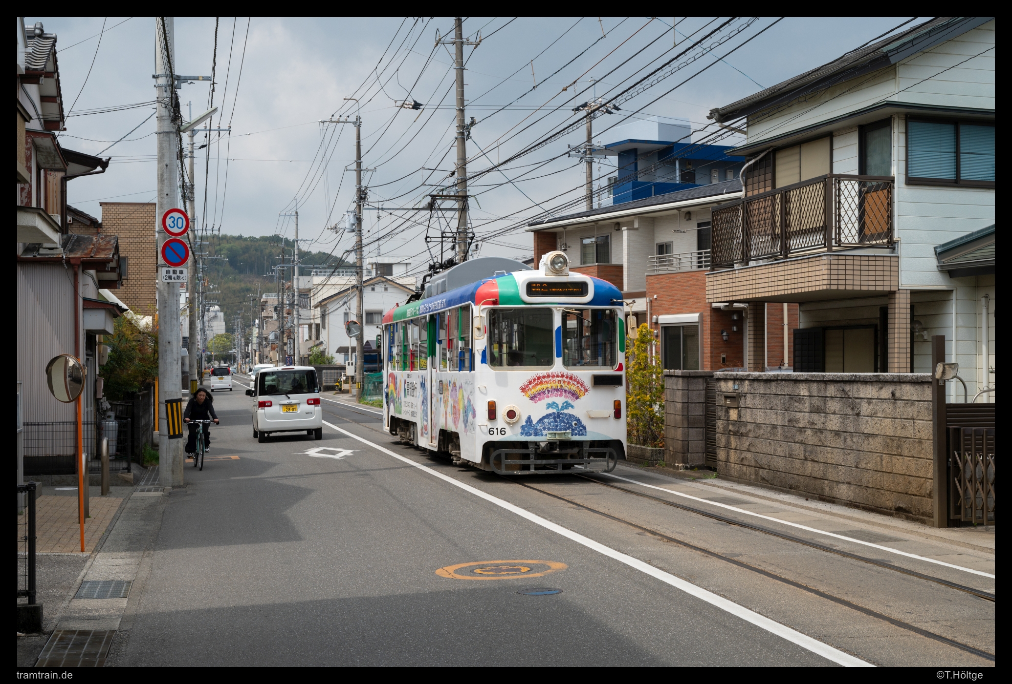 Unweit der Haltestelle Asakurajinja-Mae rumpelt 616 Richtung Ino durch.