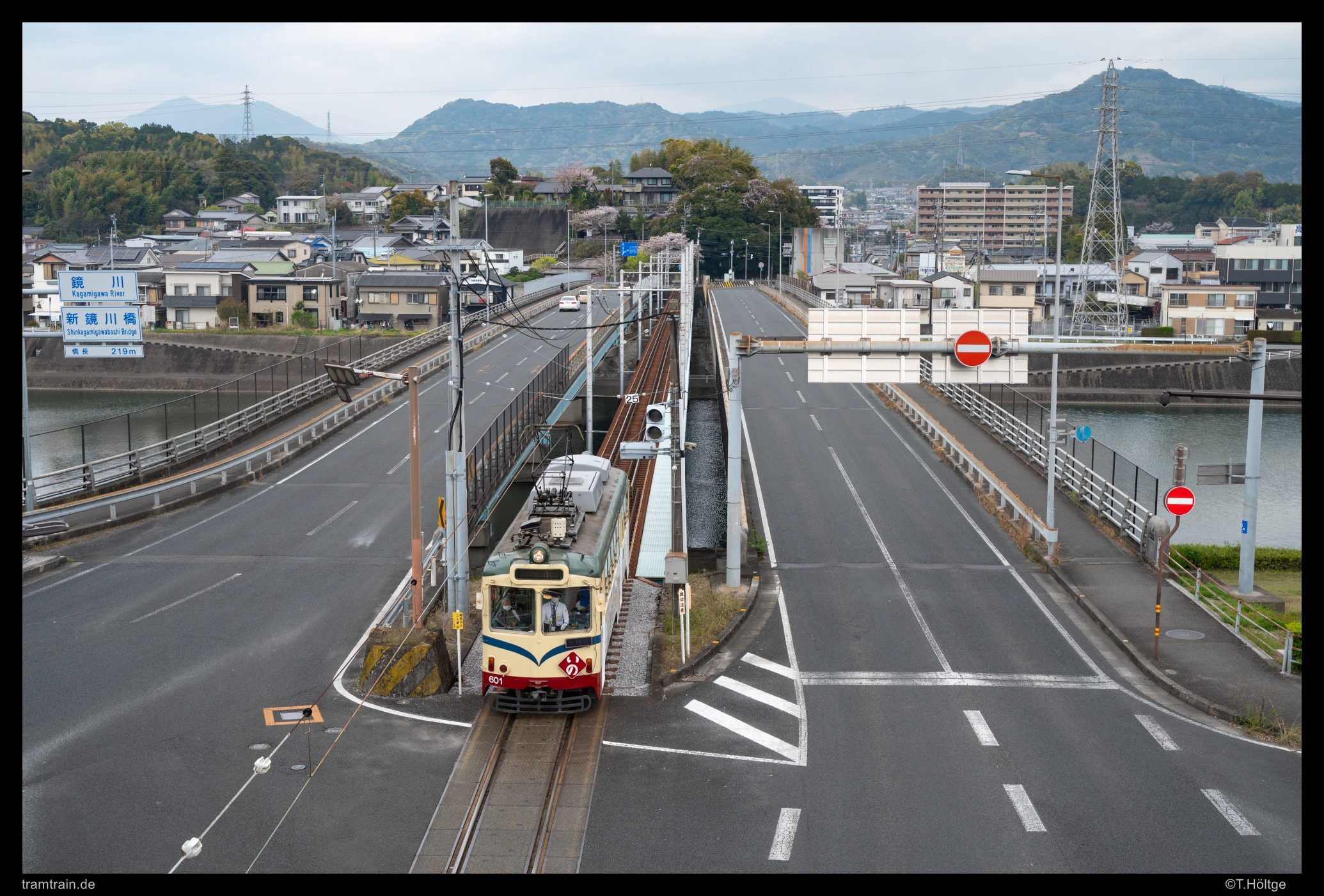 Als nächster “Langläufer” bis Ino kam anschließend Wagen 601 aus Kōchi über die Kagamigawa Bashi Bridge. Von der ein um 45-Grad verdrehtes Kreuz über der Straßenkreuzung beschreibenden Fußgängerbrücke bietet sich ein schöner Überblick über die Szene.