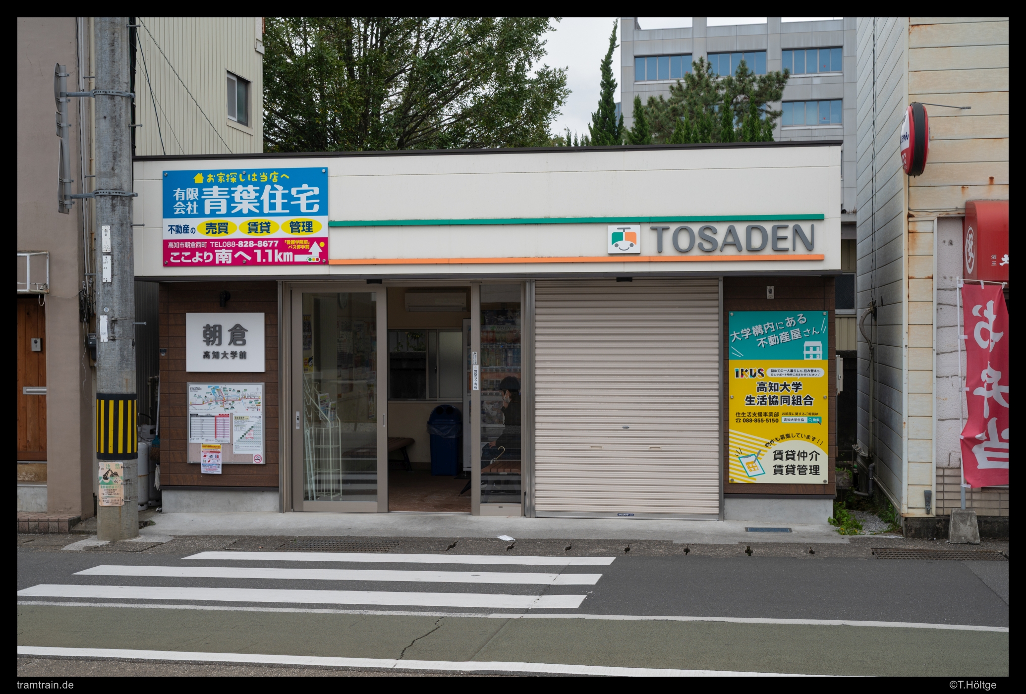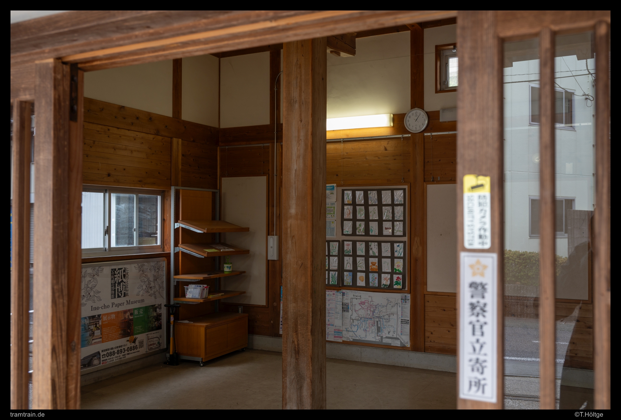 Am Straßenrand gibt es eine kleine Wartebude der Tosaden mit Informationen, Sitzgelegenheit und Getränkeautomat. Die Wartezeit kann hier auch schon einmal länger ausfallen mit einem 45-min-Takt Richtung Ino und einem 26-min-Takt Richtung Kōchi. Wie sich das fahrplanmäßig ausgehen soll? Keine Ahnung. Die verschiedenen Takte entsprechen irgendwie nie Vielfachen der anderen.
