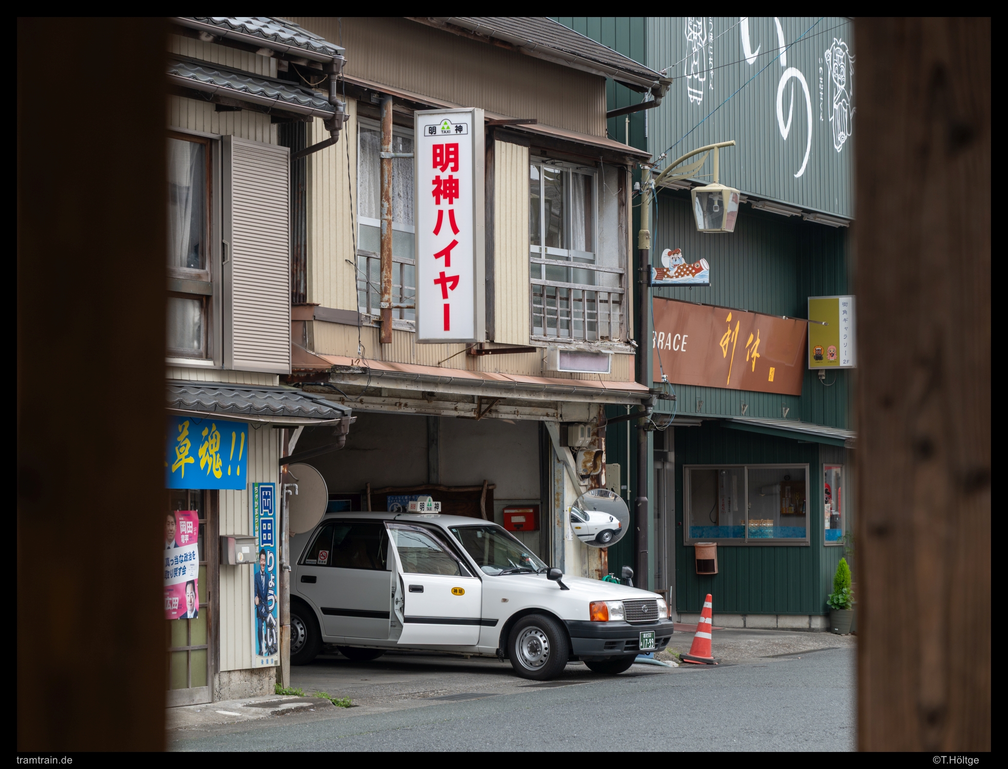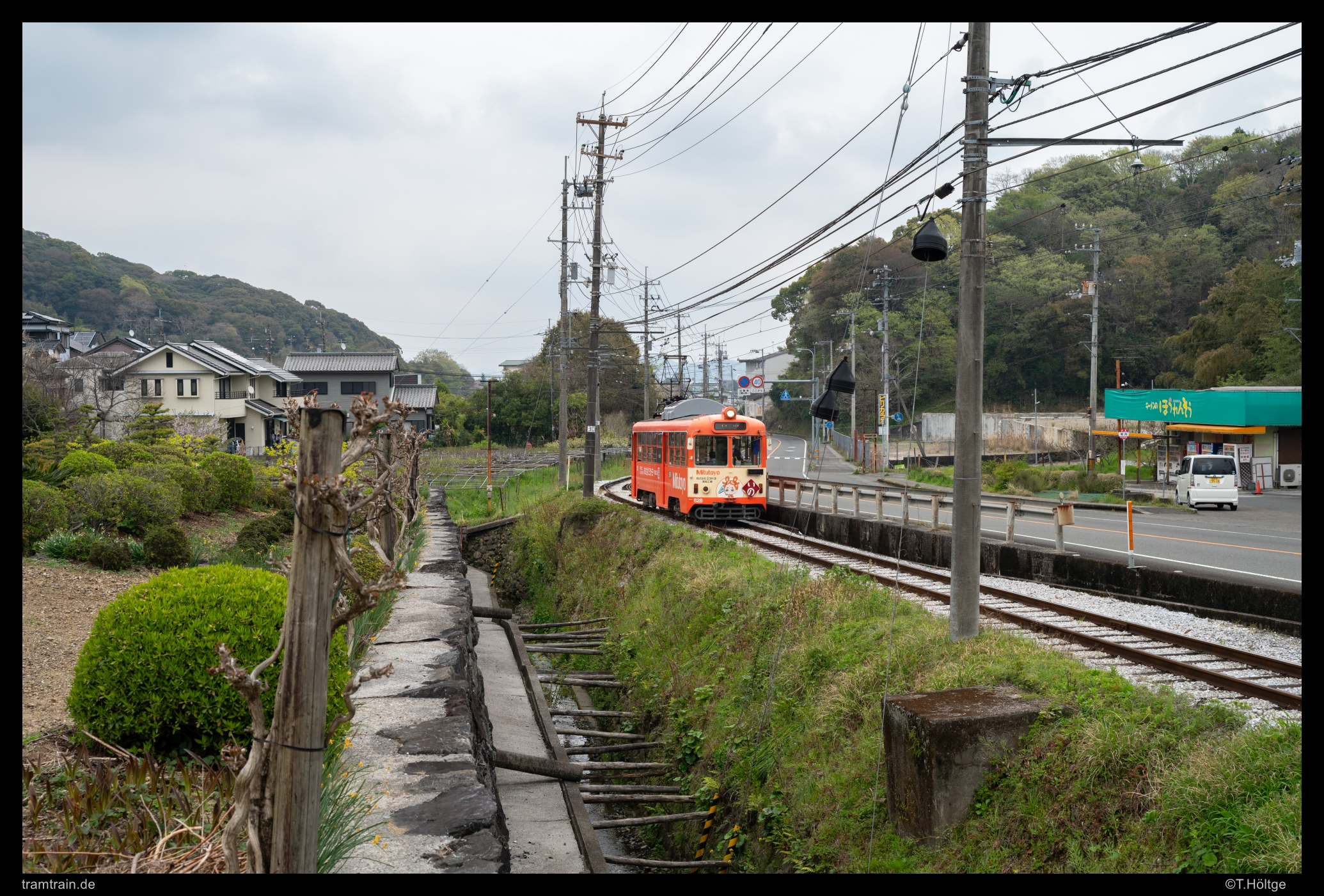 Wir schlenderten anschließend durch den Ort bis zur Zwischenendstation Asakura. Schon sehr dörflich hier für japanische Straßenbahnverhältnisse: Eingleisig auf der Fahrbahn mit Ausweichen verläuft die Strecke schnurgerade durch den Ort. Ein Fußweg sucht man an solchen Straßen meist vergebens, aber die Japaner fahren in der Regel extrem defensiv und die meisten Autos sind nach europäischen Standards auch nur halbe Autos, sodass es selten wirklich eng wird.
