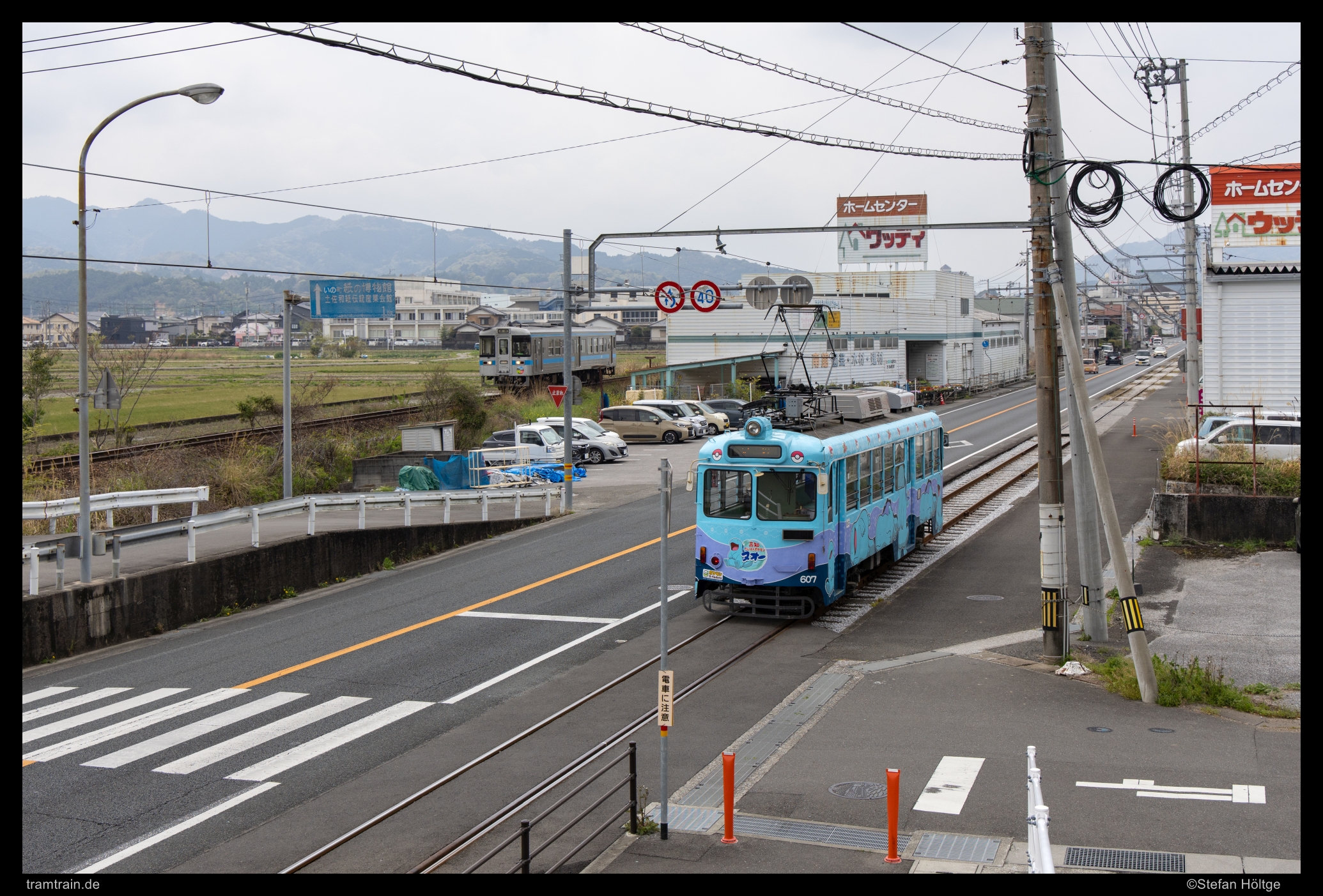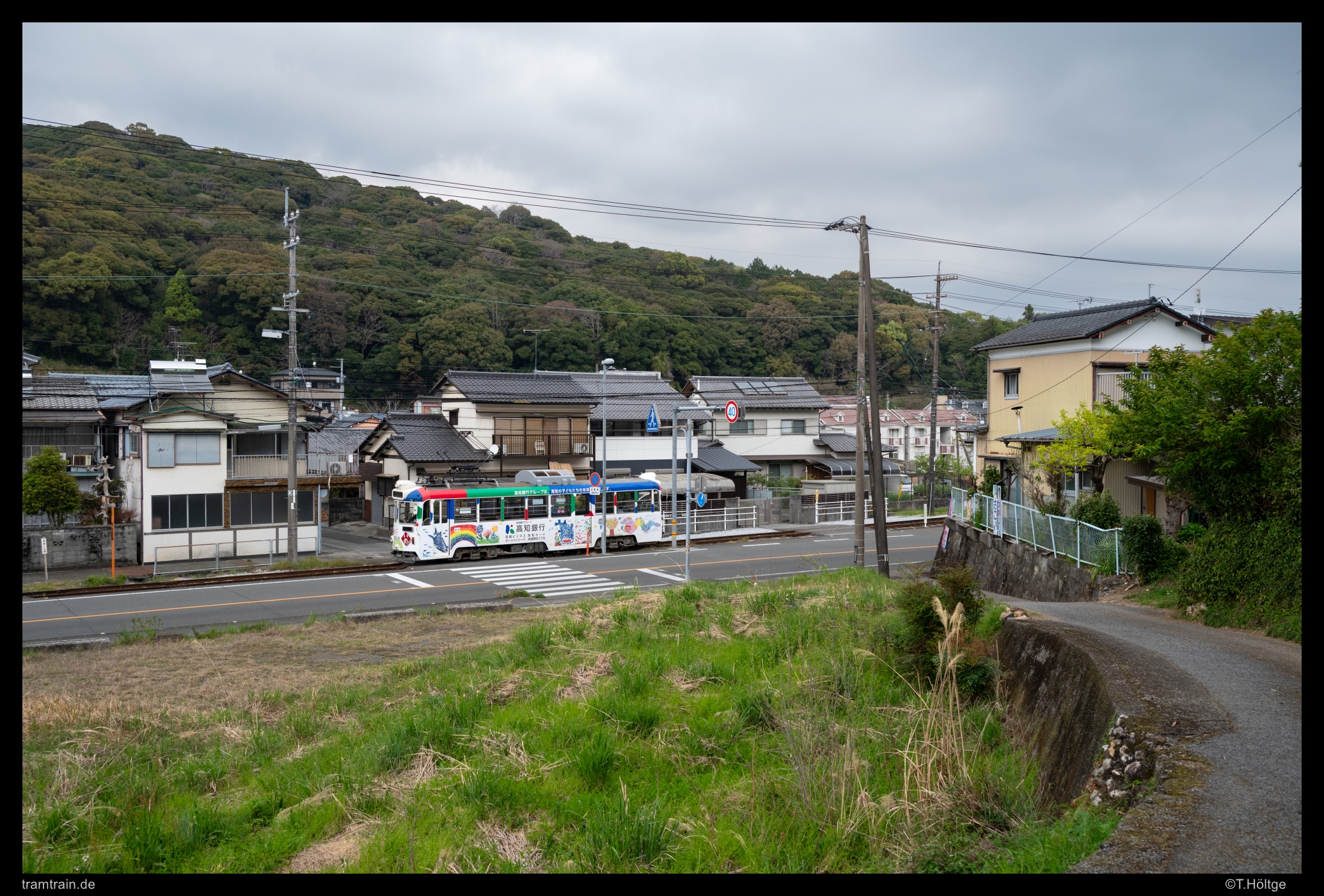 Nach der kurzen Pause liefen wir dem nächsten Wagen durch den Ort entgegen, um hier noch eine Aufnahme abseits der Endstation zu machen. Wirklich schön wurde es bis zum Ortsausgang allerdings nicht. Die Strecke verläuft in Seitenlage einer stark befahrenen Straße und rund herum stehen eher Gewerbeanlagen, als sehenswerte Wohnbebauung. So warteten wir schließlich am rand der Ortslage an der Haltestelle Kitayama, an der auch die JR-Strecke unmittelbar in Sichtweite verläuft und nahmen den 607 anschließend ein Stück zurück Richtung Kōchi.