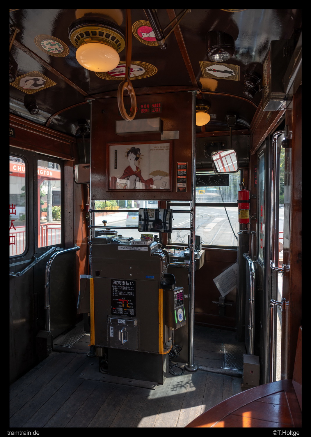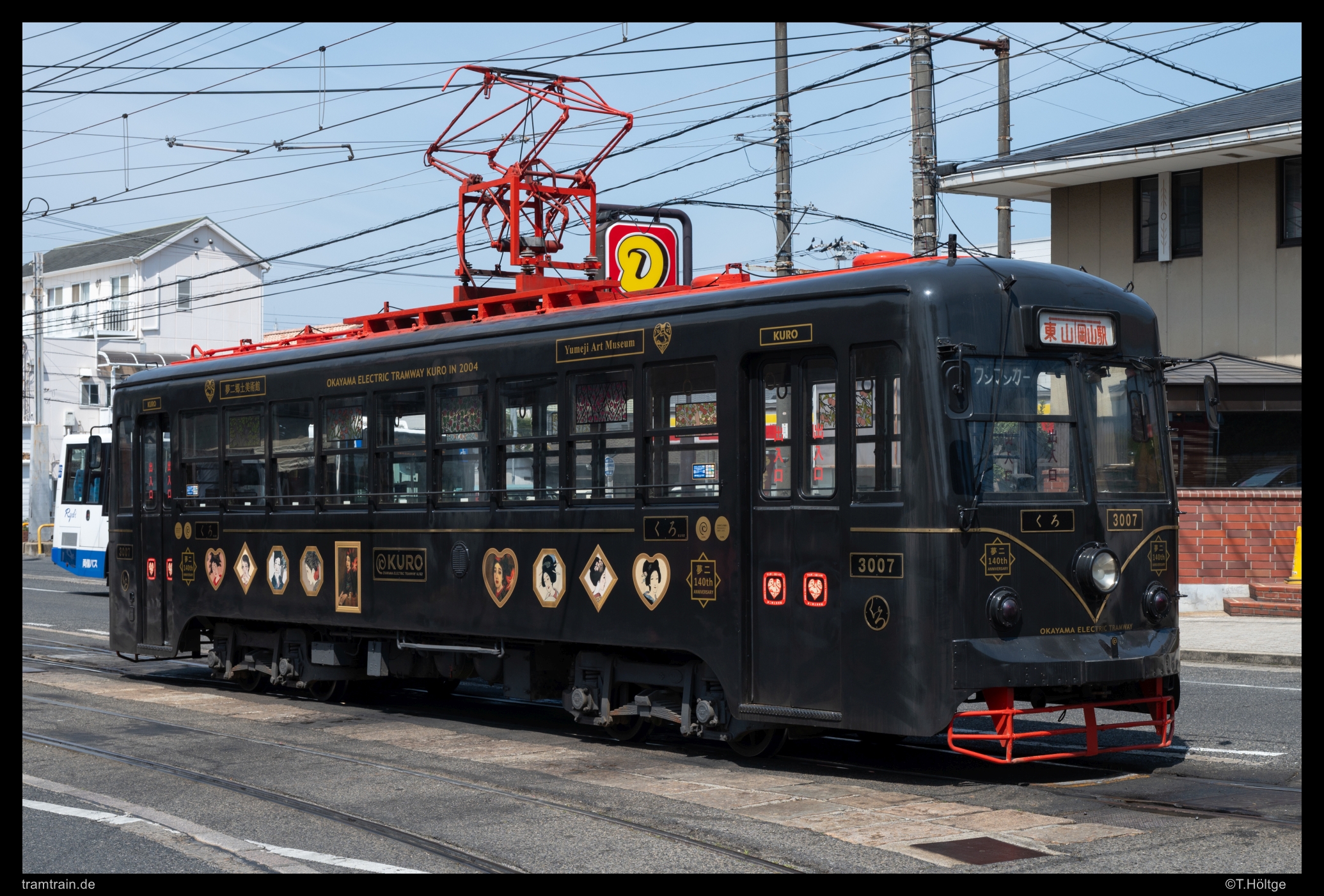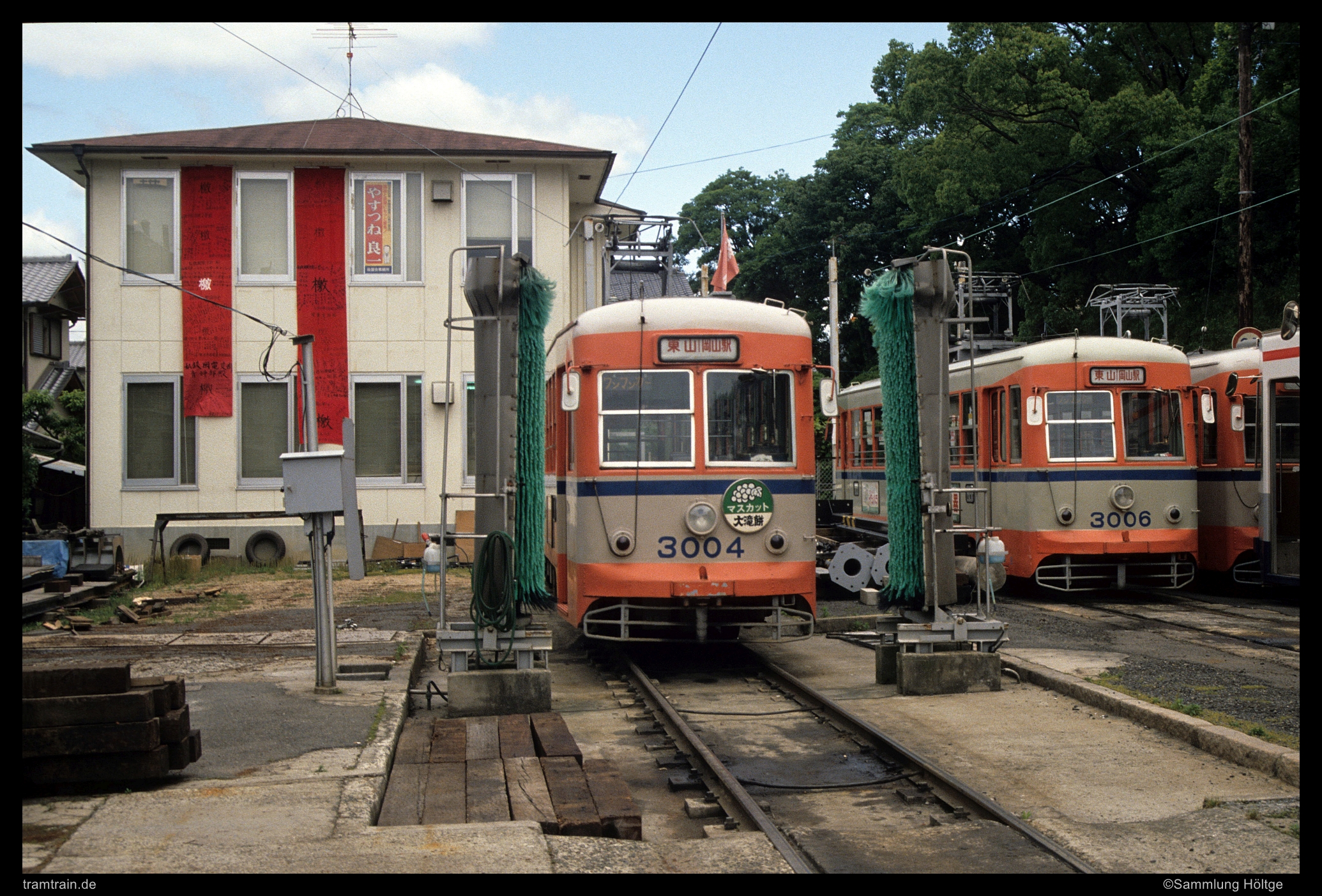 Die Fahrzeuge der 3000er Serie wurden ursprünglich im Jahr 1953 von Utsonomiya Sharyo als 100er Serie für die Tobu Railway gebaut, die sie auf der Straßenbahn von Nikko einsetzte. Mit der Einstellung 1968 gelangten alle zehn gebauten Fahrzeuge nach Okayama, und erhielten neue 3000er Nummern. 3001 war 1973 in einen Unfall verwickelt und wurde anschließend abgebrochen. Die Fahrzeuge 3002 bis 3006 und 3008 wurden in den 1990ern bei Alna Koki zum Aufbau der aktuell in Betrieb befindlichen Baureihen genutzt. Die Fahrzeuge 3009 und 3010 gelangten nach ihrem Einsatz in Okayama in den Jahren 2002 und 2013 als Ausstellungsstücke zurück nach Nikko. Verblieben sind damit heute noch die Fahrzeuge 3005 und 3007. 3005 trägt aktuell die ehemaligen Farben von Nikko, sah aber an seinem Abstellungsort auf dem Betriebshof von außen betrachtet schon etwas mitgenommen aus. 3007 dient als Heritage Car und wurde bei unserem Besuch am Samstag zum Normaltarif zwischen den Linienwagen auf der Linie 1 eingesetzt.