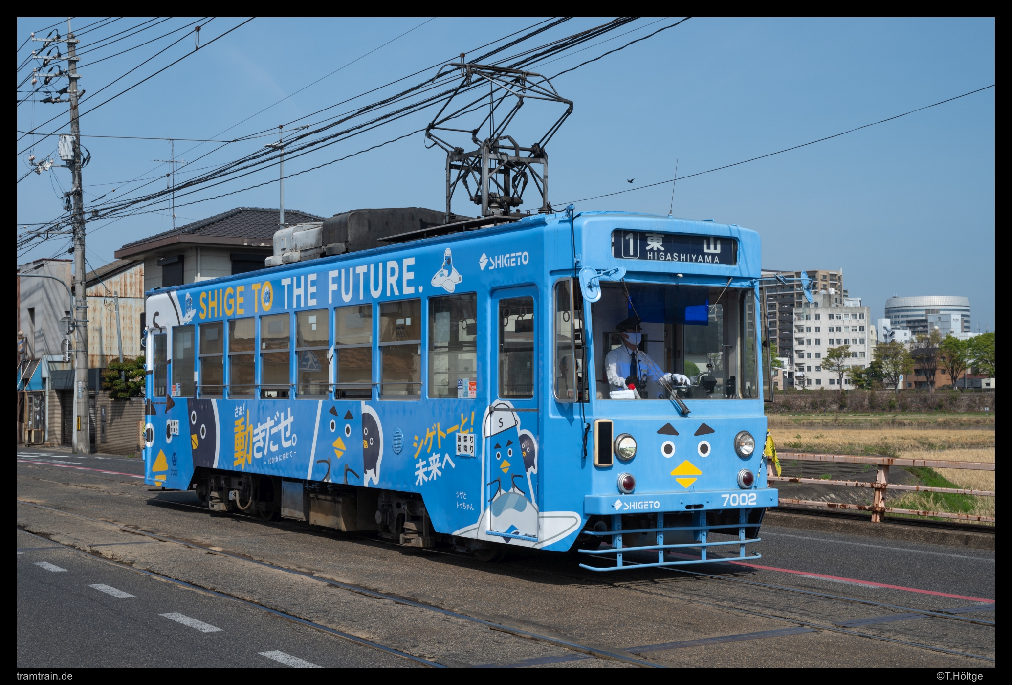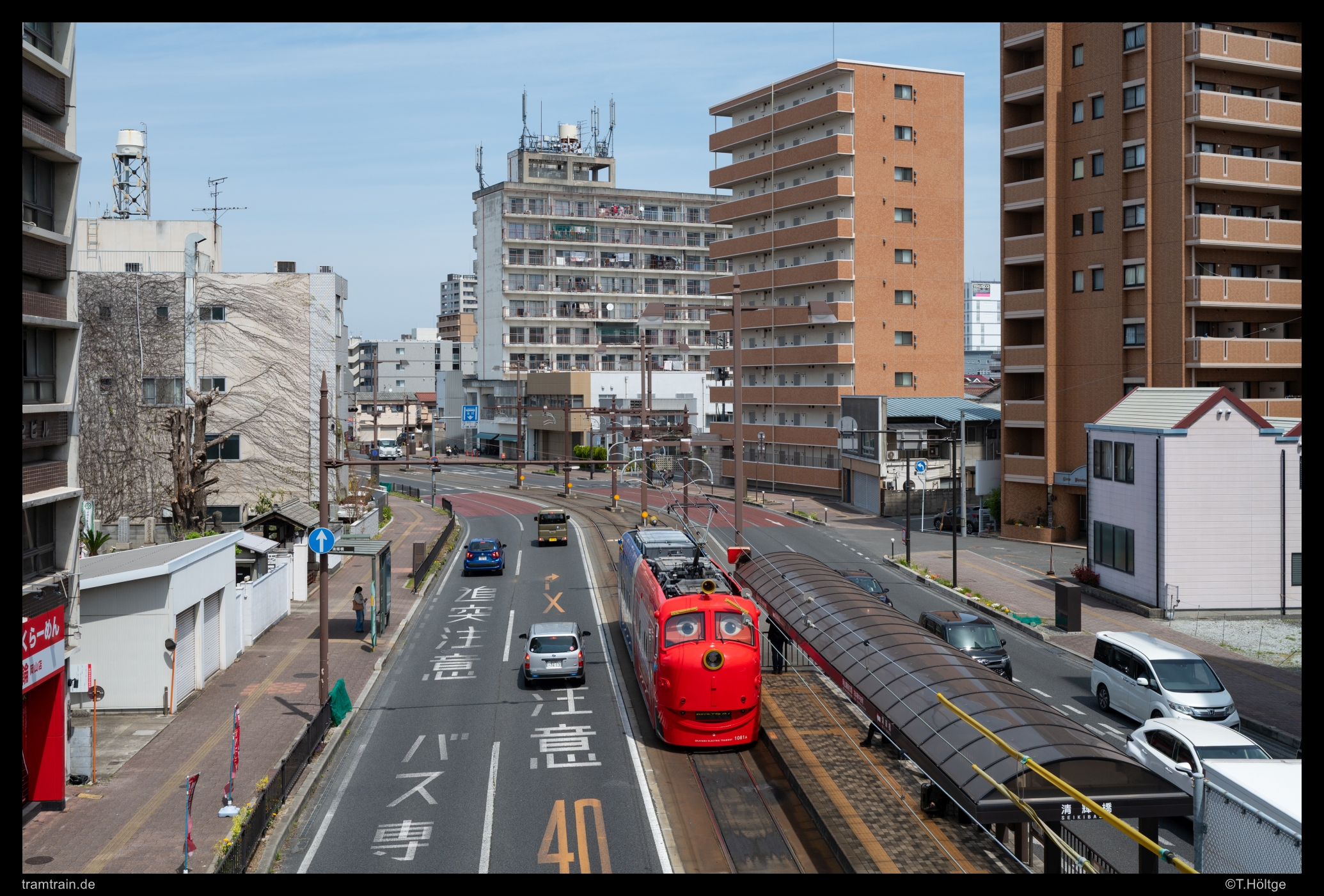 Zu Fuß lief ich weiter Richtung Higashiyama. Nach der ungeplanten Aufnahme des historischen 3007 stand nun ein ganz besonderes “Highlight” an, der “Chuggington-Train”. Zum Hintergrund hatte ich im einleitenden Teil schon ein wenig geschrieben, das Teil auf Strecke zu sehen – und zu hören – war aber noch einmal eine ganz andere Nummer. Völlig skurril, wie sich dieses verkleidete, kitschige Gefährt durch die dazu im Kontrast stehenden, grauen Straßen schiebt. Dazu laut und fröhlich plärrende Kindermusik. Völlig verrückt. So etwas kennt man ja sonst eher noch aus Blackpool, aber dort wurde stets auf altbrauchbarem Material etwas Neues zusammengezimmert, während man hier das mondernste und nur eines von drei Niederflurfahrzeugen für diesen Spaß bereithält. Aber lustig anzusehen war es in jedem Fall und die Kinder schienen ihren Spaß zu haben.