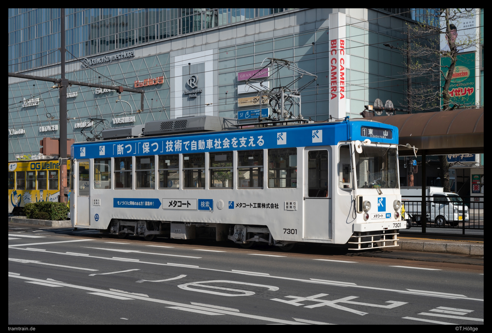 Am Bahnhof, den wir nun aus der morgendlichen Perspektive auch einmal sehen, startet die Fahrt mit den Linien 1 und 2. Wagen 7301 macht sich gleich wie ich auf den Weg nach Higashiyama.