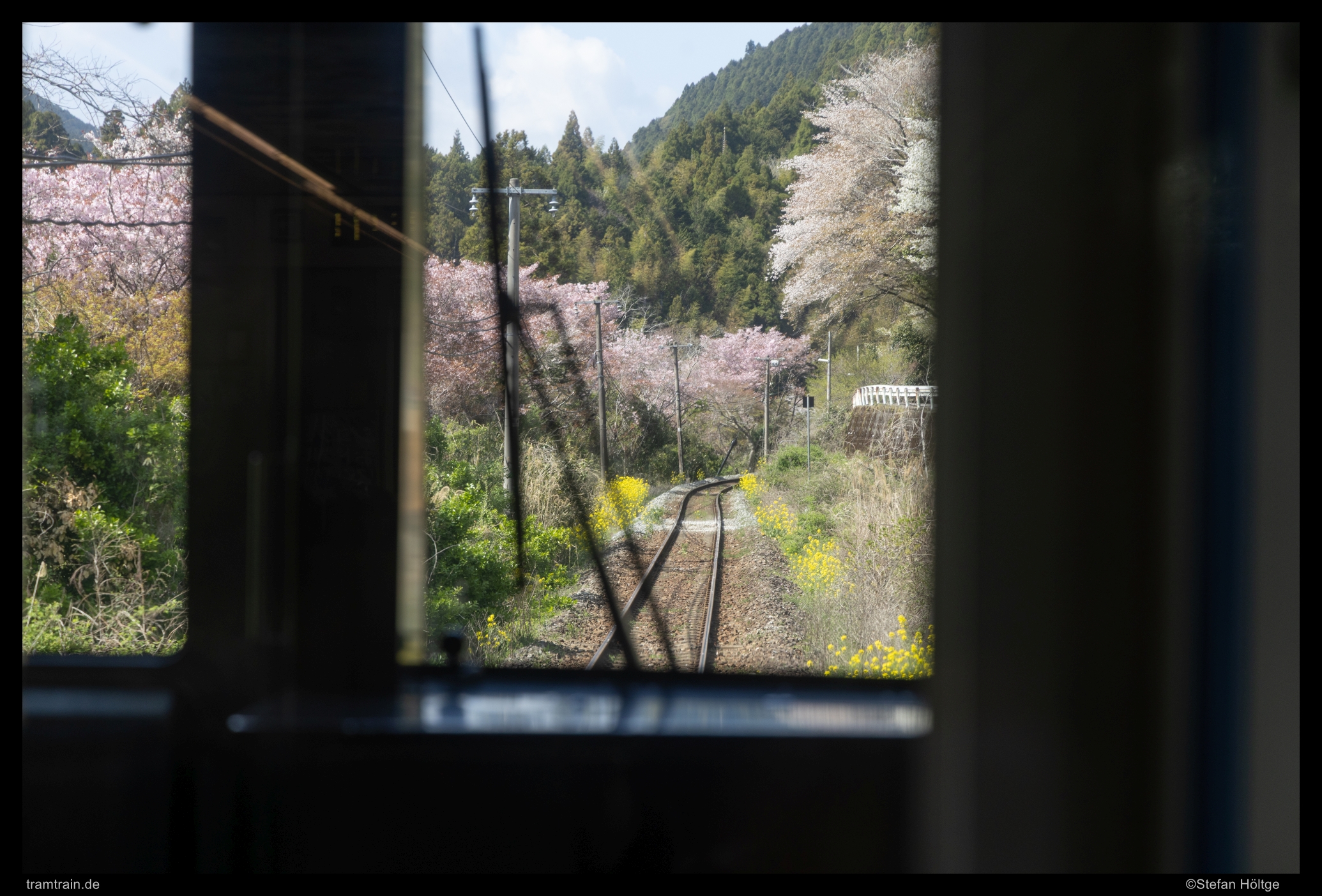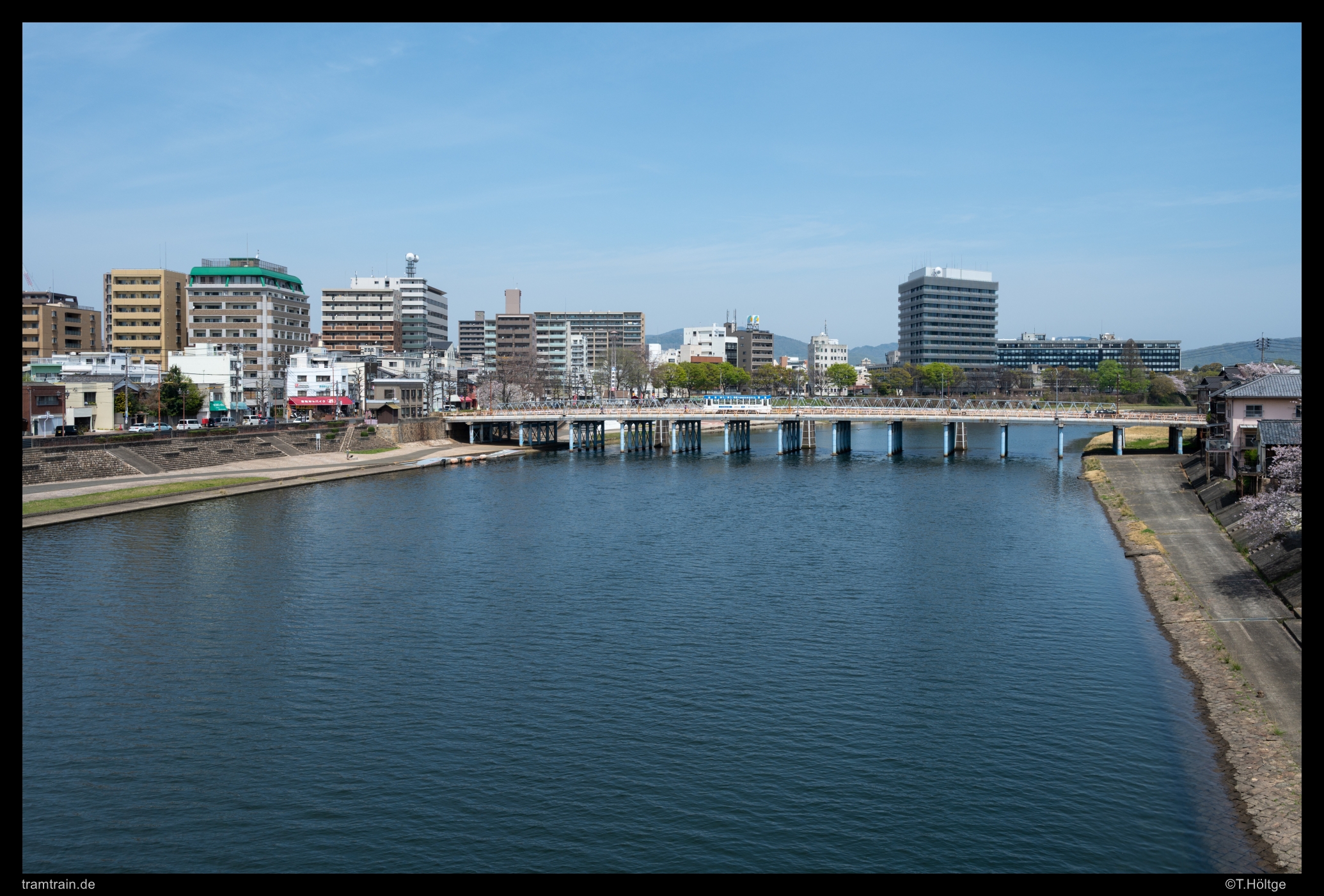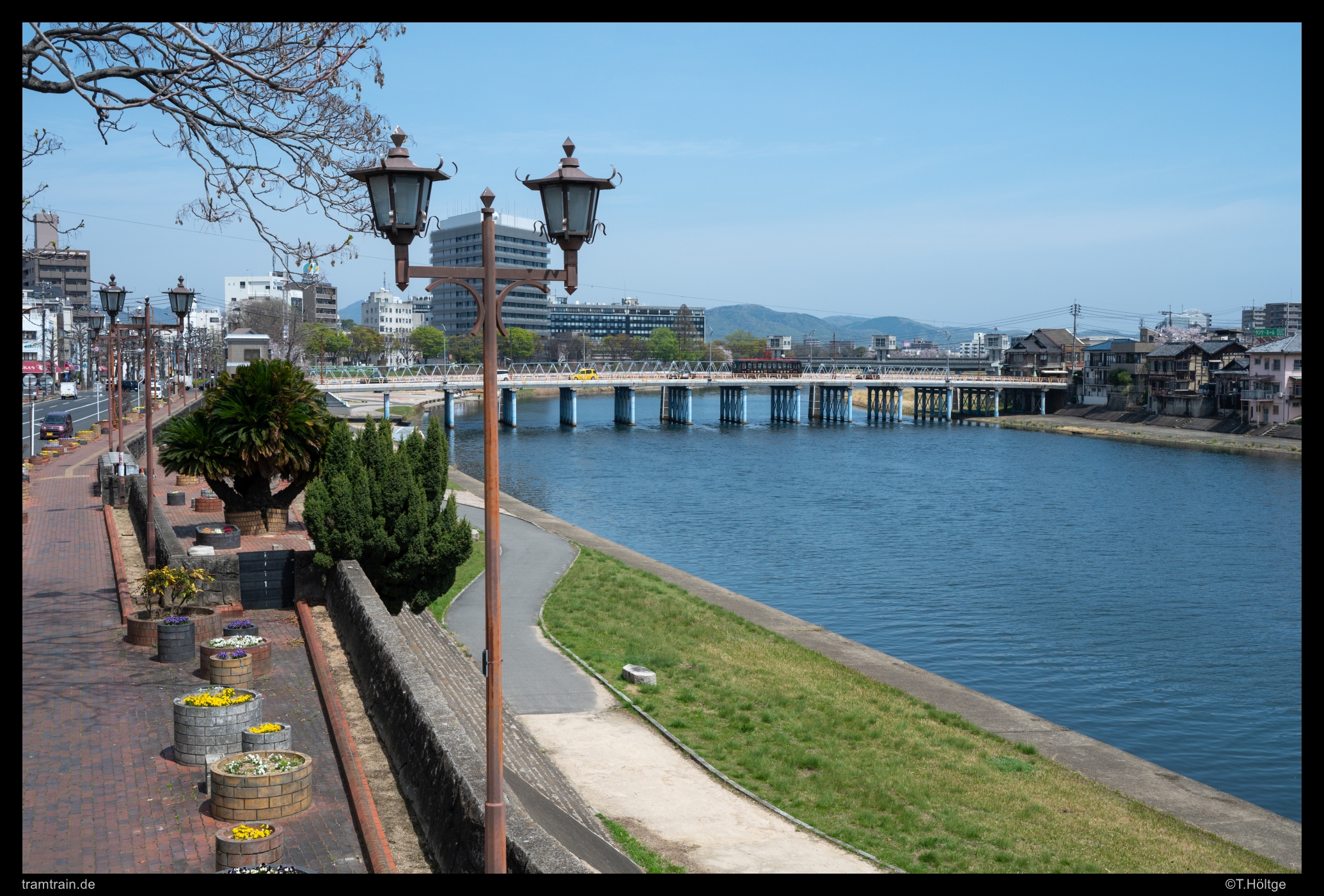 Noch einmal die mittlere Brücke, jetzt mit Kirschblüte und Wagen 7601. Erstaunlich unordentlicher Bruch steht auf den Inseln teilweise herum.