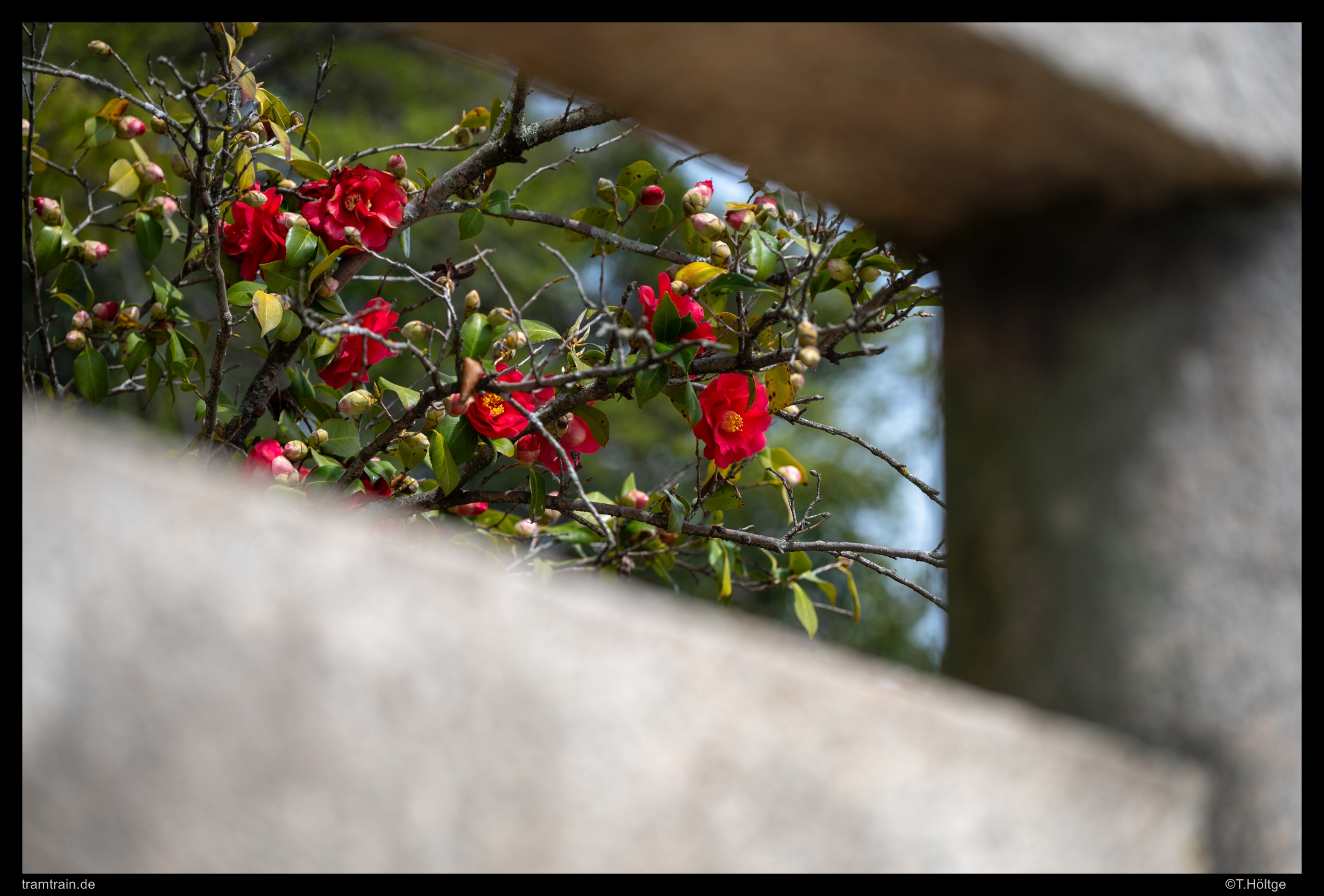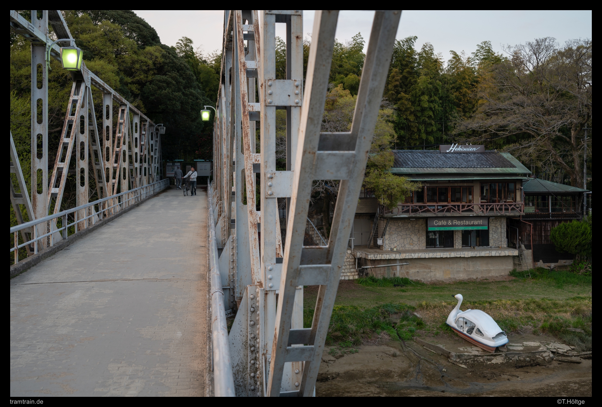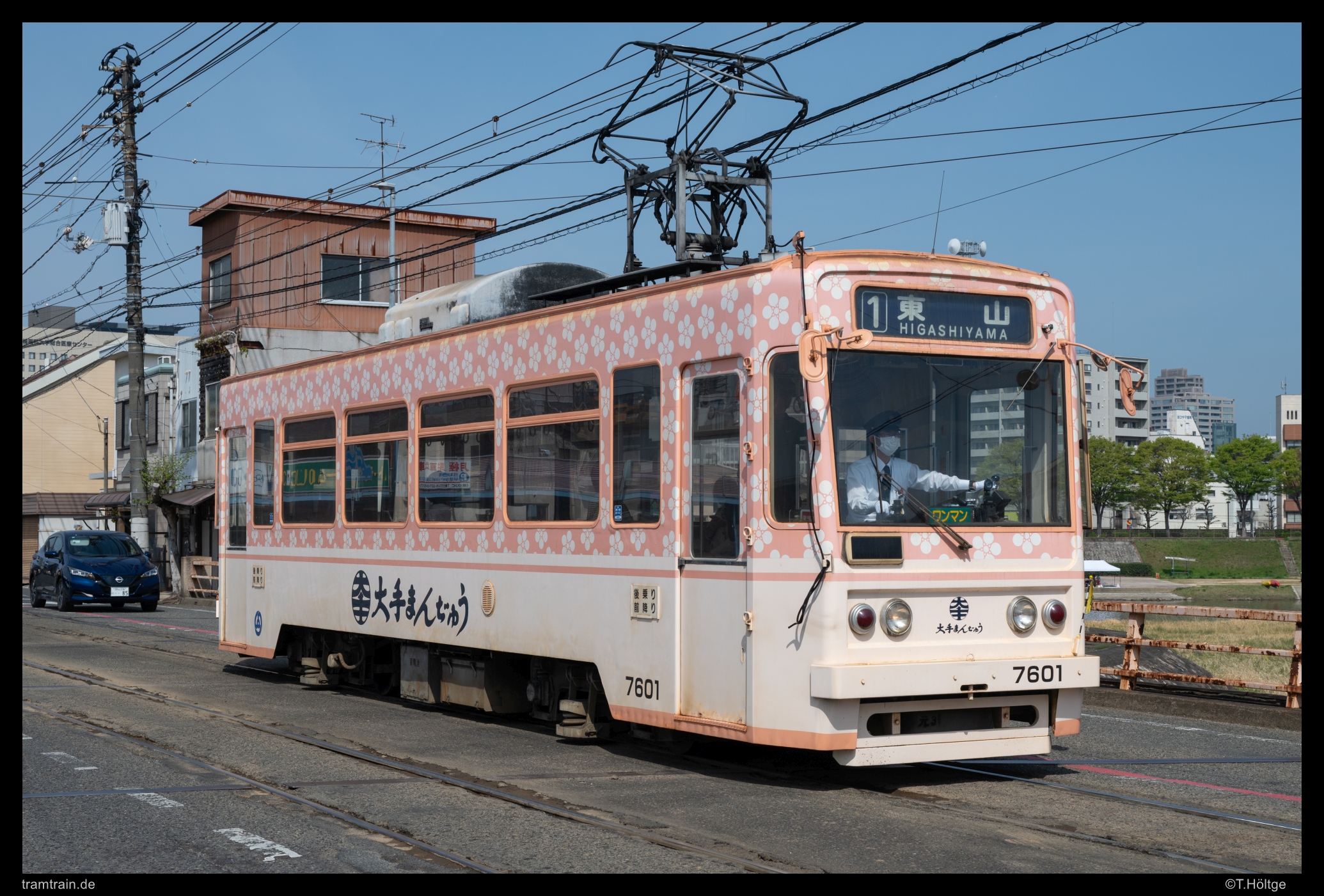 Noch einmal die mittlere Brücke, jetzt mit Kirschblüte und Wagen 7601. Erstaunlich unordentlicher Bruch steht auf den Inseln teilweise herum.