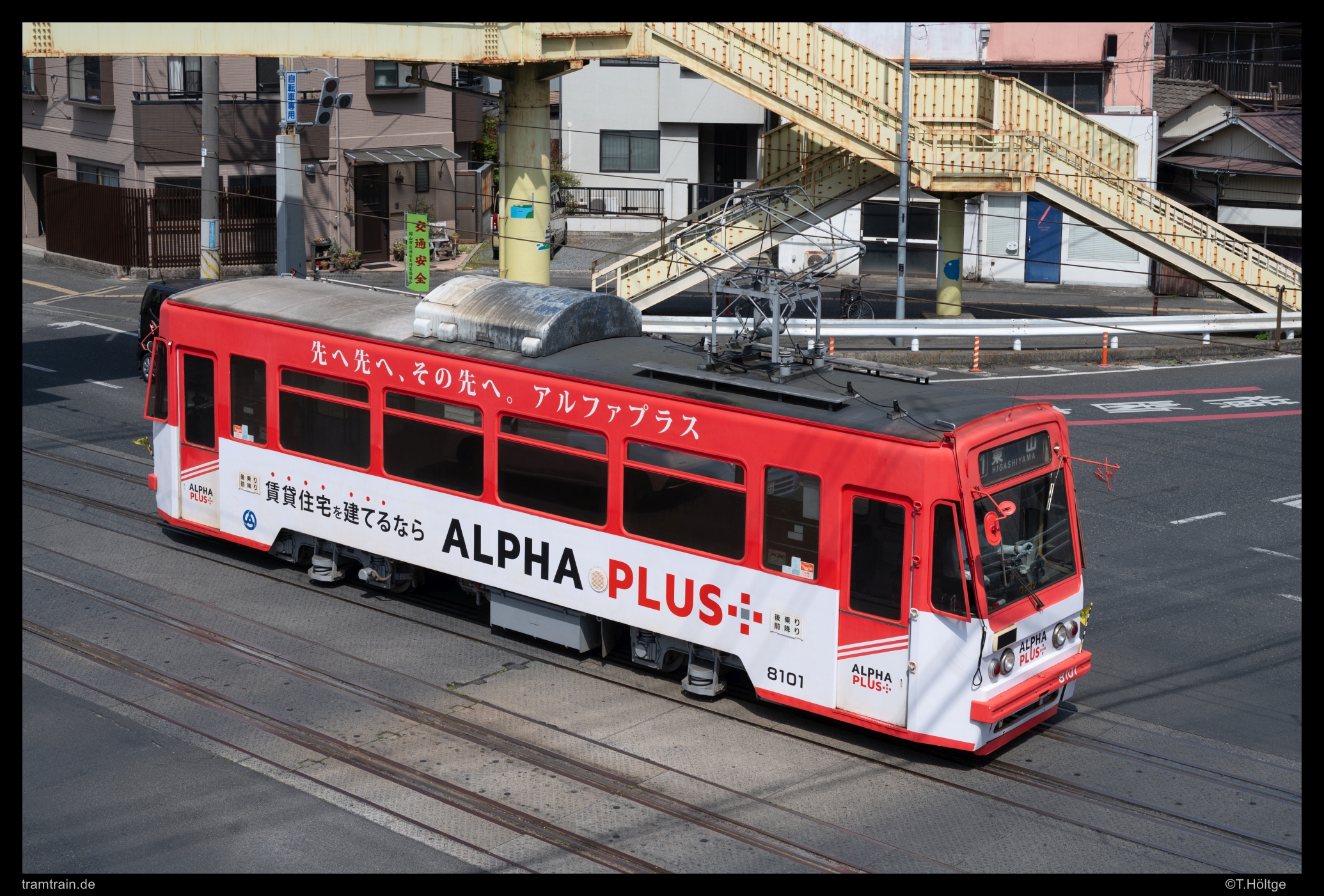 Nachdem es auf den drei Asahi-Brücken und der nachfolgenden Wohnstraße mal etwas gemütlicher zuging, schwenkt die Strecke zwischen den Haltestellen Chunagon und Kadotayashiki direkt wieder an eine der breiten Hauptstraßen. Zur Entschädigung gibt’s dafür wieder Fußgängerbrücken. Wagen 8101 hat nach weiteren 400m bereits das Streckenende Higashiyama erreicht.