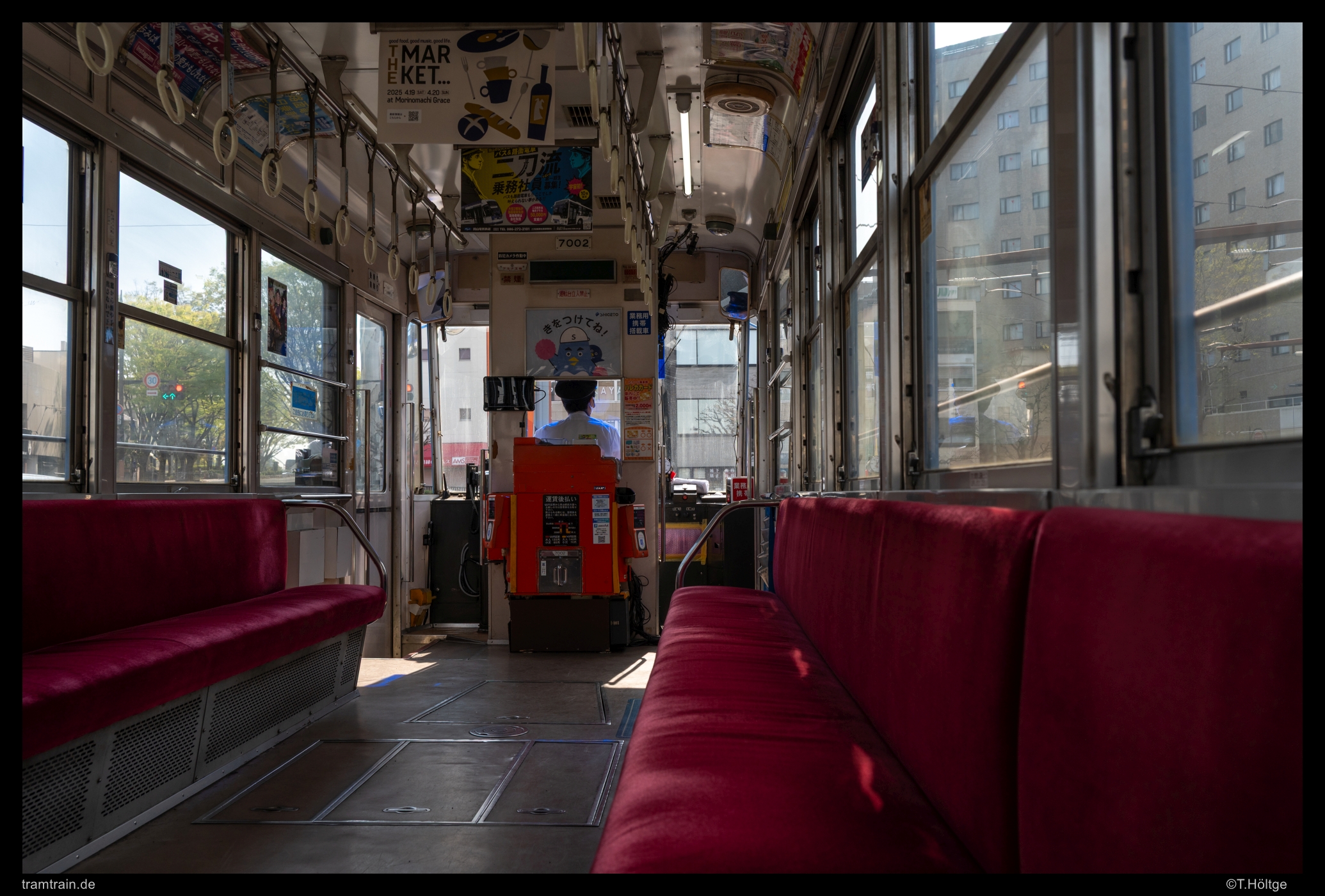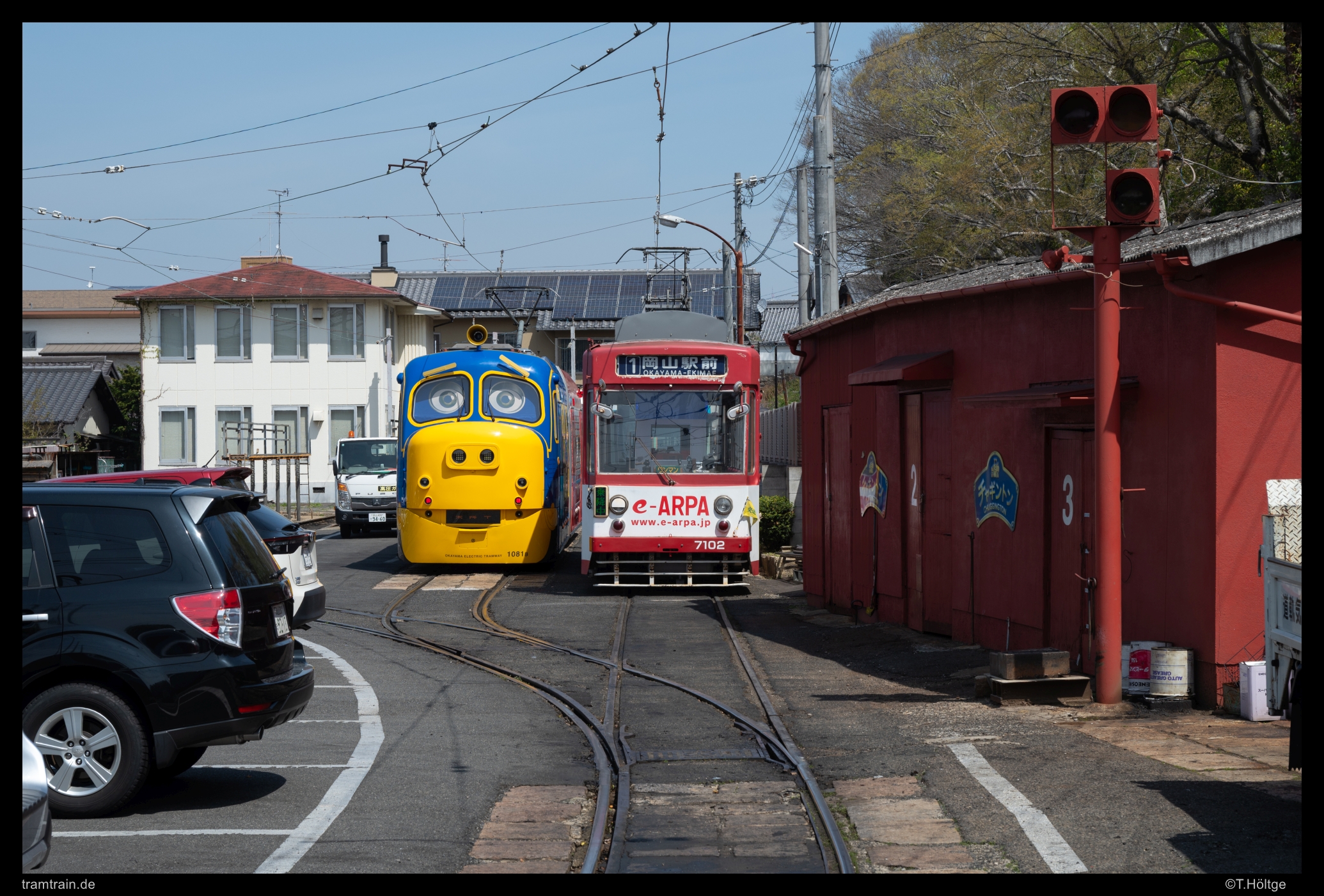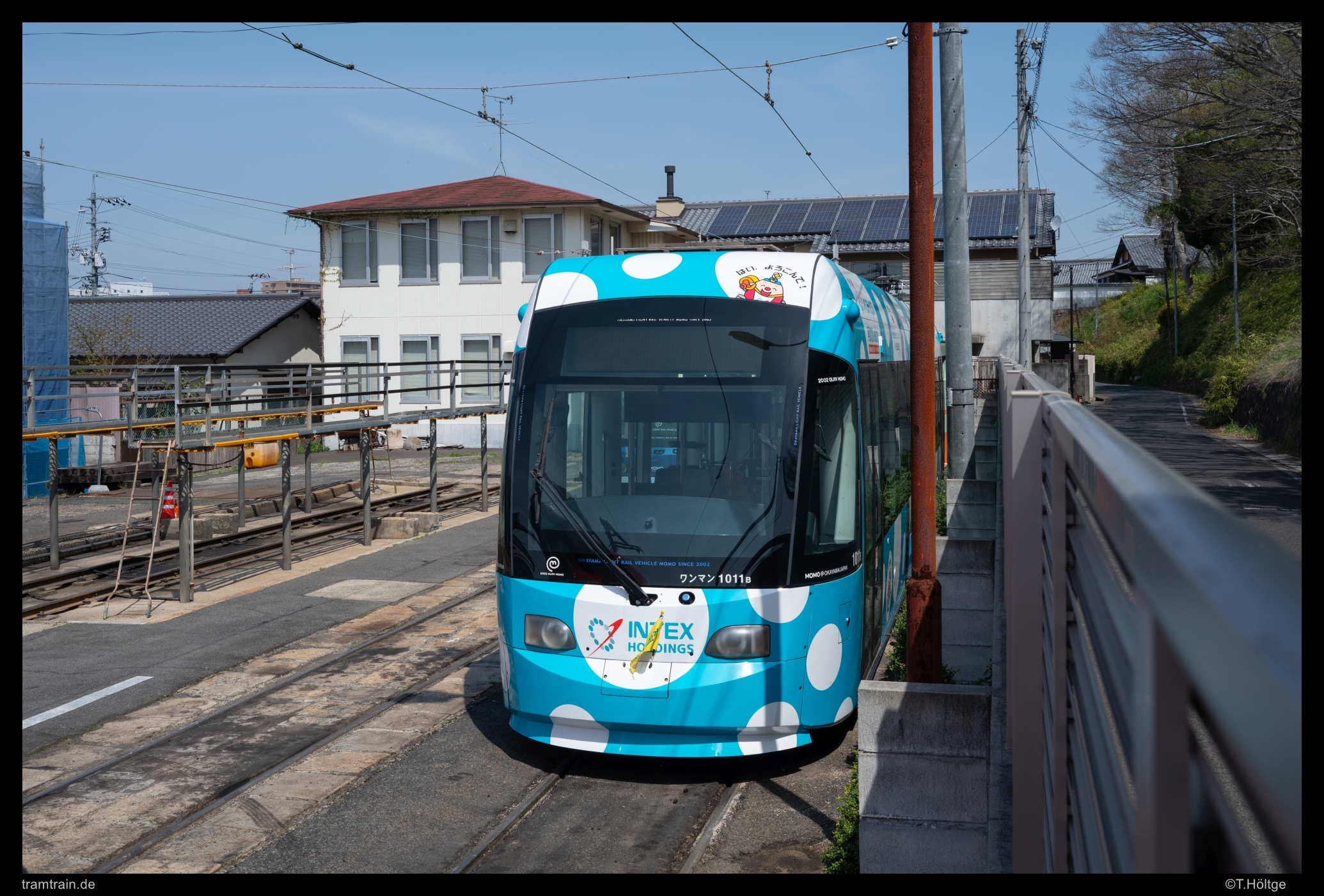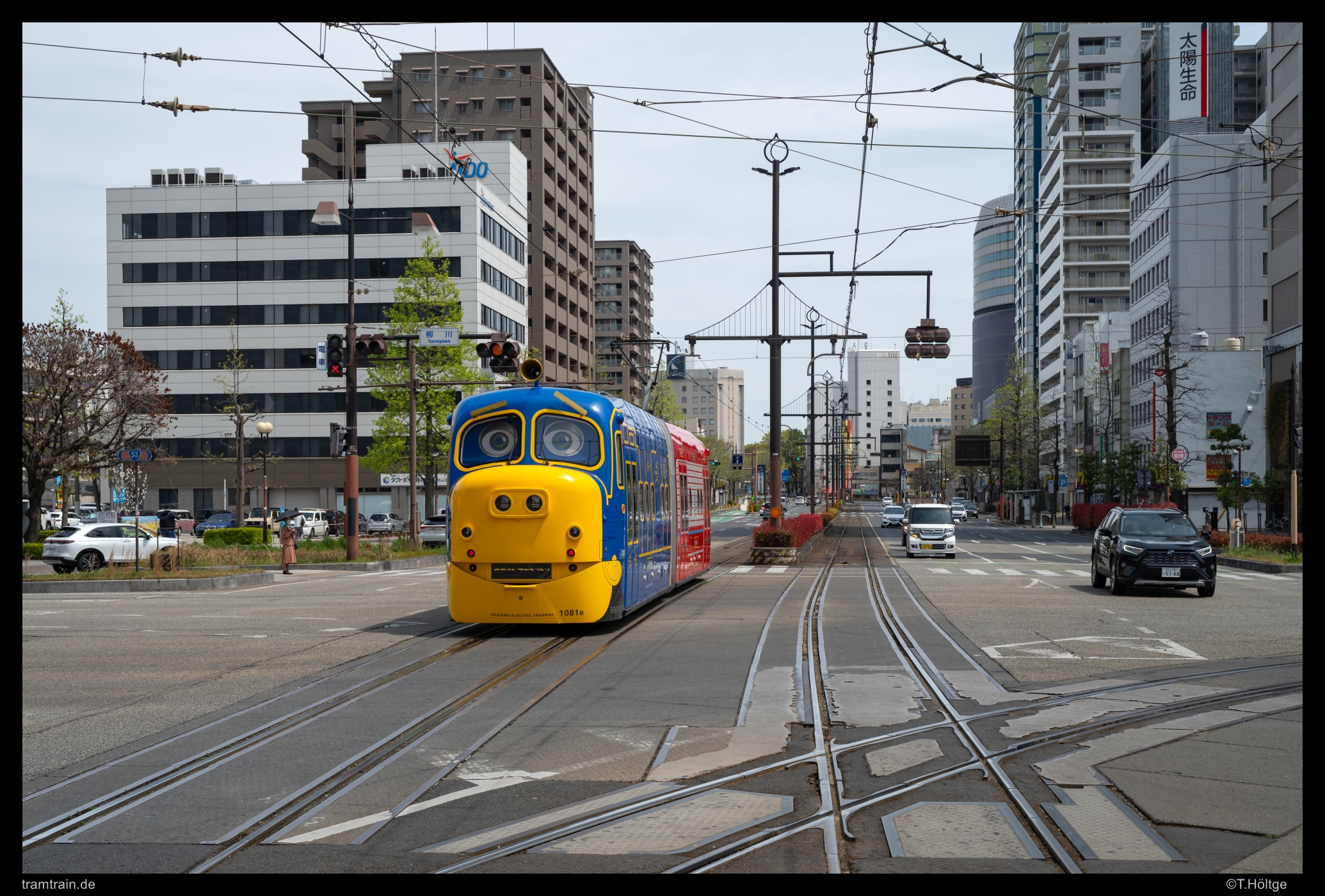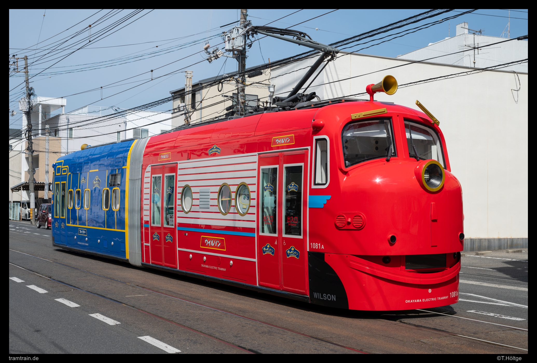 Wagen 1081 dreht als “Chuggington-Train” seine Runden durch Okayama. Dass die knappen Investitionsmittel nun ausgerechnet für einen neuen Niederflurwagen eingesetzt wurden, der ausschließlich für Sonderfahrten genutzt wird, erscheint erstmal etwas seltsam. Zumindest schienen die Fahrten zum Sondertarif gut angenommen. Die drei täglichen, in der Regel Samstag bis Montag und in den Ferien angebotenen Fahrten, dauern rund eine Stunde mit Pause am Betriebshof und starten und enden jeweils am Bahnhof.