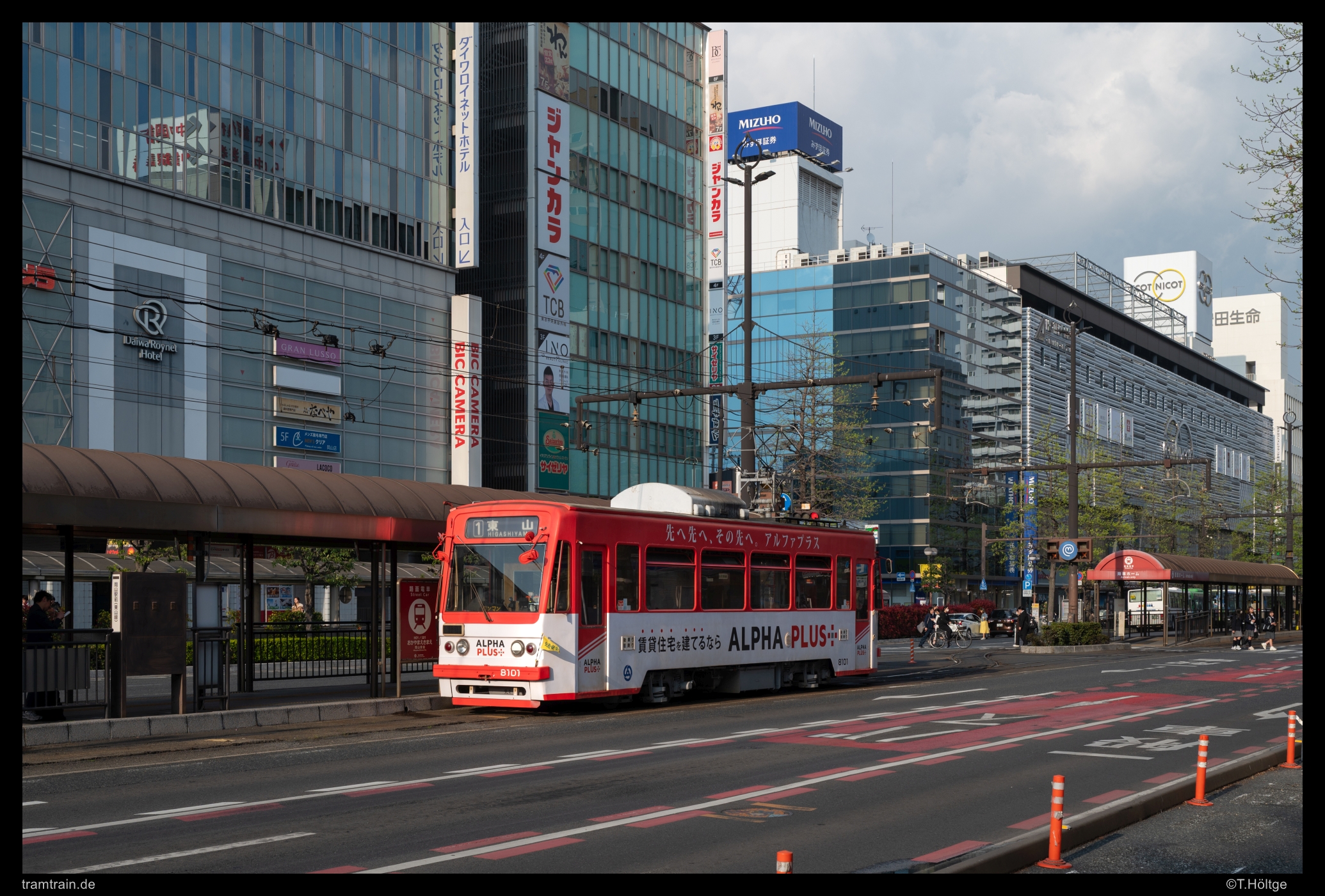 Ich bin noch einmal an der Linie 1, nun am östlichen Ende der drei Asahi-Brücken. Die nächste Haltestelle Saidaijicho befindet sich erst hinter der nächsten Ecke, an einem der südlichen Eingänge in die überdachten Einkaufsstraßen. Hier hing für japanische Verhältnisse fast schon verlotterte Klientel herum. Wagen 7601 hält auf dem Weg zum Bahnhof.