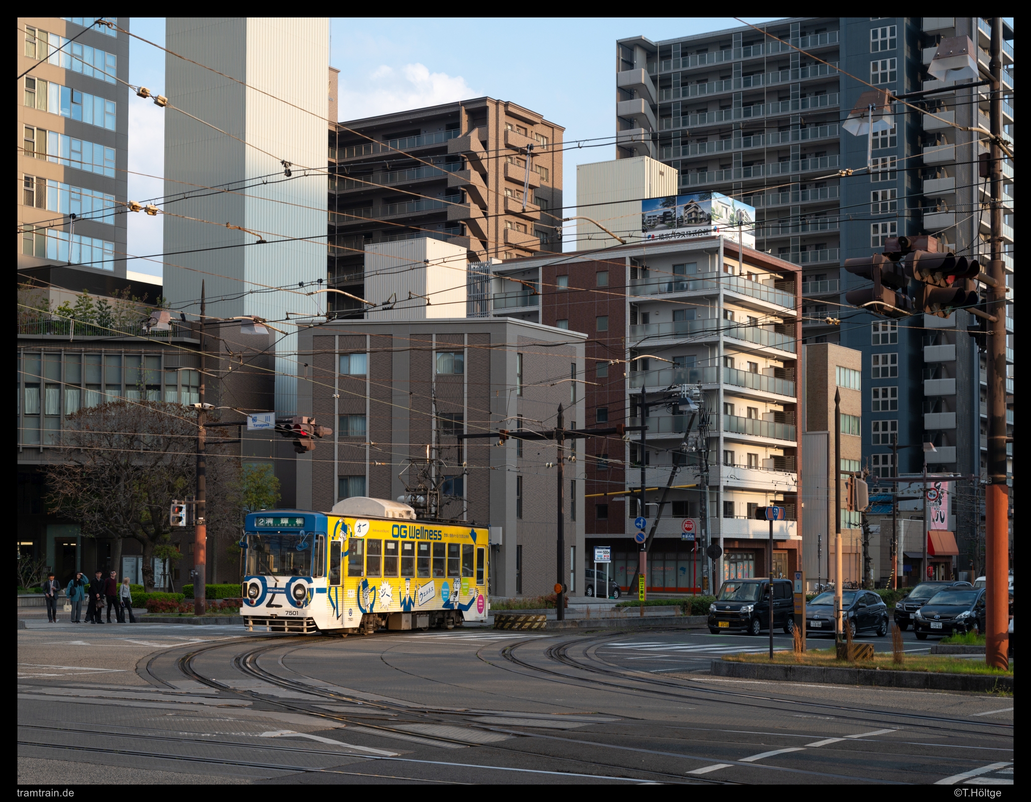 Weil es so schön skurril ist, auch noch einmal die B-Ansicht. Die Haltestelle Yanagawa ist übrigens auch nicht ganz uninteressant: Hier gibt es am schmalen Mittelbahnsteig für beide Linien getrennte Haltepositionen und zudem noch mit Lücken im Zaun genaue Bereiche, in denen die Türen zum Stehen kommen müssen. Nicht ganz einfach, wenn man zur hinteren Position möchte, an der vorderen aber schon eine große Schlange steht. Aber in Japan an der Haltestelle nicht schnell genug zu sein und nicht mitzukommen, dafür muss schon einiges passieren. Also alles getreu dem Titel dieser Serie.