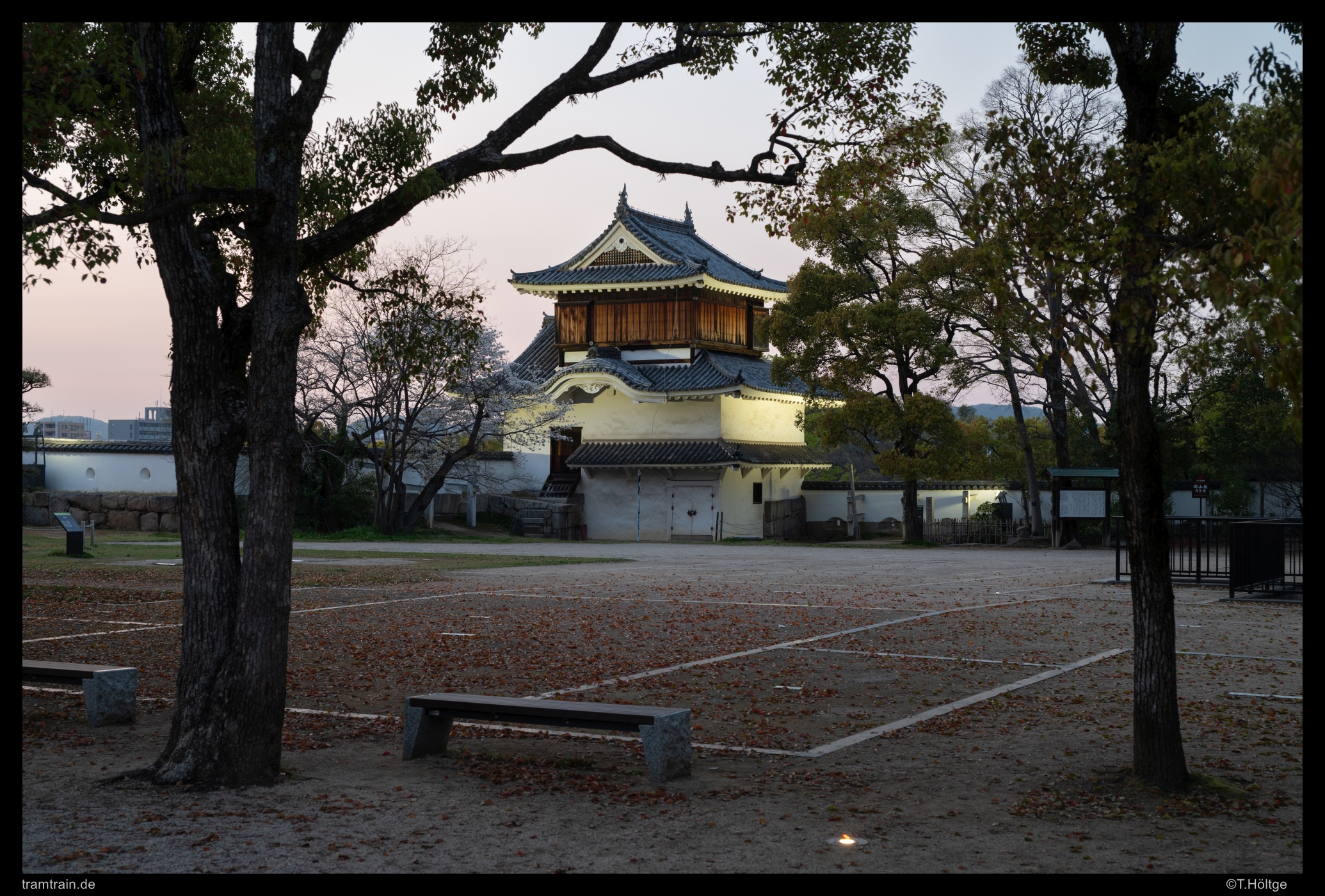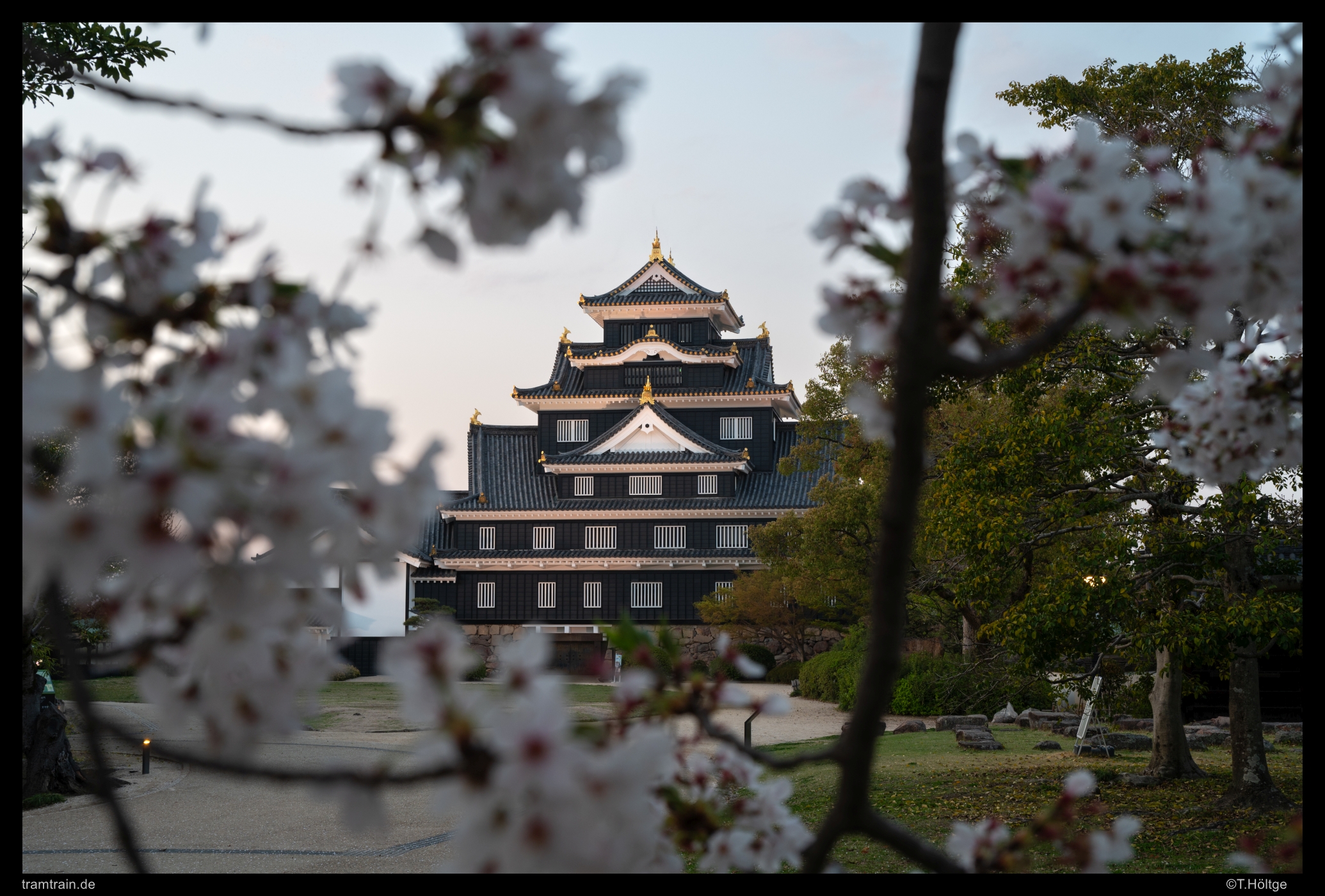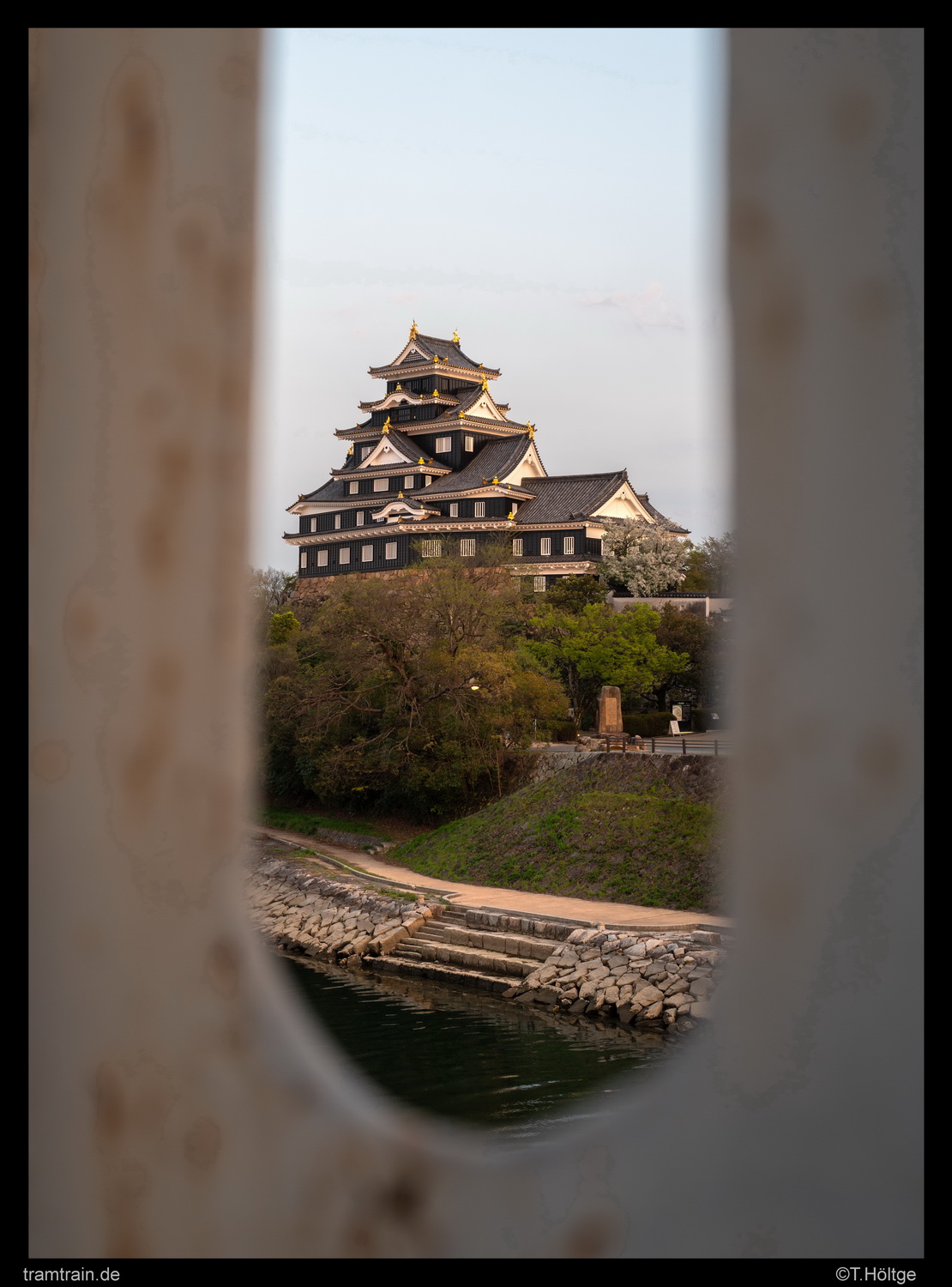 Die Sonne war jetzt weg und der Verkehr war hier zur Rush Hour schon wieder der absolute Overkill gewesen – kein Wunder, was treiben wir uns auch immer an den breitesten Straßen der Stadt herum… Wir wollten das Restlicht stattdessen etwas ruhiger ausklingen lassen und liefen mal die wenigen Meter an den Asahi River hinüber, wo sich hübsch in einer Flusskurve gelegen, auch das Okayama Castle befindet. Wir vertrödelten hier einfach die nächste Stunde bis in die blaue Stunde hinein, streiften etwas um das Castle und fanden einige nette Ausblicke auf die Anlage von der über den Asahi führenden Tsukimi-Fußgängerbrücke und dem gegenüberliegenden Ufer. Wiedermal eine erholsame Abwechslung auch für das stets Motive suchende Auge, dass von den üblichen japanischen Straßenansichten hin und wieder eine kurze Auszeit braucht. Fotografisch schon mal ein sehr schöner Tagesabschluss. Hier war übrigens absolut gar nichts los. Also von wegen, zur Kirschblüte tummeln sich überall im Land die Touristenmassen. Eher tummeln sie sich wohl dort noch mehr, wo sie sich eh schon tummeln. Beispielsweise im berühmten Japanischen Garten Kōraku-en, der sich auf der dem Castle am Fluss gegenüberliegenden Seite befindet. Der schließt aber schon um 18 Uhr, sodass davon nun auch keine “Gefahr” mehr ausging.