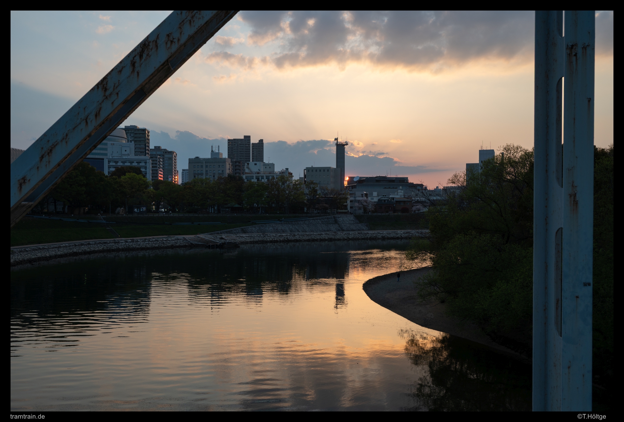 Nachdem wir etwa eine Stunde durch die Anlage geschlendert waren und hin und wieder interessiert das Treiben der Japaner beobachtet hatten – mal wurden umständliche Selfies geschossen, mal kam ein ganzer Tross samt Fotografen-Team in traditioneller Kleidung daher, andere hatten ihre Decken in einem erlaubten Bereich ausgebreitet und saßen plaudernd am Boden – wendeten wir uns wieder der Straßenbahn zu. Ich wollte noch einmal zur Asahi-Brücke um die Perspektive am östlichen Ende zu testen, andere hatten noch immer nicht genug vom Chuggington-Train 😉