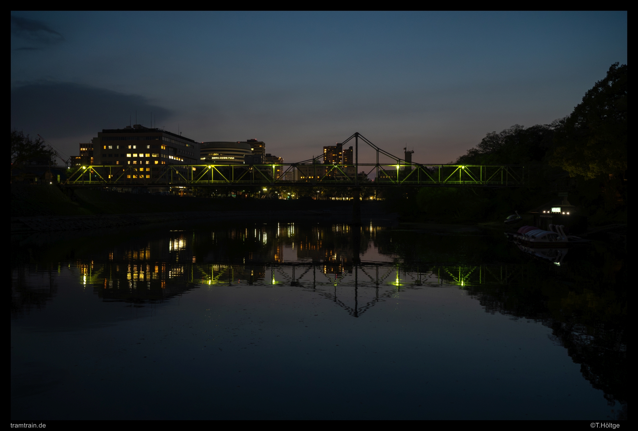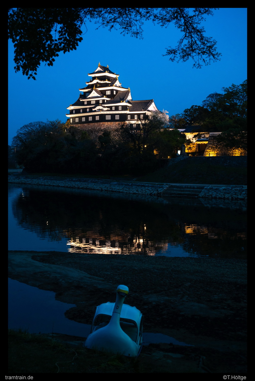 Pünktlich zur blauen Stunde wechselten wir an das dunkle, bewaldete Ufer des Asahi gegenüber des Castles. An einigen Stellen finden sich nette Durchblicke durch das Grün. Als bizarren Kontrast die etwas Lost-Place-Atmosphäre verströmende Tretbootente mit aufzunehmen, konnte ich mir nicht verkneifen.