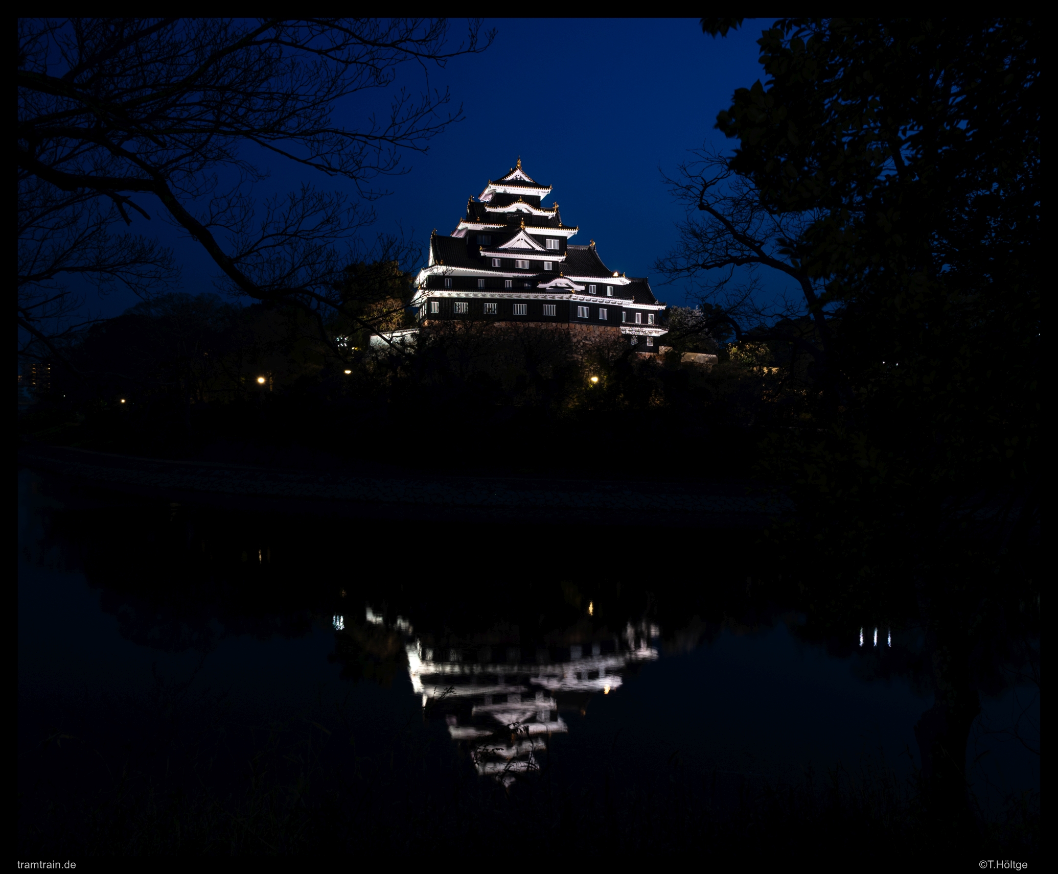 Na gut, dann auch nochmal als perfekte Illusion ohne störendes Beiwerk: Okayama Castle zur blauen Stunde spiegelt sich im Asahi River.