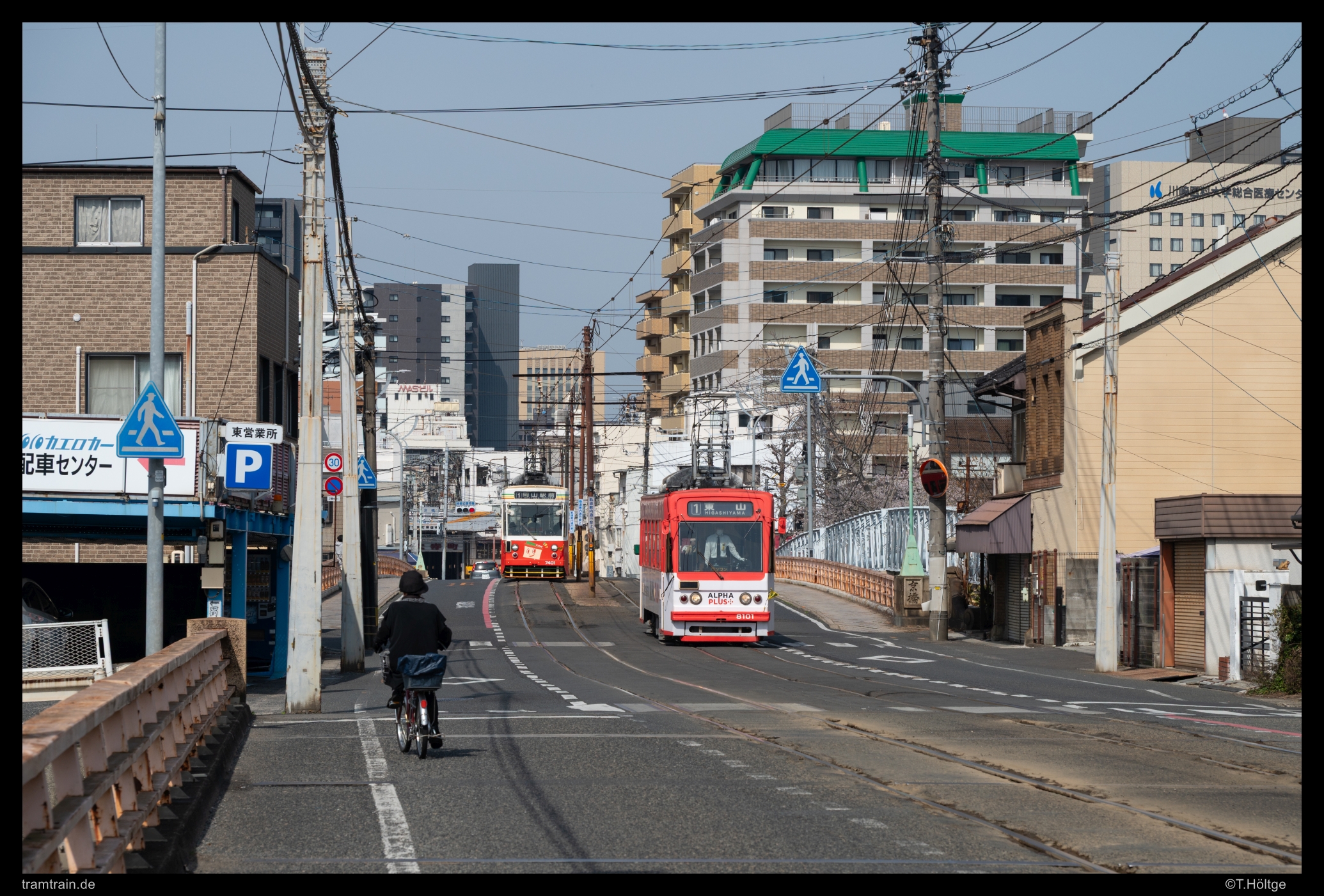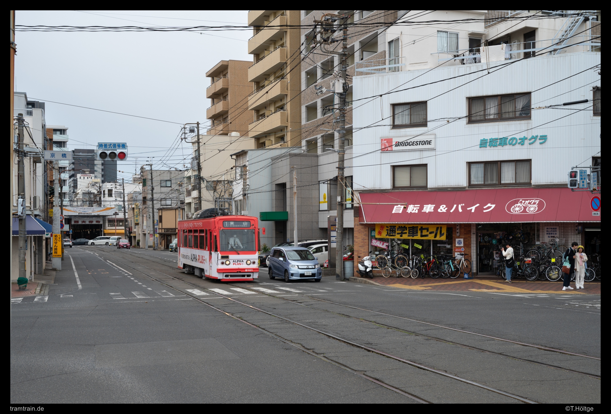 Wenige Meter weiter erreicht 8101 die Kreuzung unmittelbar vor dem Beginn der Brücke. Auf der Ecke ein großer Fahrradladen. Die Fahrradkultur in Japan ist auch eine ganz Eigene: Es wird zwar durchaus Fahrrad gefahren, allerdings ist die eigene Infrastruktur eher dürftig bis nicht vorhanden, sodass mehr oder weniger kreuz und quer gefahren wird, meist aber auf den Fußwegen, sofern welche vorhanden. Hier gilt dann aber “Don’t Rush!” wie sonst nur auf Rolltreppen zum Shinkansen. Oft mit hollandradähnlichen, schaltungslosen Gefährten wird eine Geschwindigkeit an den Tag gelegt, bei der es eine eigene Kunstform zu sein scheint, nicht umzukippen. So schwimmen auch in größeren Fußgängerströmen häufig einfach die Drahtesel mit, nicht selten mit Lenkern, älter als das Wort “Drahtesel”. Gemächlich werden Hindernisse und Passanten umkurvt, der Kurs knapp über Schritttempo ist kaum vorhersehbarer als bei Fußgängern. Von der Reisegeschwindigkeit bringt es kaum einen Vorteil, aber man kann natürlich leichter etwas transportieren und für die teils sehr betagten Lenker ist es vielleicht auch angenehmer, als zu Fuß zu gehen und gar nicht in erster Linie die Geschwindigkeit entscheidend.