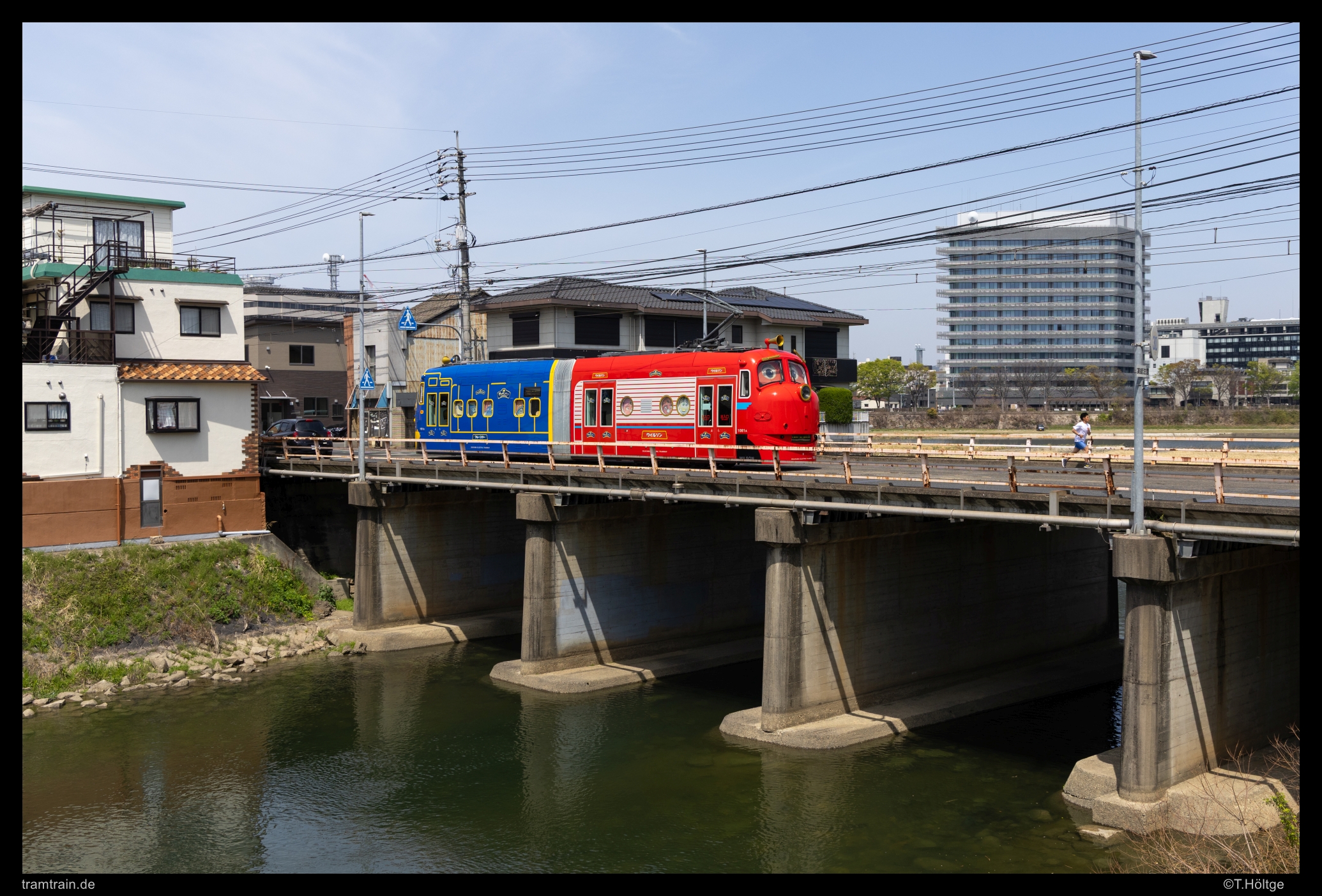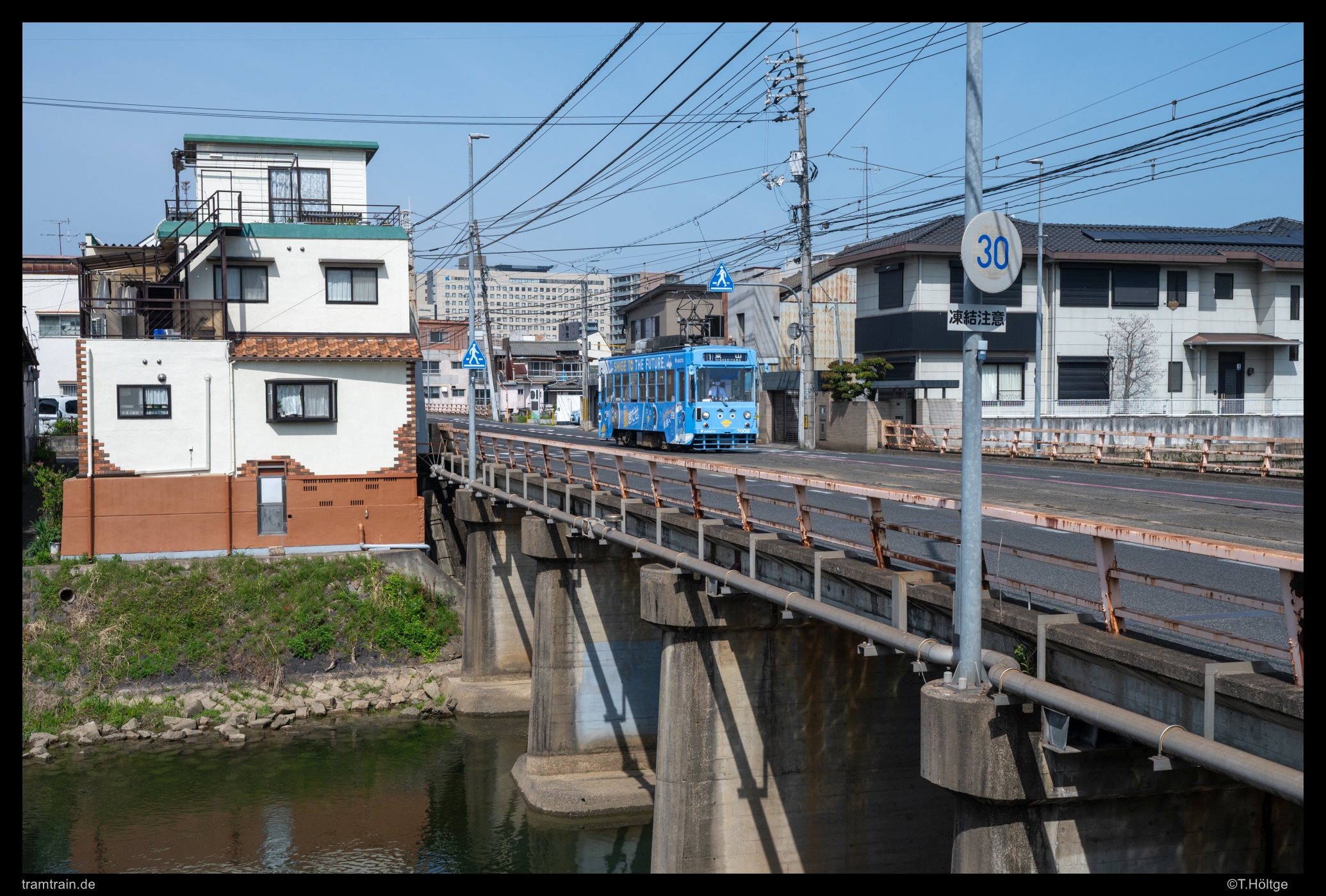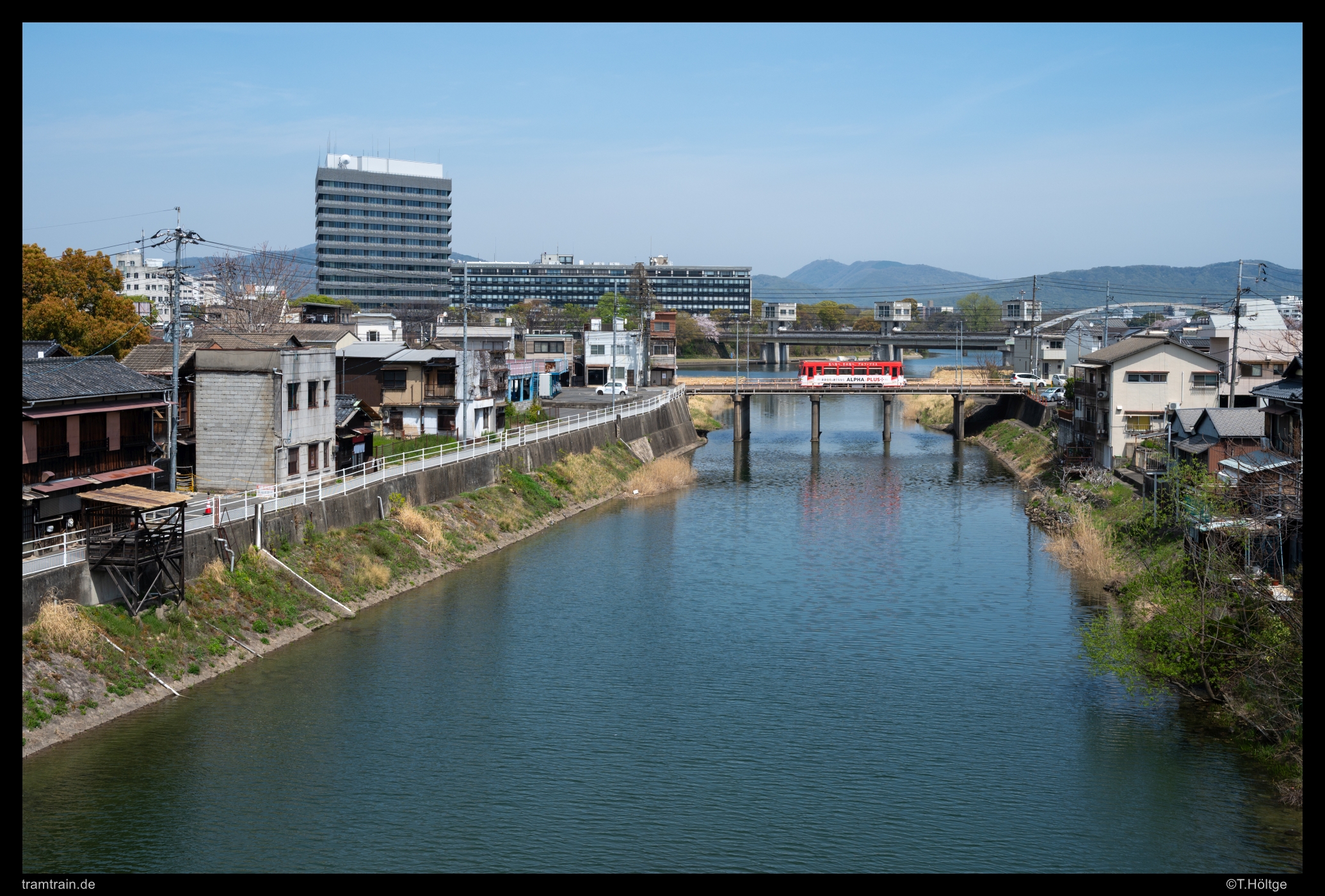Nach einem schnellen Frühstück im Bahnhof war die Grundlage für den Vormittag gelegt. Die Sonne strahlte vom Himmel, sodass wir keine weitere Zeit verloren. Tageskarten gab es auf der anderen Seite des Bahnhofes am Infocenter des Busbahnhofes. Ob wir die tatsächlich dort kauften, oder uns erstmals vom Fahrer welche ausstellen ließen – ich weiß es nicht mehr genau. Zumindest waren wir dann in Besitz von zwei Tageskarten und unsere Wege trennten sich dann auch bereits nach wenigen Minuten, da ich das Morgenlicht direkt an der großen Asahi-Querung der Linie 1 nutzen wollte. Über drei Brücken wird dort der Asahi River mit zwei kleinen Flussinseln überquert und eigentlich bietet sich auch nur hier ein wenig Abwechslung im sonst dominierenden, bekannten Stadtbild-Einerlei des kleinen Netzes. Einerseits durch die Brücken und den Blick auf oder über den Fluss selbst, andererseits aber auch durch die niedrige etwas wilde Bebauung sticht dieser kurze Abschnitt heraus. Teilweise fast schon untypische “Bretterbuden” standen auf den Inseln herum und es wirkte für japanische Verhältnisse an manchen Stellen regelrecht unordentlich. Eine nette Abwechslung zumindest, welchen Hintergrund auch immer dieses Viertel haben mag.