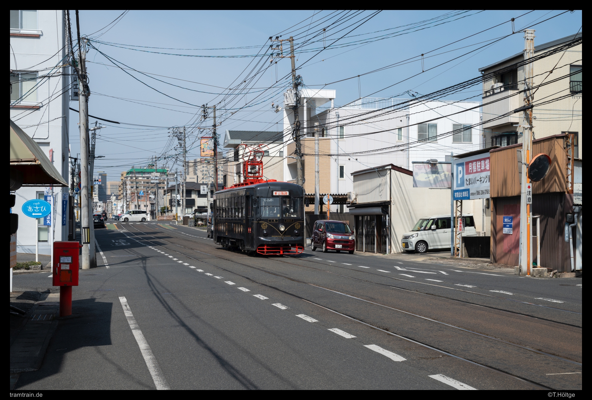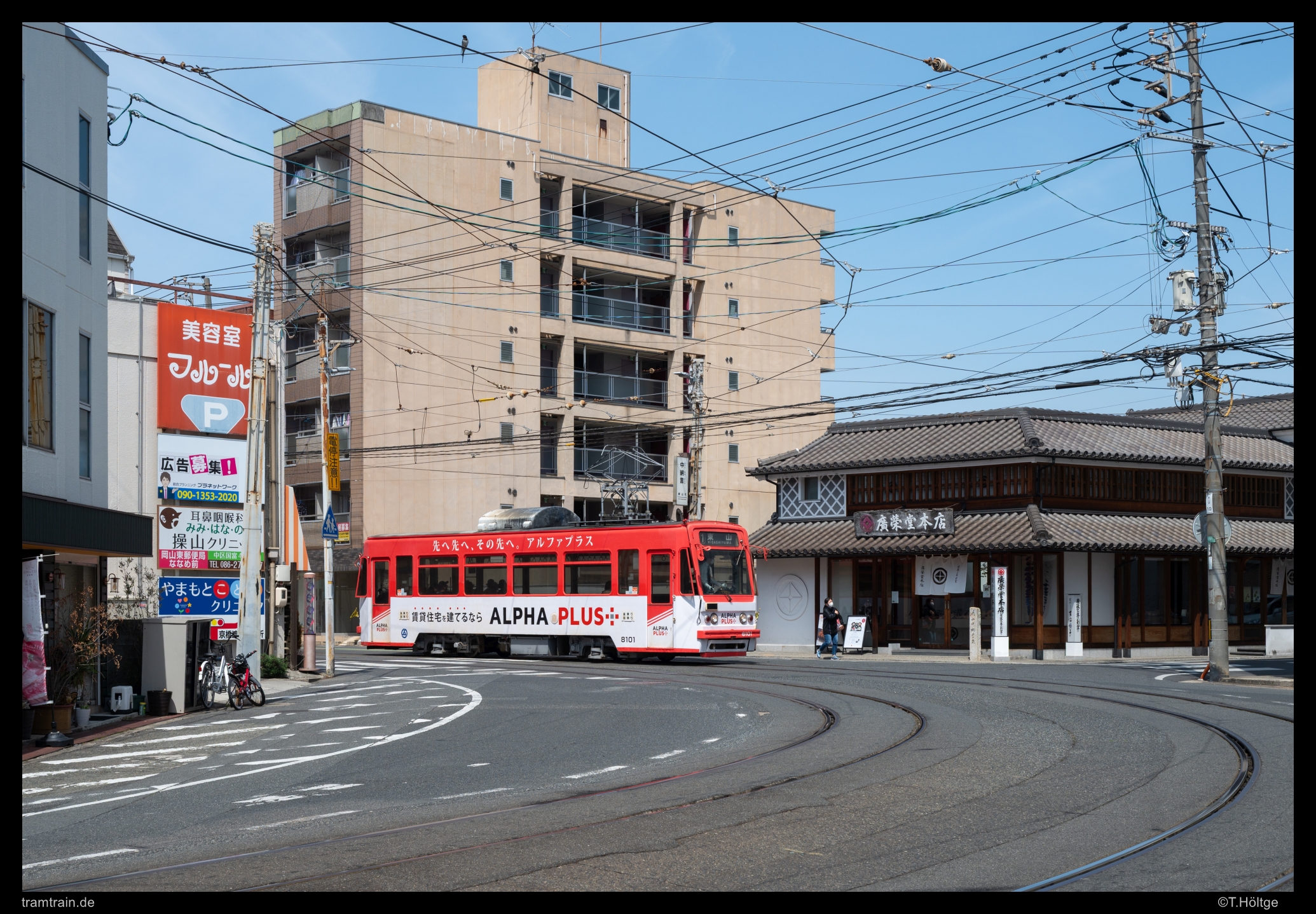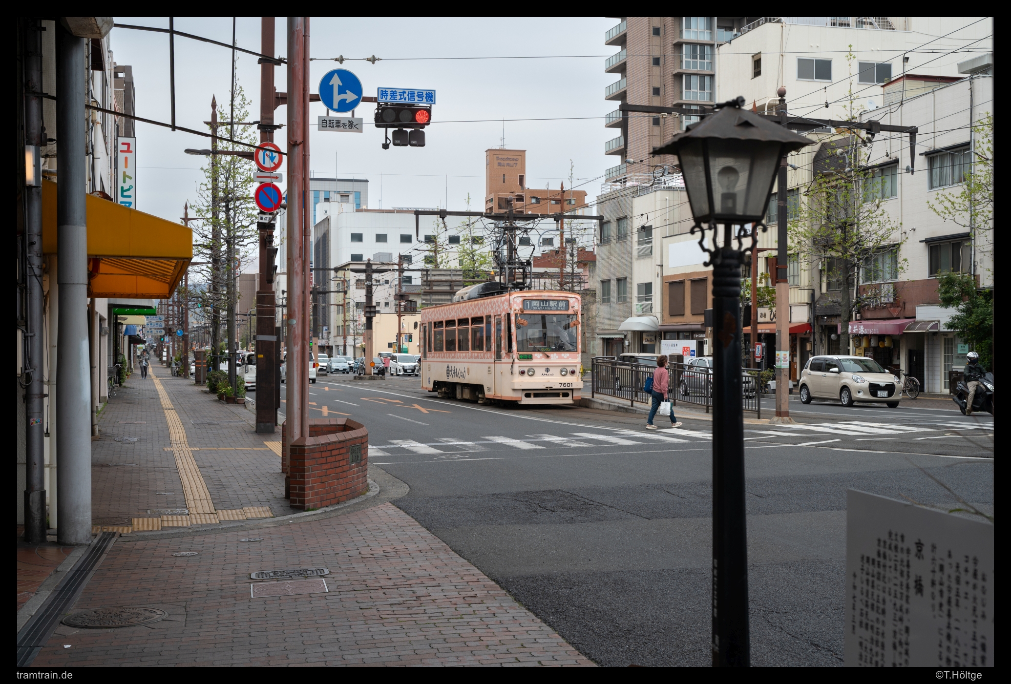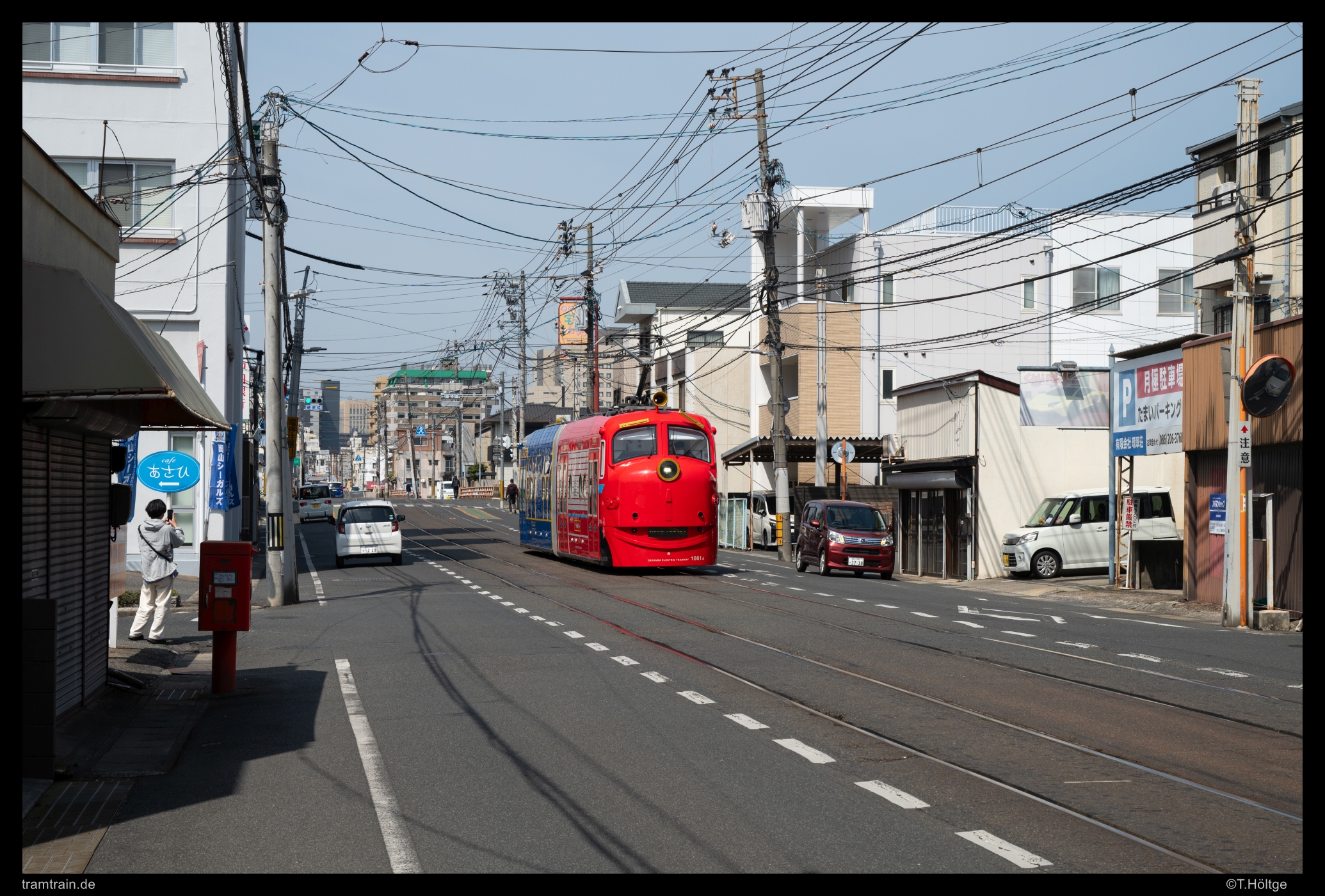 Der im letzten Bild links erkennbare Smartphone-Knipser war übrigens einer der wenigen, Fremden gegenüber gesprächigen Japaner. Er kam zwar etwas verhalten auf mich zu, fragte dann aber doch was ich hier triebe und anschließend, warum es mich ausgerechnet zu den japanischen Straßenbahnen und nach Okayama verschlagen hatte. Tja, aus deutscher Perspektive scheint die Antwort einfach, wo fährt bei uns schon noch solches Geraffel durch die Gegend wie hier. Ein absolut einzigartiges Straßenbahnland. Sehr offensiv wurde es dann, als er wenig später an der Endstation mit seinem Drahtesel angeschaukelt kam und uns in das Restaurant irgendwelcher Bekannter einladen wollte. War das jetzt Nepp, suchte er auf der Straße nach Kundschaft für die Lokalität seiner Familie? Das wäre wirklich sehr untypisch für Japan. Vielleicht war es aber auch einfach nur eine höfliche Geste. Eine nette Abwechslung zur japanischen Distanz war es aber in jedem Fall gewesen. Wir hätten aber so oder so ablehnen müssen, da wir heute Abend bereits in Kyōto wären.