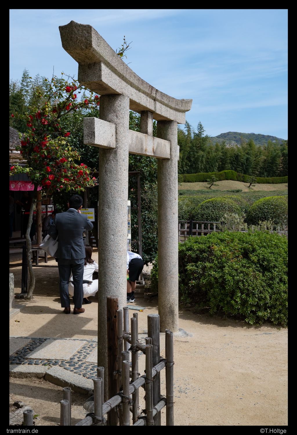 Zum anbrechenden Hochlicht mischte sich jetzt auch noch zunehmend Siff am Himmel. Für uns das Zeichen, dass vorerst keine besseren Aufnahmen mehr entstehen würden und eigentlich war auch nicht mehr wirklich etwas offen. Einzig die drei Brücken nochmal aus der Nachmittagsperspektive, aber dazu müsste dann auch Sonne sein. Bis dahin wollten wir uns jetzt mal die größte Bekanntheit der Stadt ansehen, den großen japanischen Garten Kōraku-en. Dorthin nahmen wir dann doch mal wieder die Straßenbahn und erlegten beim Umsteigen an der Station Yanagawa den Chuggington Train noch ein letztes Mal. Die 400 in die Tageskarte investierten Yen mussten sich schließlich noch rentieren, nachdem ich den Vormittag doch größtenteils zu Fuß entlang der Strecke unterwegs gewesen war.