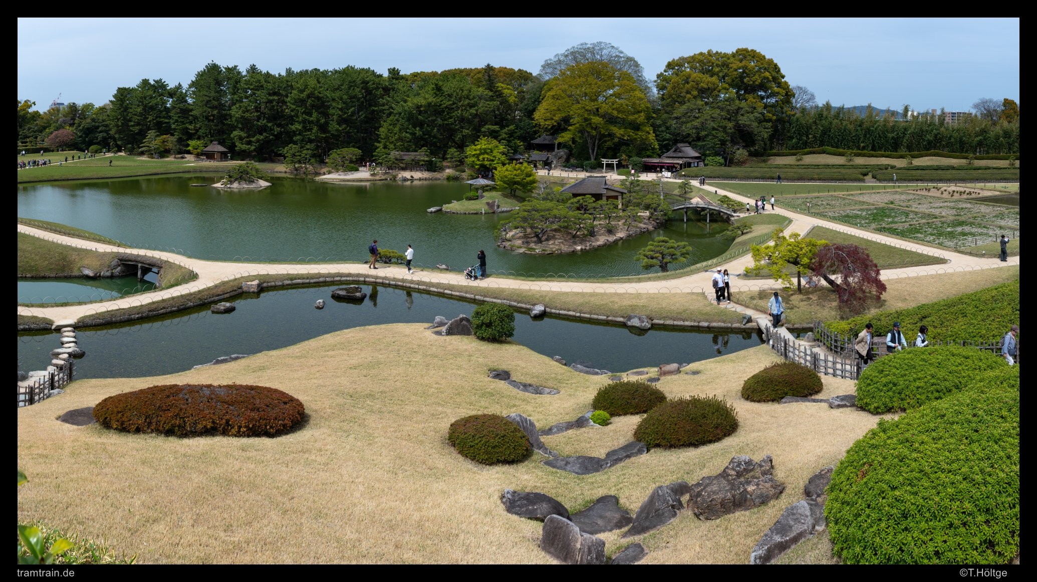 Zunächst ein Überblick von einem kleinen Steinhügel über einen Teil der Anlage. Kōraku-en ist neben Kairaku-en in Mito und Kenroku-en in Kanazawa einer der Drei berühmten Gärten Japans (Nihon Sanmeien). Wikipedia weiß dazu: Die Drei berühmten Gärten Japans (japanisch 日本三名園 Nihon Sanmeien) sind die, die alle Anforderungen an einen perfekten Landschaftsgarten nach den Chroniken der berühmten Luoyang-Gärten, einem antiken chinesischen Gartenbuch des Dichters Lǐ Géfēi, erfüllen: Weitläufigkeit und Abgeschiedenheit, Kunstfertigkeit und Althergebrachtes, fließendes Wasser und Panoramablick.