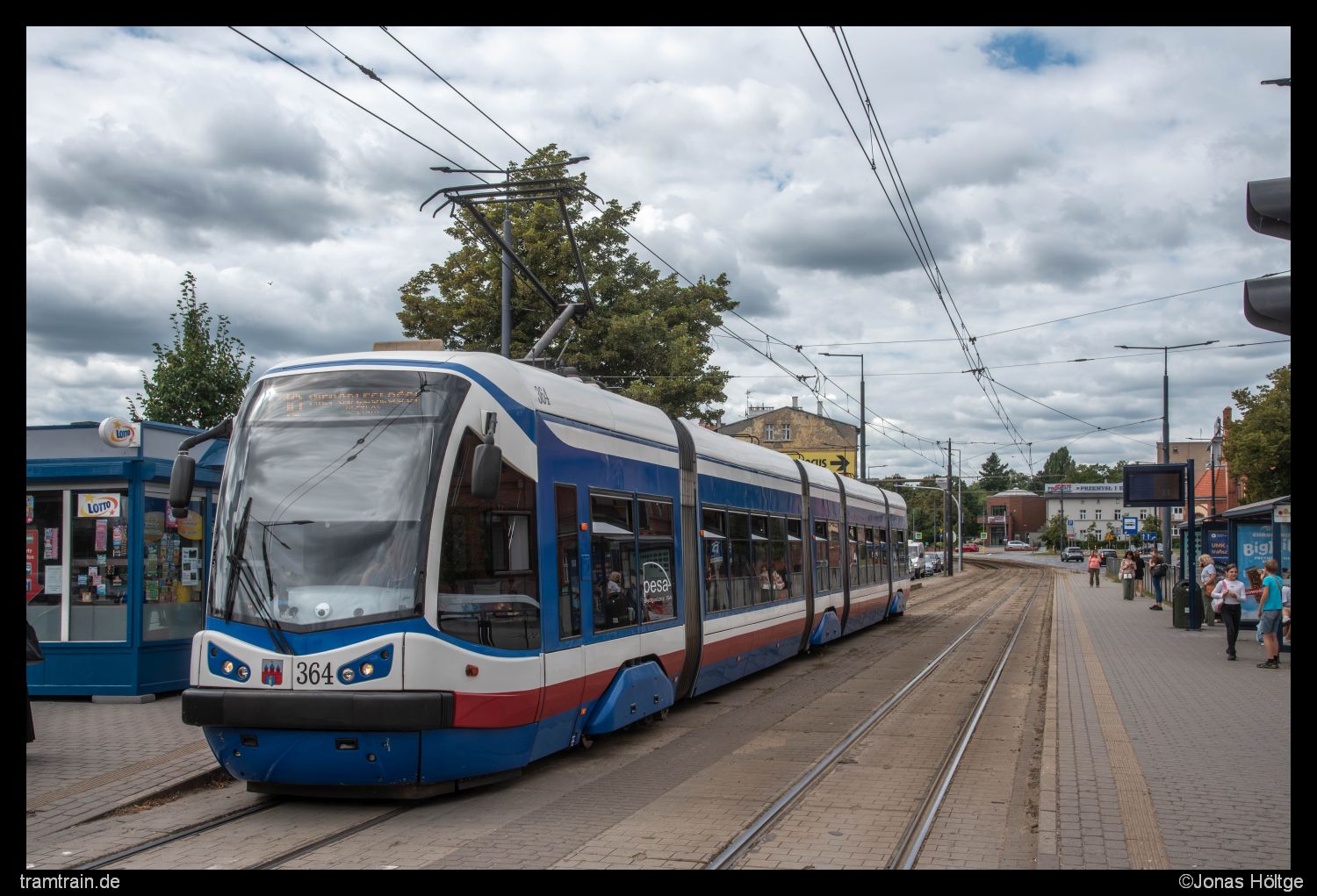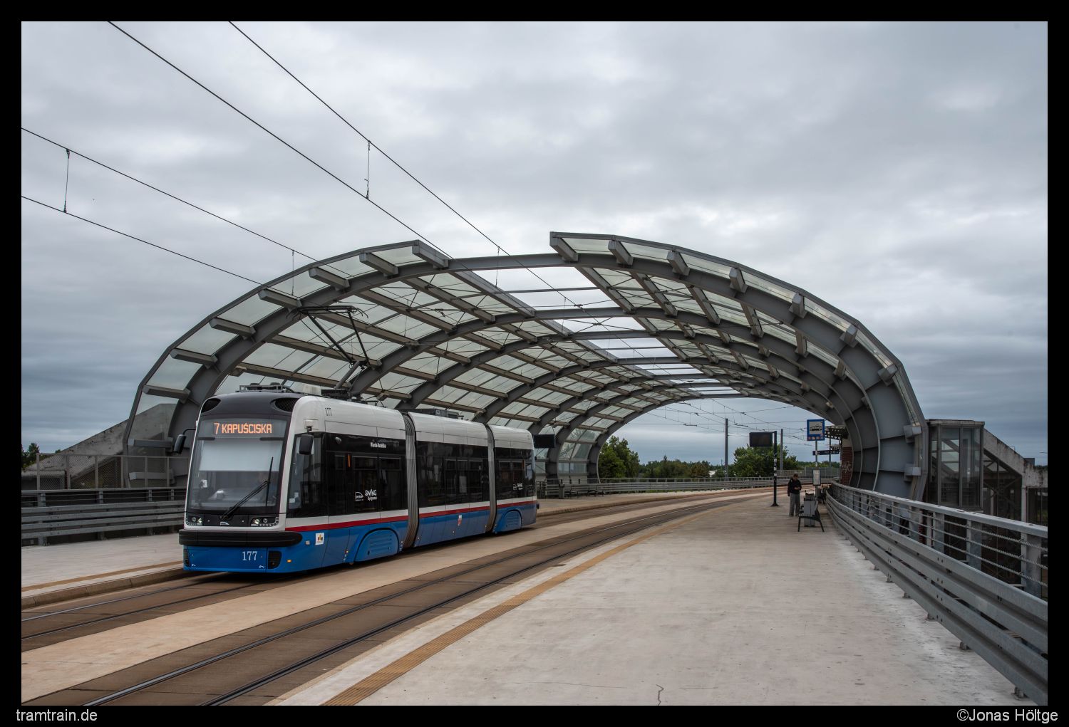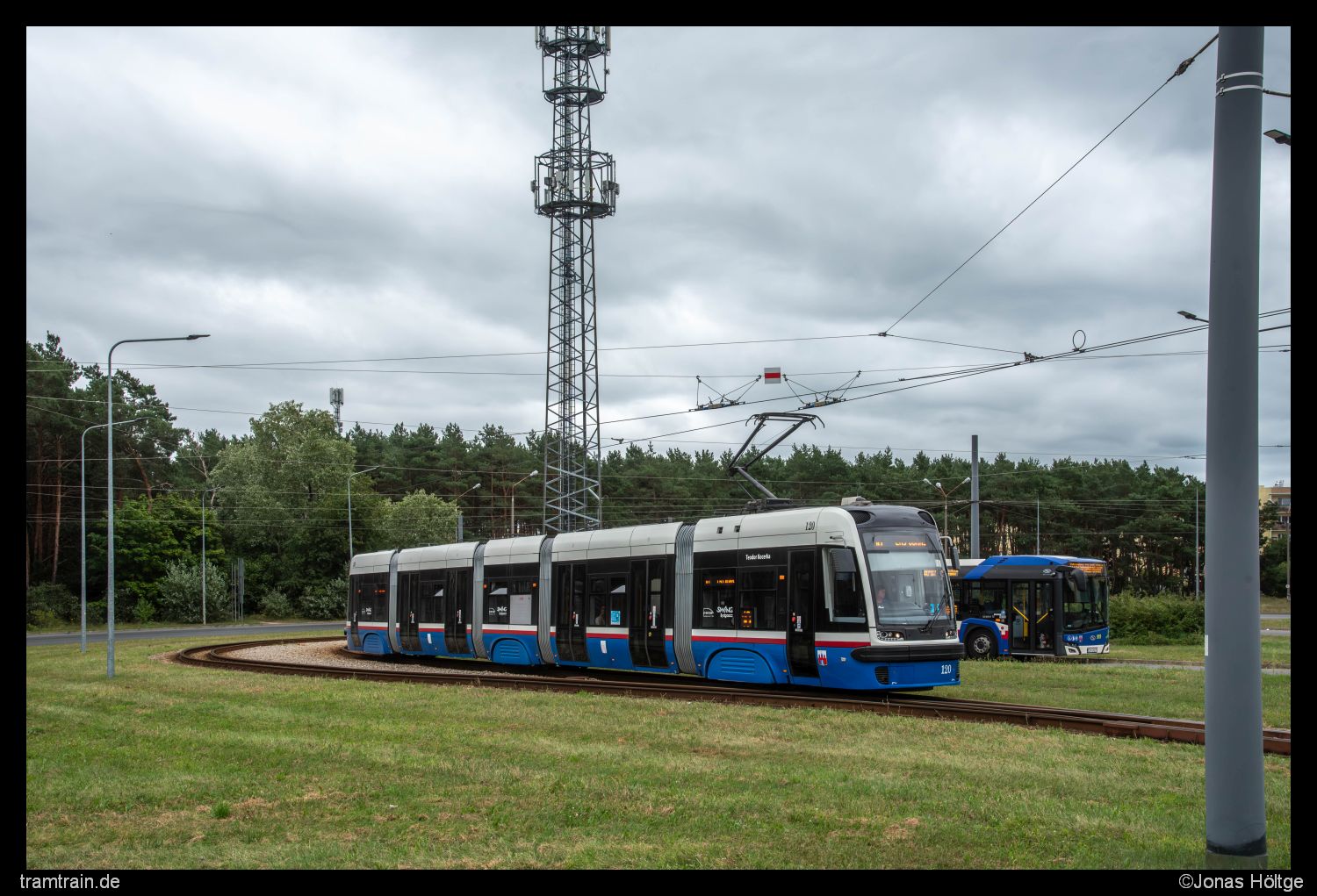 Zu gewohnter Uhrzeit klingelte der Wecker. Ich wollte heute keine Zeit verschwenden, indem ich später als gewohnt aufstehe, denn das Programm für heute war durchaus gut gefüllt. Zunächst wollte ich die erste Hälfte des Tages noch hier in Bromberg nutzen, um offene Punkte auf meiner Liste abzuarbeiten. Ganz oben auf meiner Liste standen dabei natürlich die Altwagen, die sich im gestrigen Sonntagsverkehr nicht gezeigt hatten. Zudem wollte ich mich heute dem langen Linienast nach Łoskoń annehmen, den ich gestern nicht mehr geschafft hatte. Da dort auch jeden Menge Linien rausfahren sollten, würde ich an der Strecke relativ viel vom Auslauf des heutigen Tages mitbekommen. Ein Blick aus dem Fenster am Morgen brachte jedoch einen kleinen Dämpfer. Völlig Wolken-verhangen präsentierte sich der Tag zu Beginn. Ein Blick auf dem Wetterbericht machte auch nicht gerade viel Hoffnung, dass sich daran den Tag über irgendwas ändern sollte. Naja egal. Es half ja nichts. Trotzdem ging es erstmal aus dem Hotel und direkt zur Haltestelle. Von dort startete ich in Richtung Łoskoń. Bis zur Station Most Kazimierza Wielkiego kannte ich die Strecke ja schon von gestern, sodass ich auf diesem Stück nicht nochmal aussteigen musste. Zudem war das Wetter auch deutlich bescheidener als gestern, sodass die Bilder ohnehin nicht so schön geworden wären. Daher hielt ich aus dem Fenster heraus erstmal nur Ausschau, was so an Bahnen an mir vorbeizogen. Zu meiner Enttäuschung waren jedoch weder Konstal 805Na noch der eine Konstal 805NM unter den vorbeifahrenden Fahrzeugen. Zumindest der Wagen 364 zeigte sich, der gestern ebenfalls nicht in Betrieb gestanden hatte. Dabei handelt es sich um das einzig betriebsfähige Fahrzeug aus der nur zwei Fahrzeuge umfassenden Pesa Tramicus 122N Serie. Bis zur Station Dworzec Wschód verließ ich also zunächst nicht die Bahn, die interessante Haltestellenkonstruktion an der Haltestelle ließ mich dann doch rausspringen. Nach zwei Bildern an der Haltestelle selbst studierte ich mal den Fahrplan der einzelnen Linien. Klar war, dass es in den Ferien deutlich schwieriger sein würde, die Altwagen noch anzutreffen. Jedoch wurden selbst im Ferienfahrplan einige Kurse als Hochflurkurse ausgeschildert. Meine Hoffnung war also noch nicht ganz gestorben. Mit der nächsten Bahn ging es erstmal eine Ewigkeit ohne Zwischenhalt bis zur Station Akademicka/Rejewskiego weiter, an der ich auf die Rückkehr des Wagens 364 wartete und in der Zwischenzeit einige andere Bilder umsetzte.
