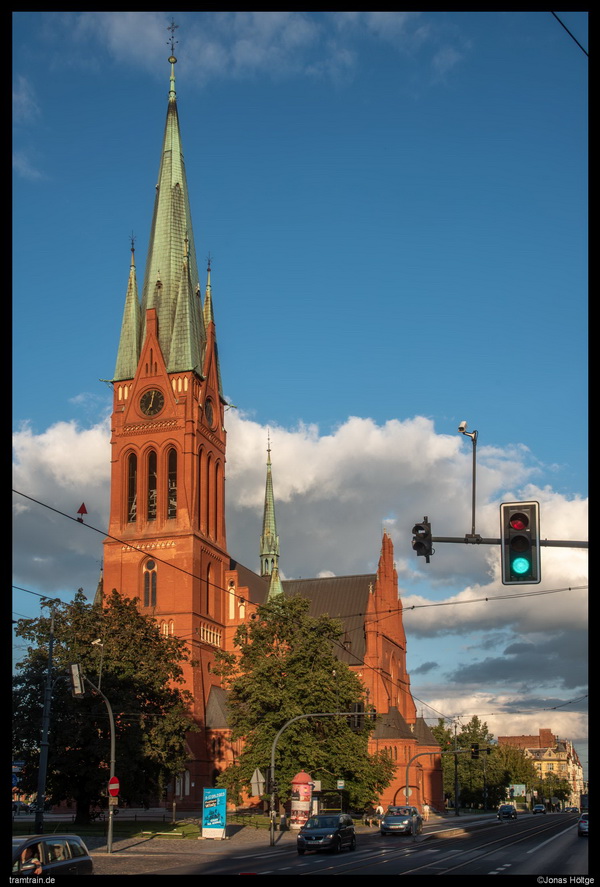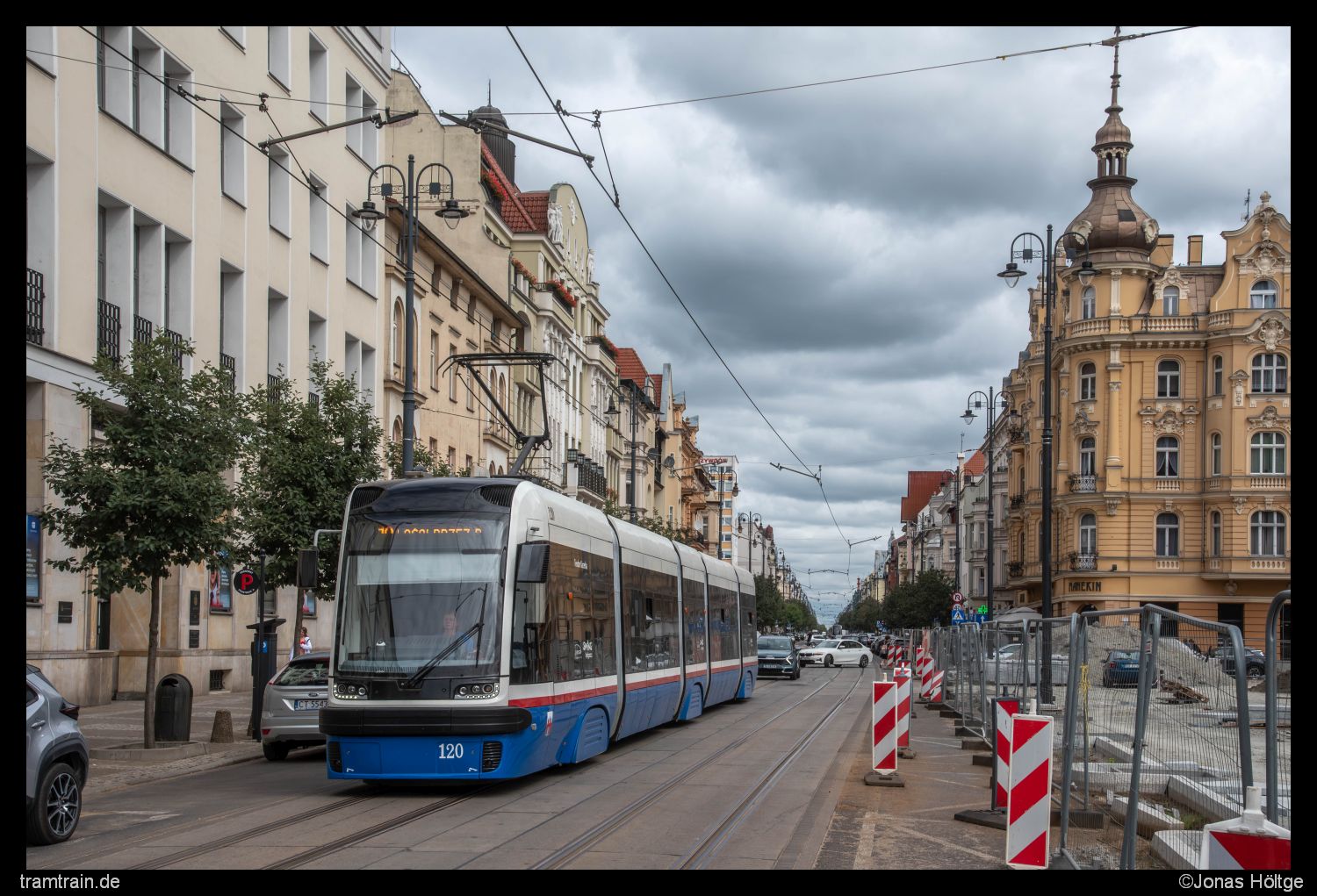 Nahe der Station Gdańska – Cieszkowskiego gelang mir ein Bild von Wagen 120. Auch hier deutete bis jetzt nichts auf Altwagen hin. Rechts neben mir befand sich die Kościół pw. św. Apostołów Piotra i Pawła. Normalerweise befindet sich davor ein hübscher Vorplatz, der einem die Möglichkeit bietet, etwas mehr von der Seite Bilder der Straßenbahn zu schießen. Der Platz befand sich jedoch im Umbau, sodass diese Möglichkeit entfiel.