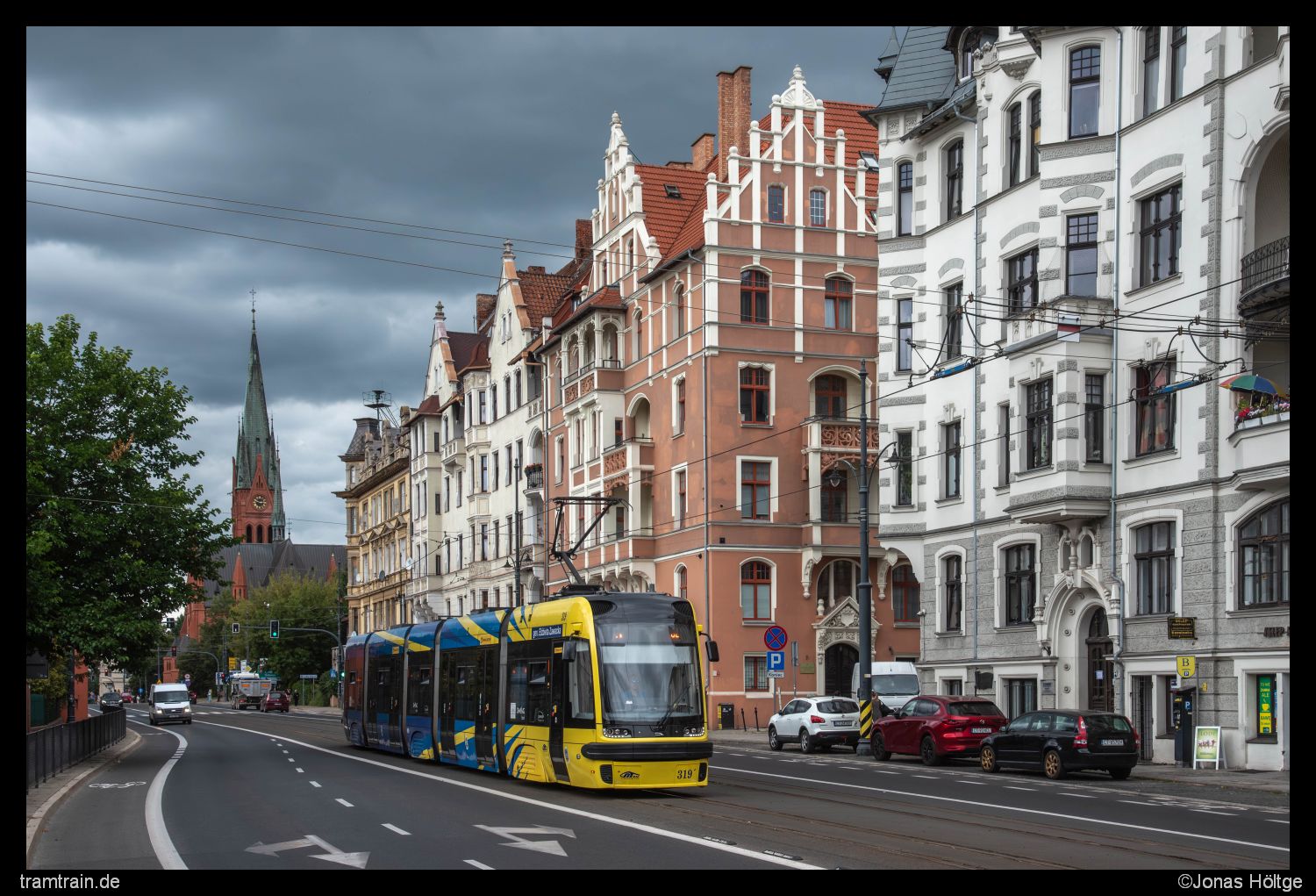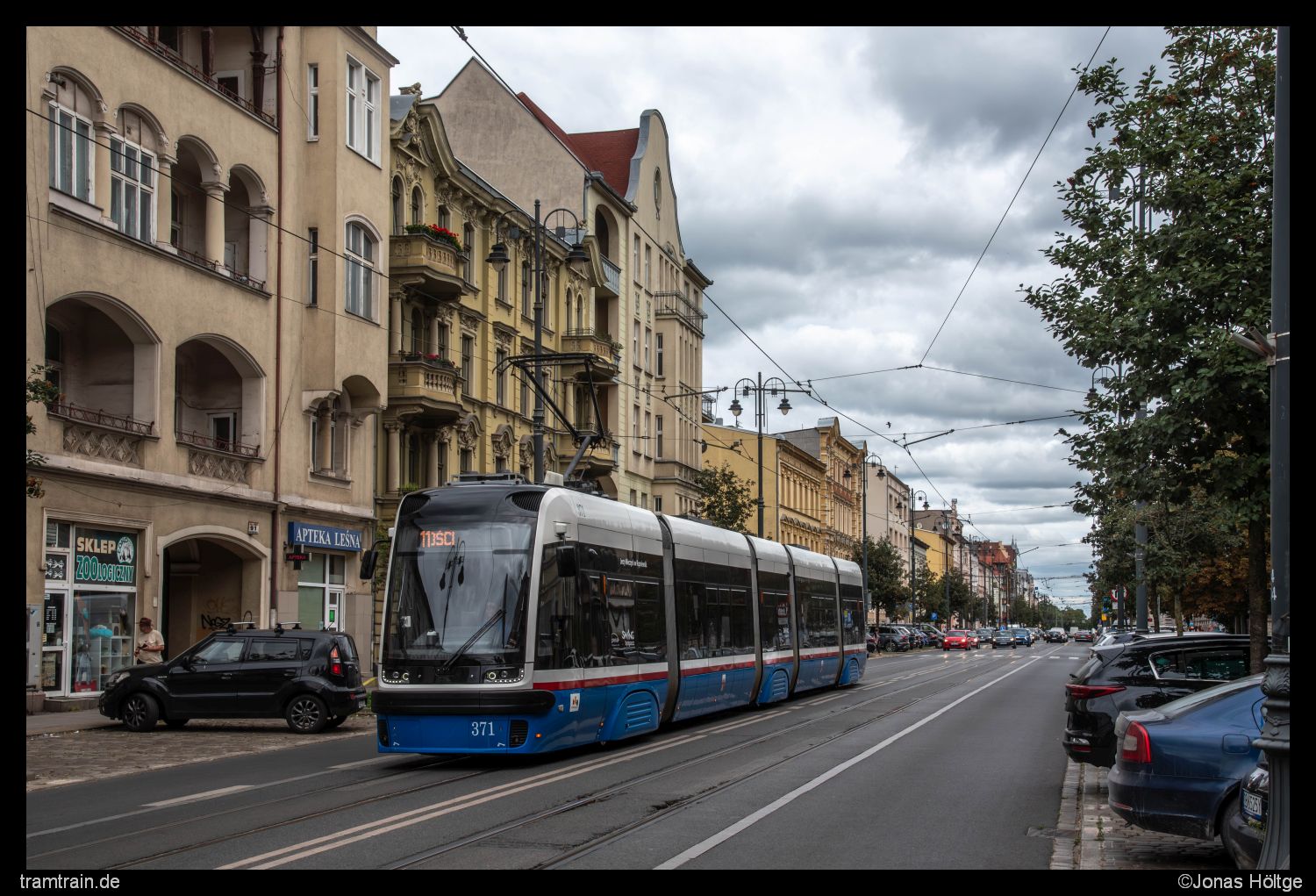 Mit der nächsten Bahn war ich bis zur Station Gdańska – Chodkiewicza gefahren. Von dort aus wollte ich die Straße, die von schönen Häuserfassaden gesäumt war, zu Fuß zurück bis zur Station Plac Praw Kobiet laufen. Häufig wurden die Straßenbahnen auf der viel befahrenen Straße von Autos zu gefahren. Bei dem dichten Takt auf der Straßenbahn gelang trotzdem ein Bild von Pesa 371 nahe der Station Gdańska – Chodkiewicza.